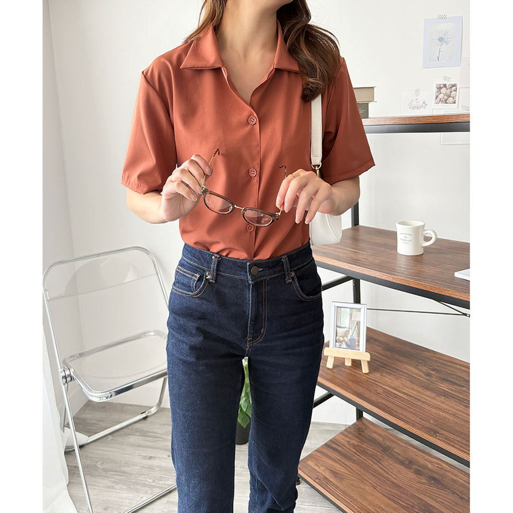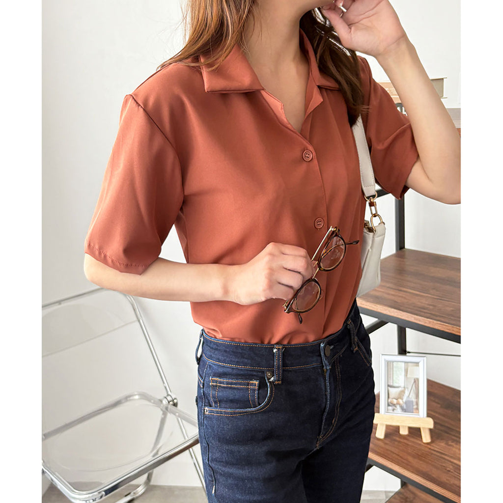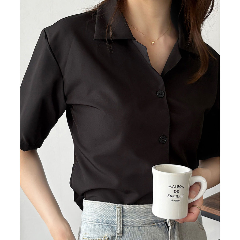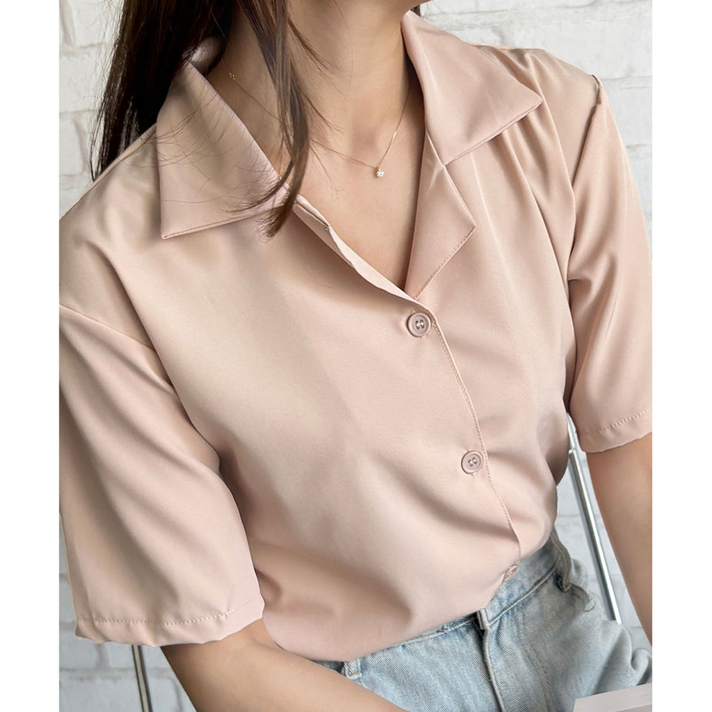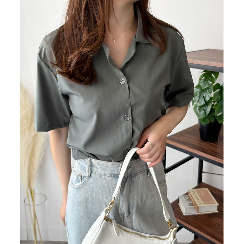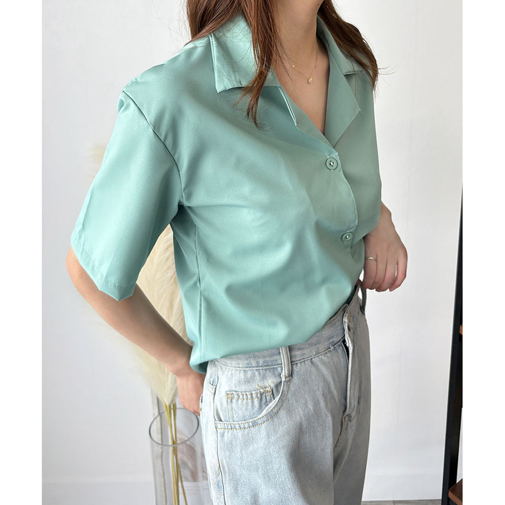 德威莉 Dewlily 開襟顏色短袖襯衫 女士 韓國 春夏 簡約 休閒 上衣 無圖案 時尚 成人 可愛 外出 上衣 涼爽 舒適