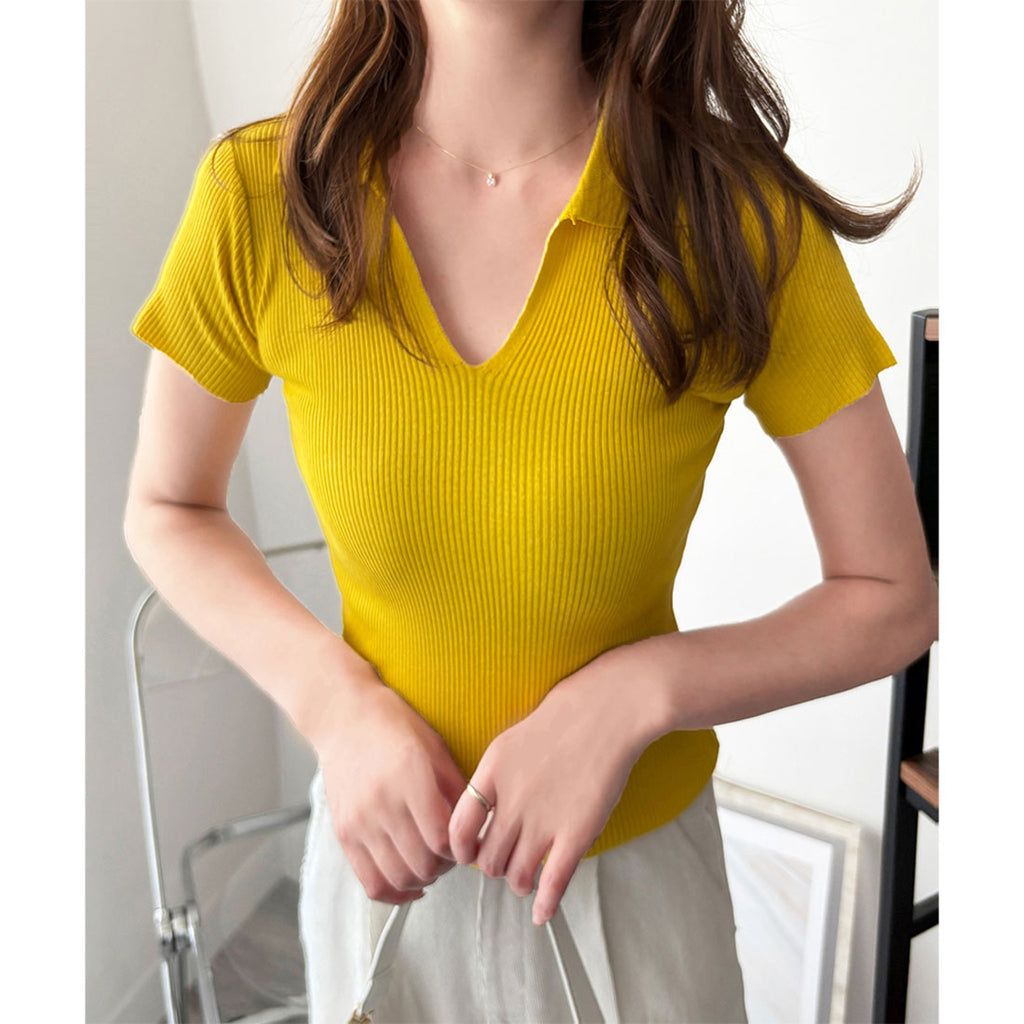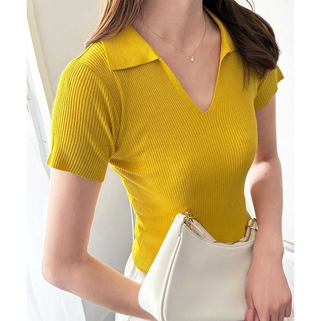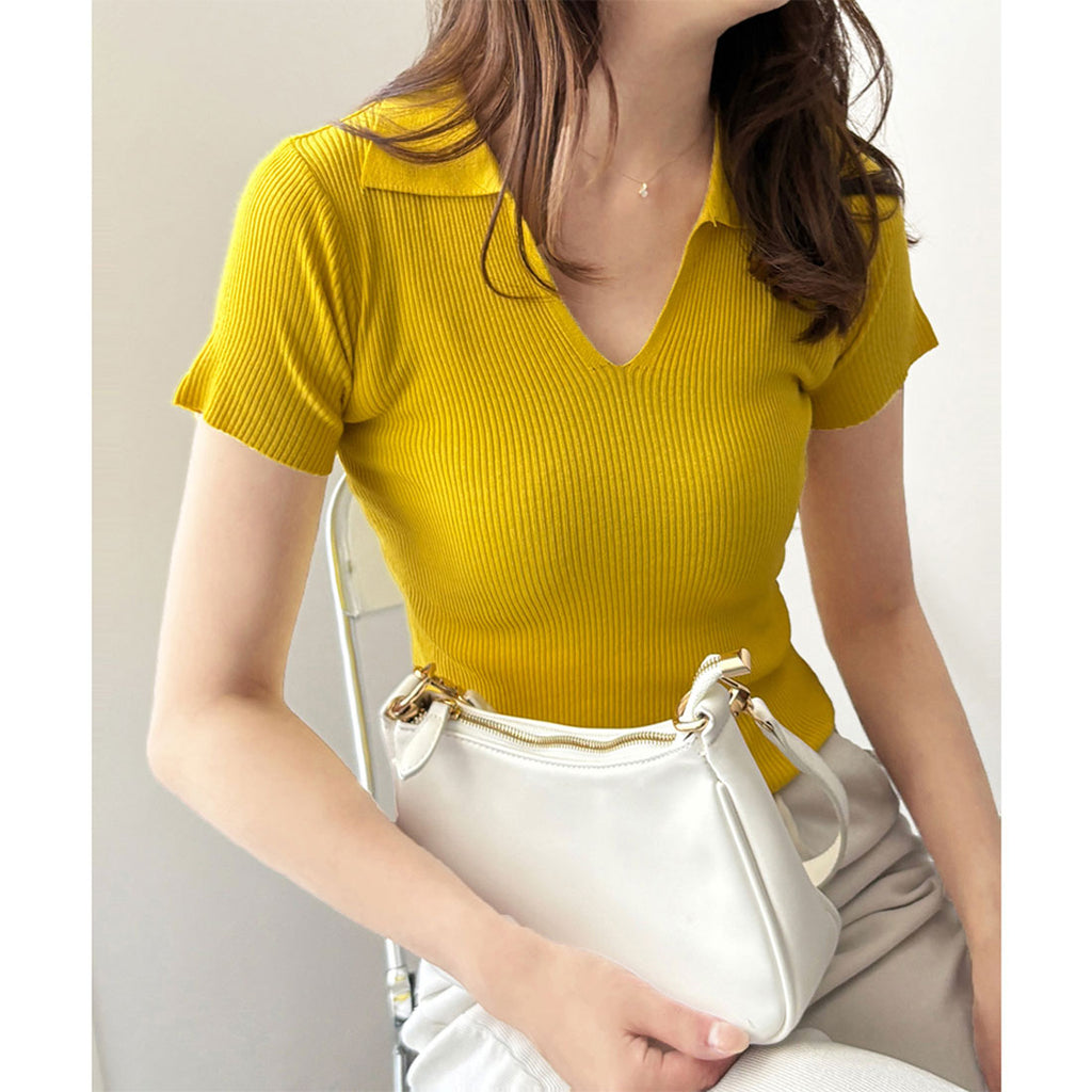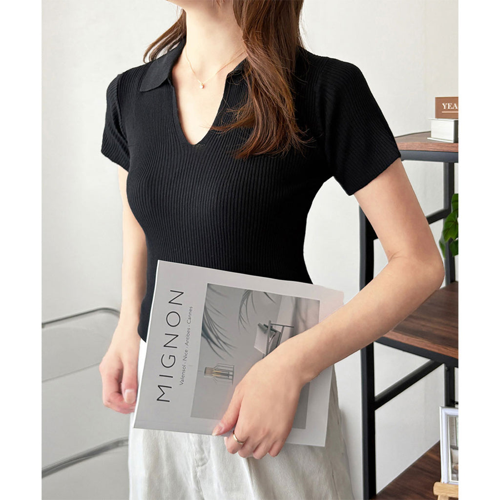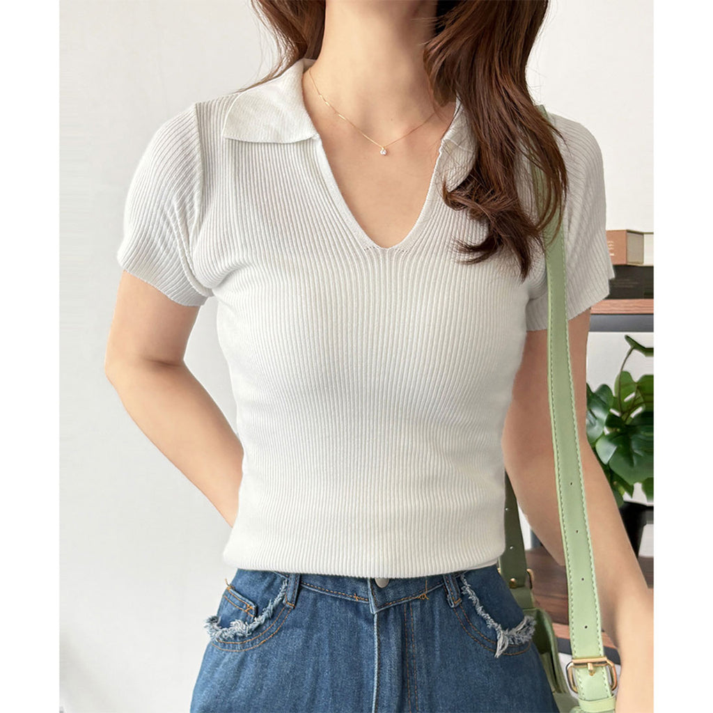 德威莉 Dewlily 開領短袖 Polo 針織 女士 韓國 休閒 簡約 短版 時尚 可愛 大人 春 夏 百搭 外出 上衣 襯衫