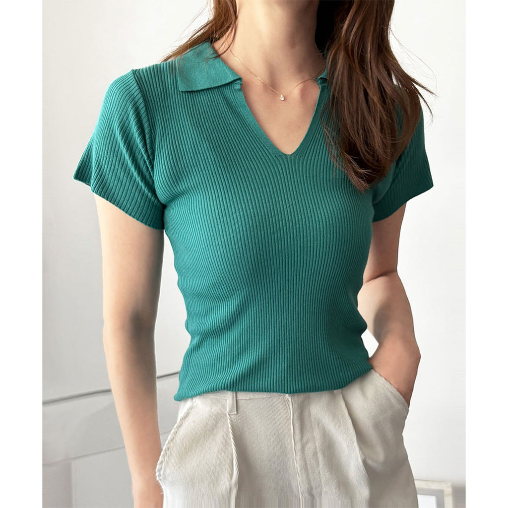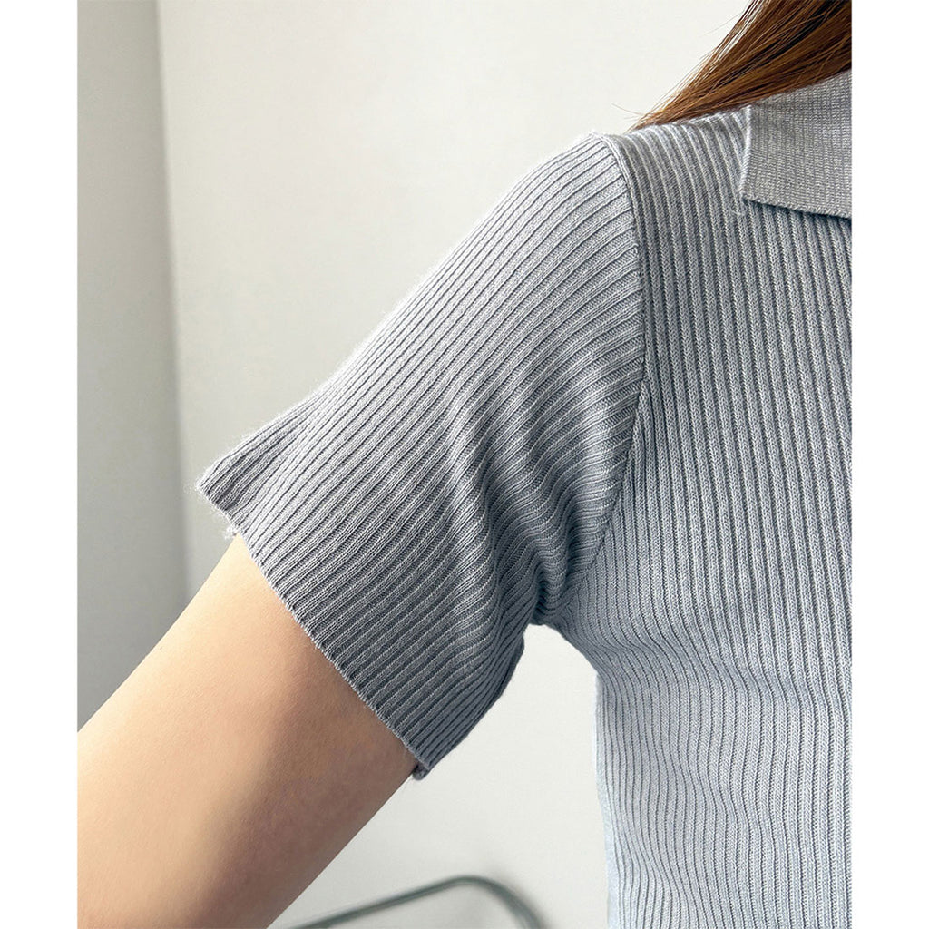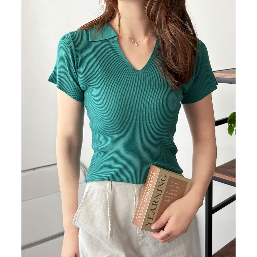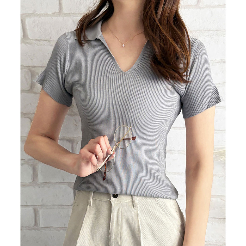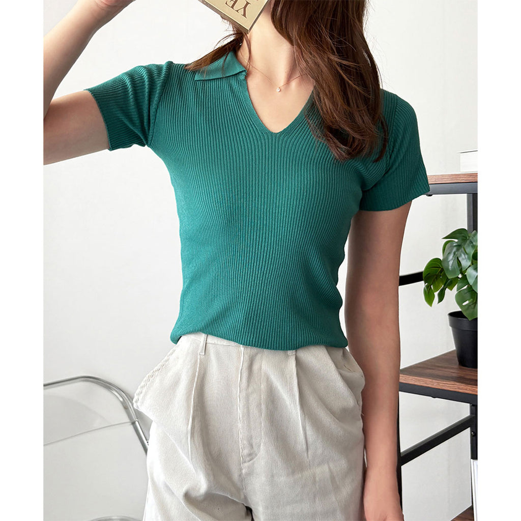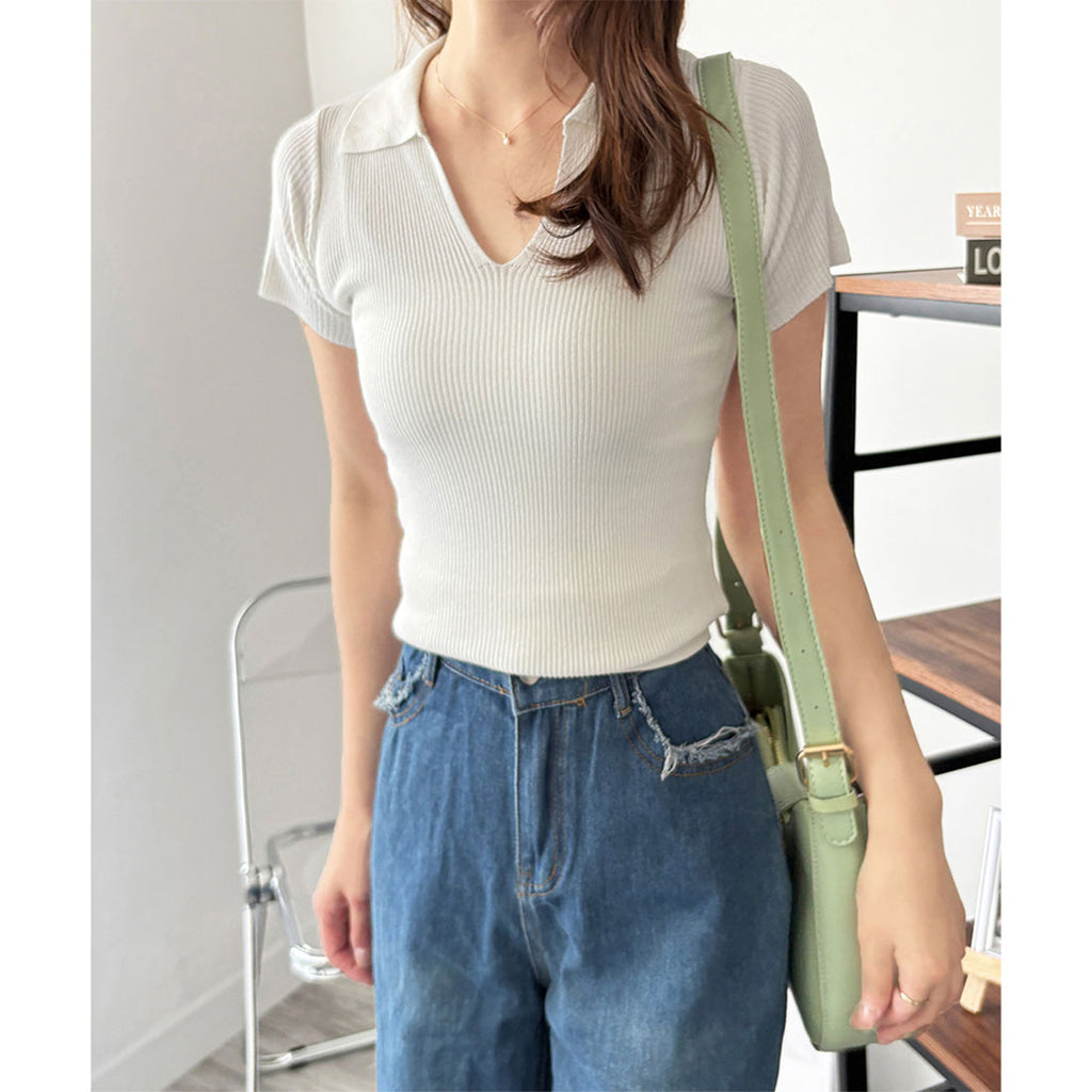 德威莉 Dewlily 開領短袖 Polo 針織 女士 韓國 休閒 簡約 短版 時尚 可愛 大人 春 夏 百搭 外出 上衣 襯衫