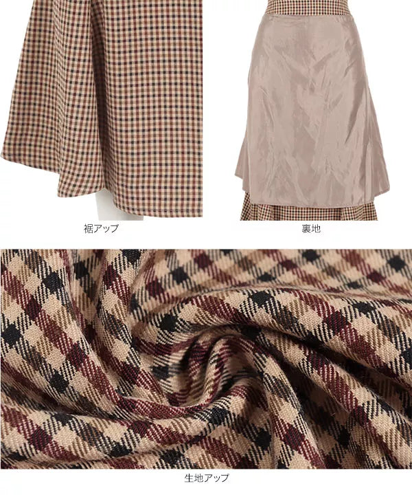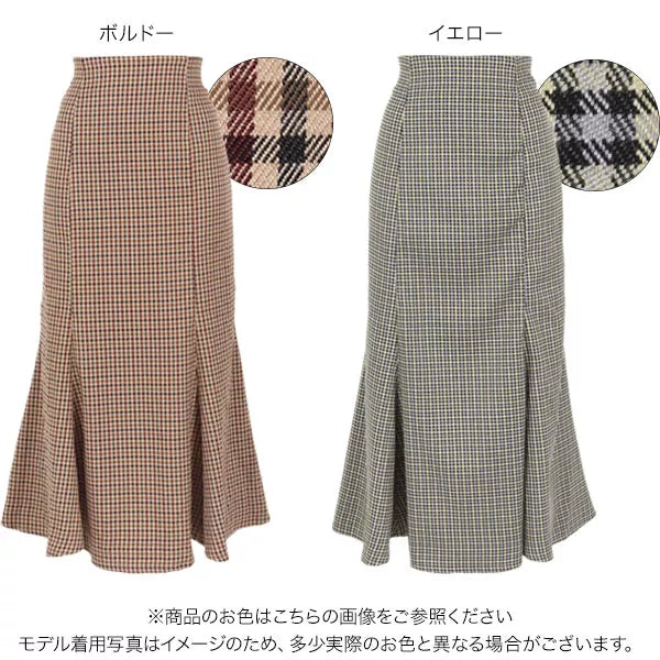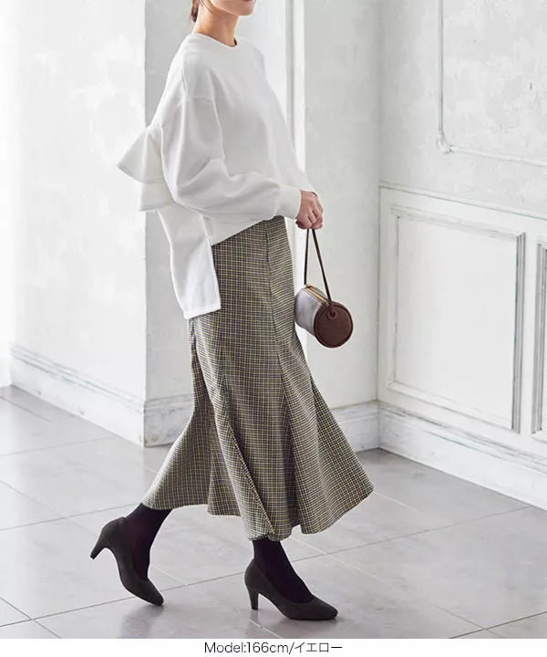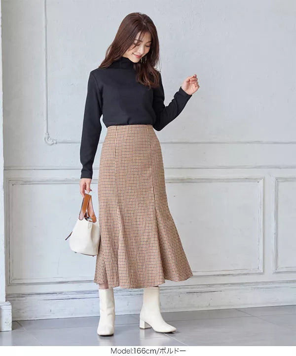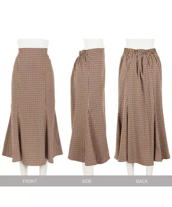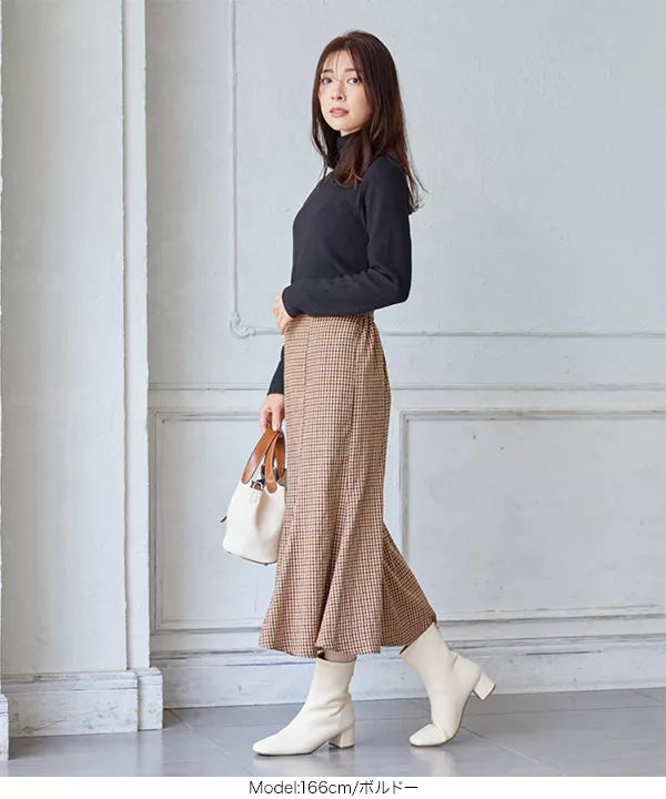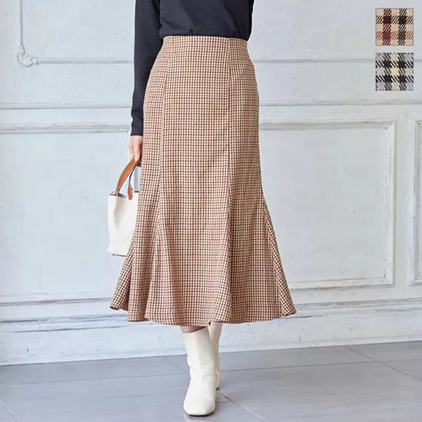 程よいハリ感のある素材。起毛感が少なく、小柄なイメージのチェックでシーズンを問わず着ていただけます。女性らしいシルエットのマーメイドシルエットですが、後ろゴムで着脱も着心地も楽ちんです◎。