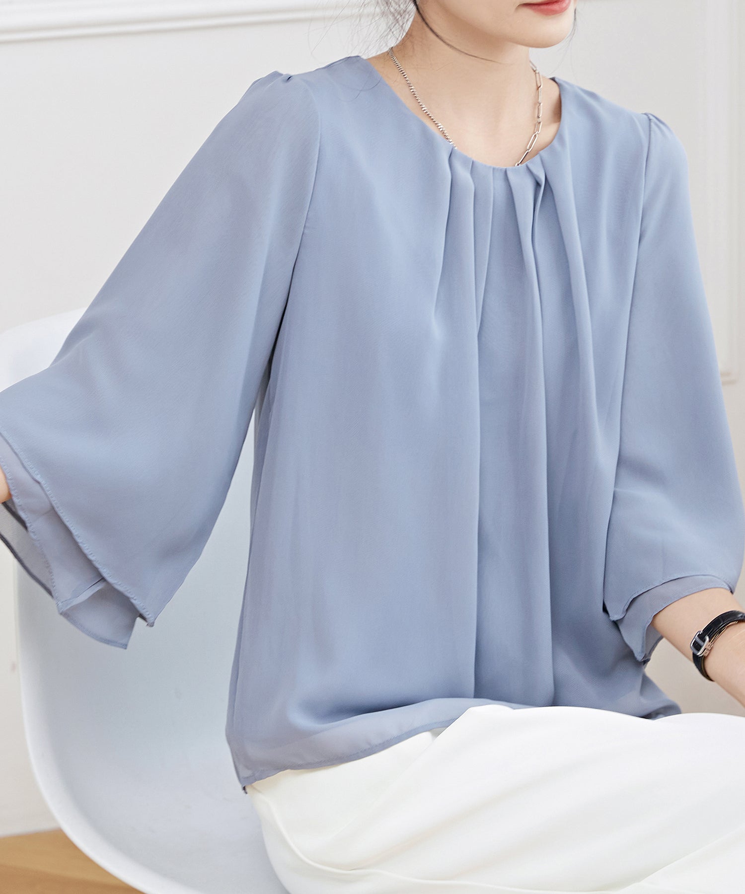 領口採用褶皺設計,增加立體感。