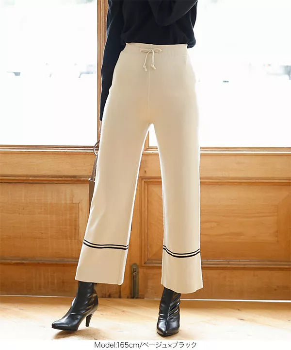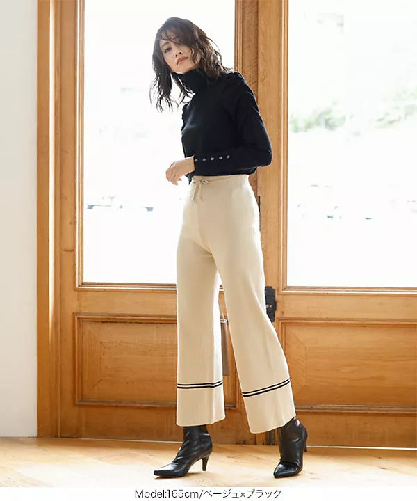 洗練された大人の雰囲気漂うニットパンツ。程よいフレア感で、脚長効果が期待できるスタイルUPなアイテムです。裾のラインがコーディネートのアクセントに。ニットパンツは、ニットトップスでも合わせやすく、トレンドライクでこなれ感を、出せるのが嬉しいポイント。