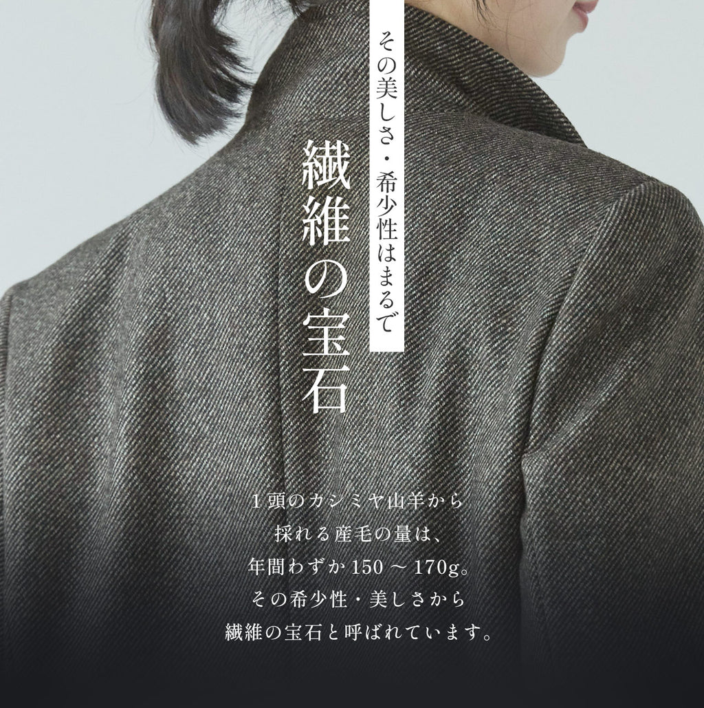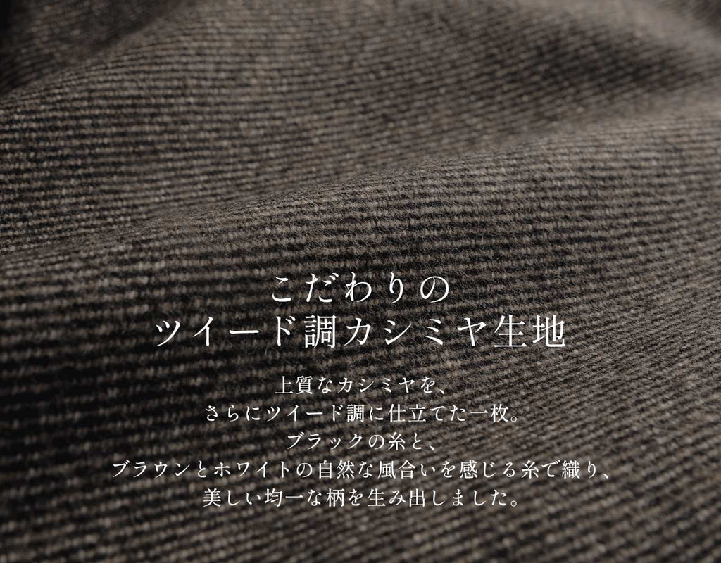 這件是將這種開司米進一步製成呢料風格的布料。用黑色的線和棕色與白色的自然質感線織成,創造出美麗均勻的圖案。