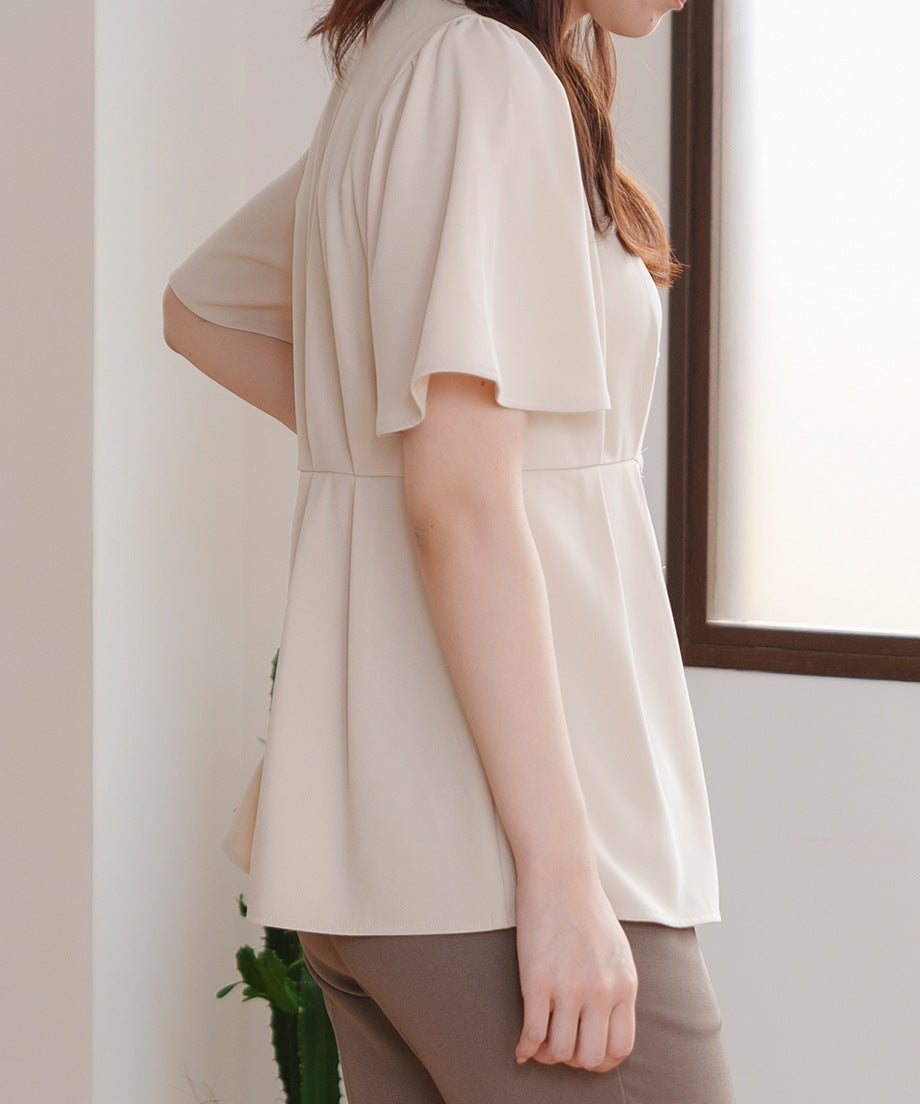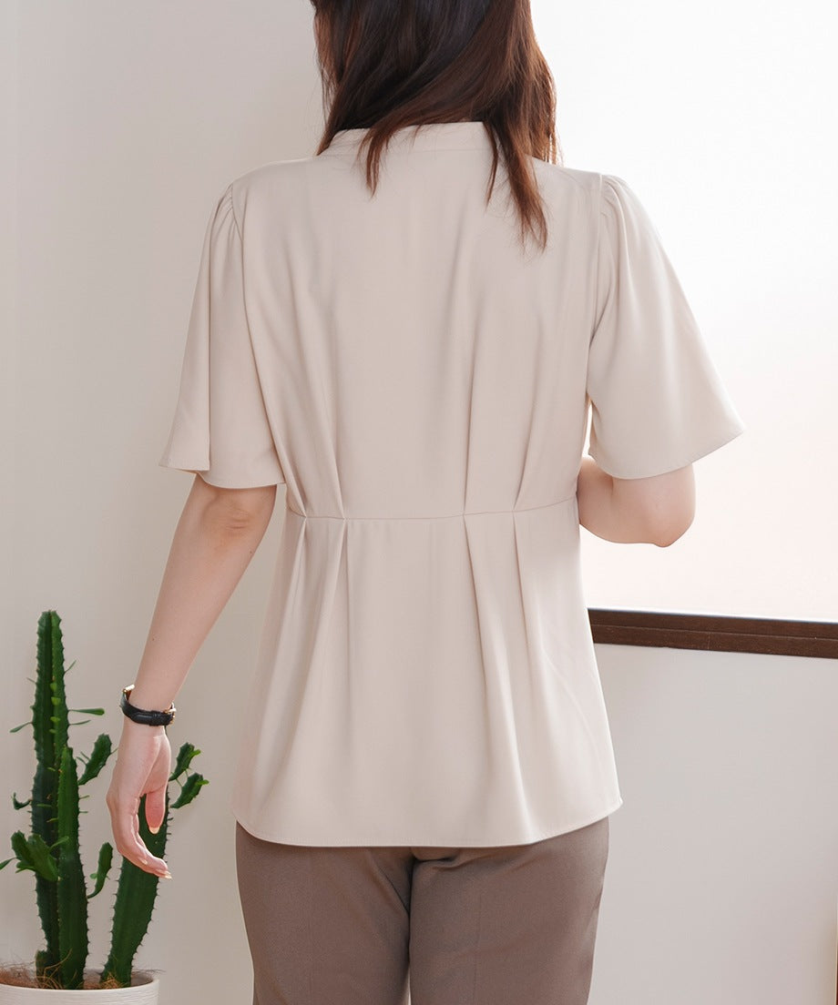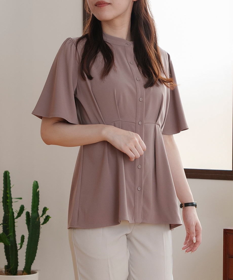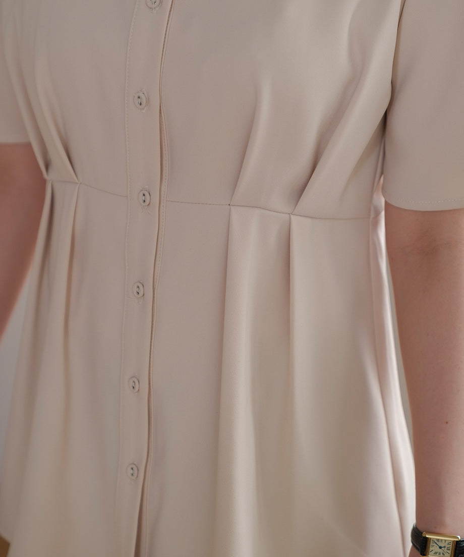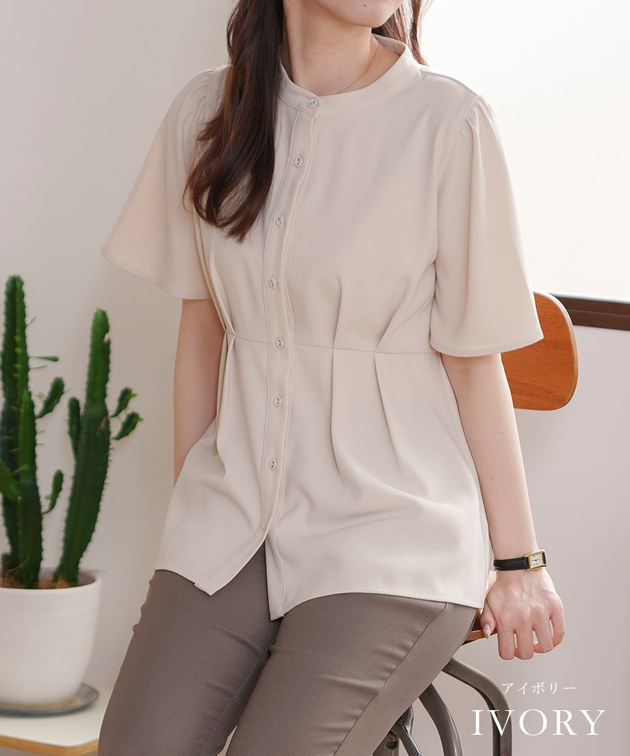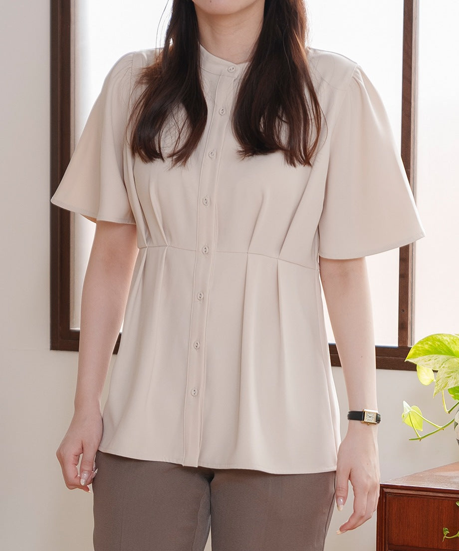 象牙色和粉棕色的成人可愛色彩展開的腰部摺褶襯衫。