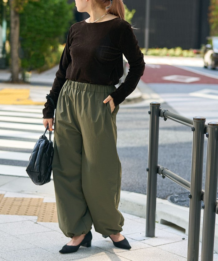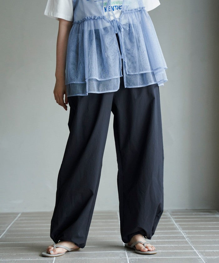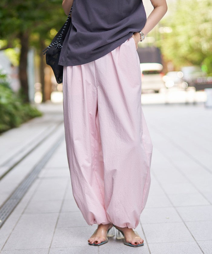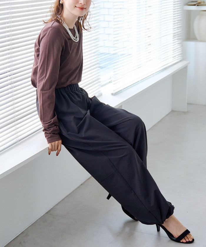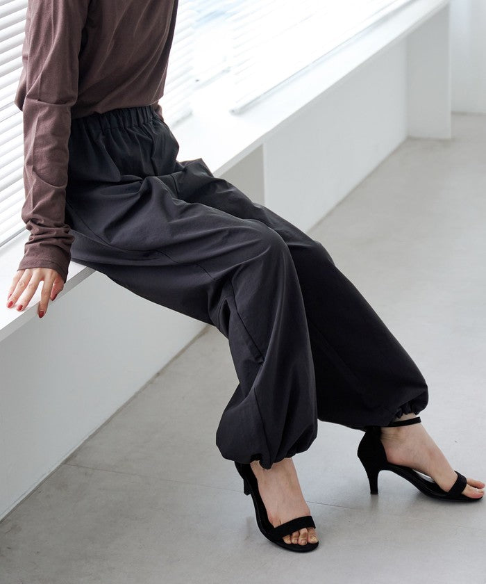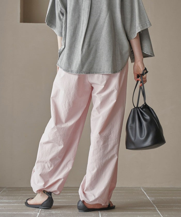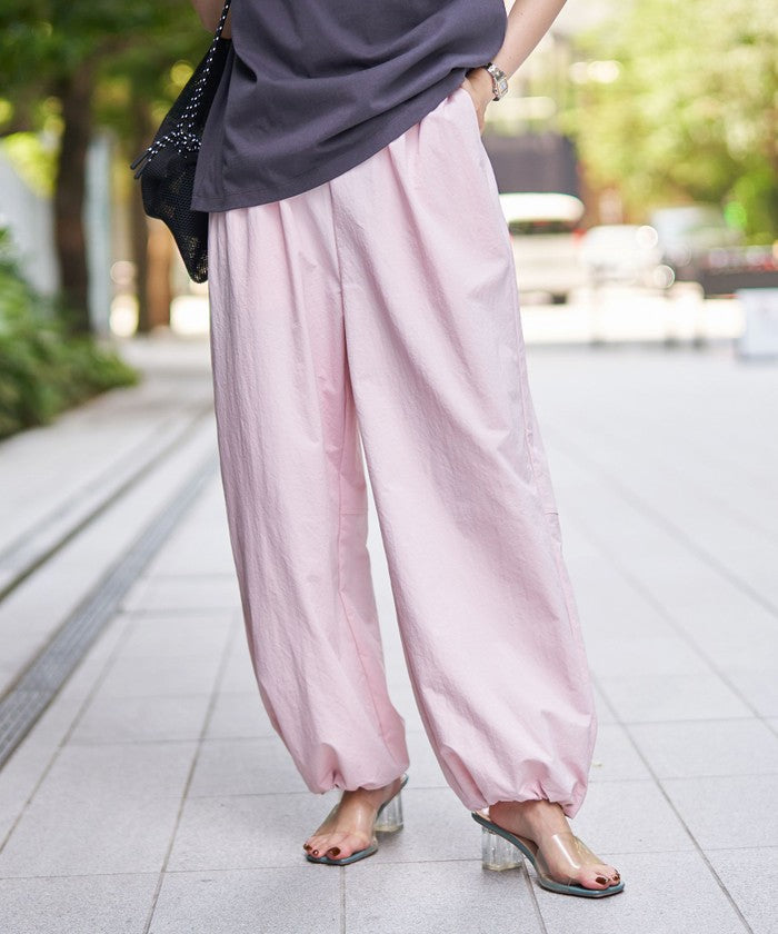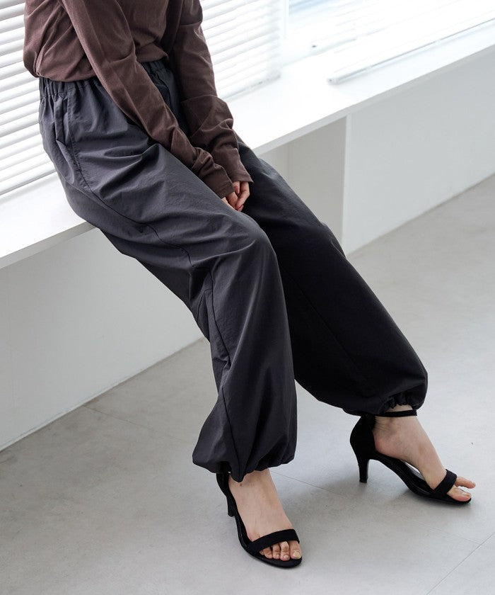 褲腳配有抽繩,收緊後可變換成具有趨勢感的降落傘褲風格的氣球褲輪廓。