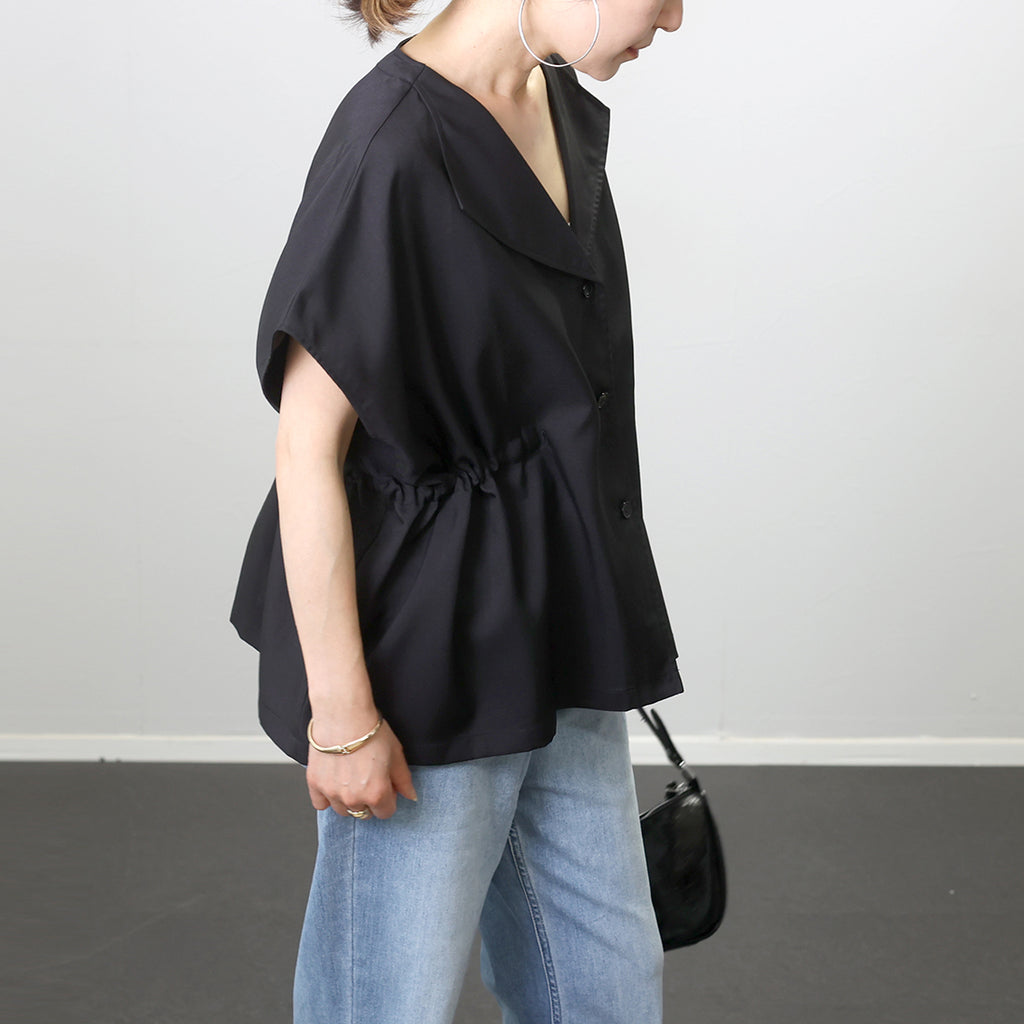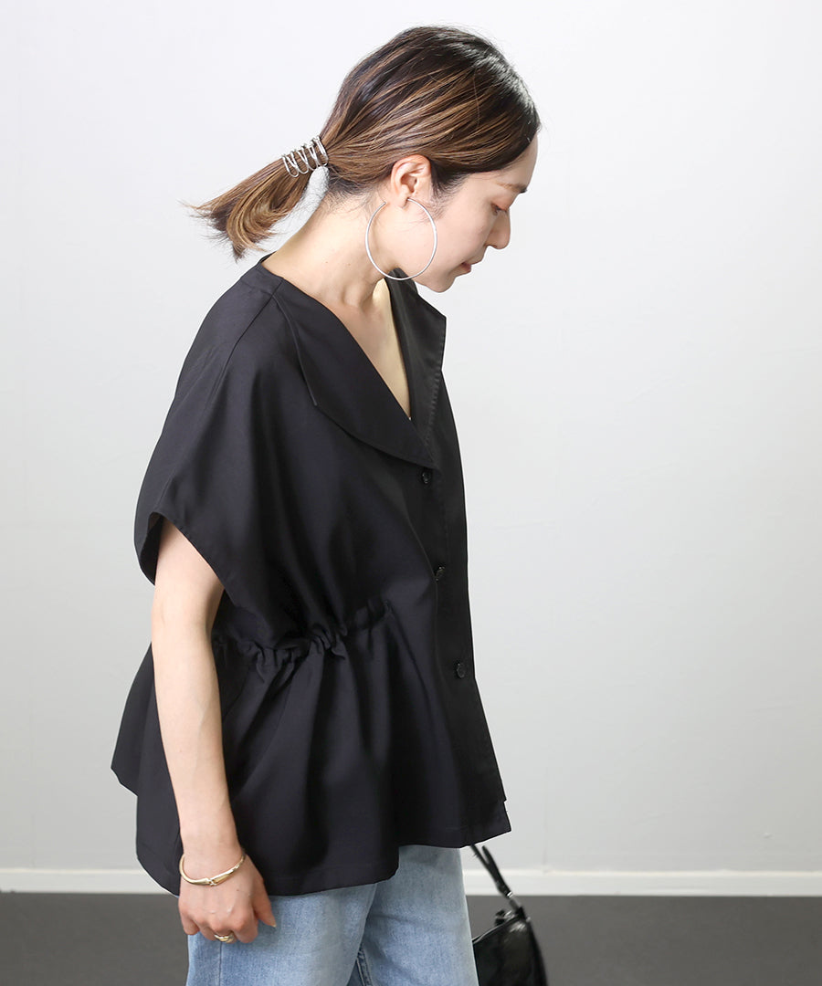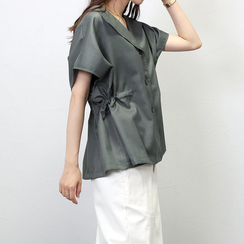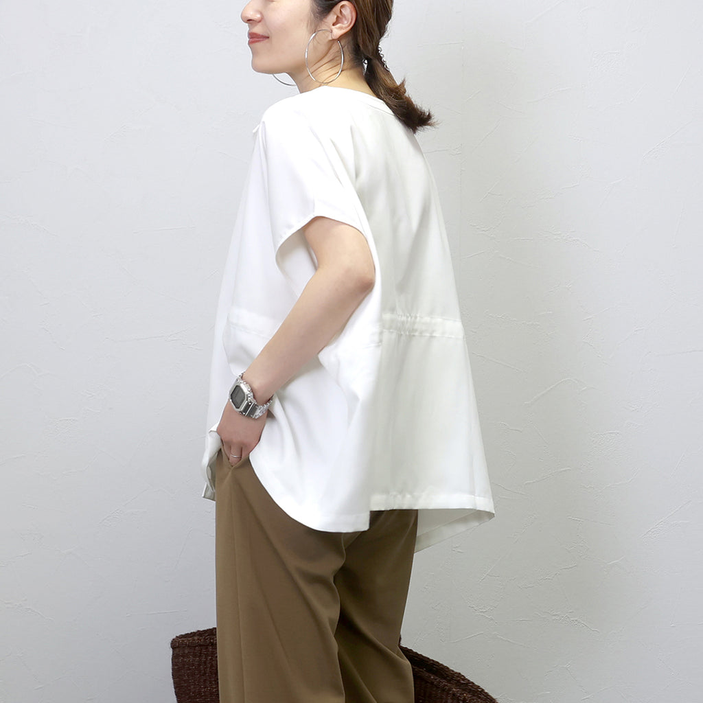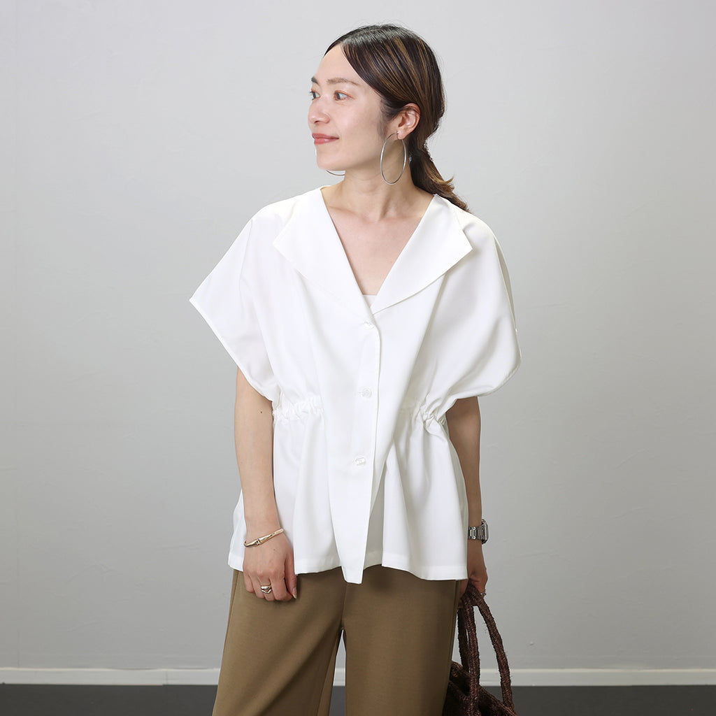 以襯衫為主角的可調整輪廓的抽繩襯衫。寬鬆的寬版襯衫不會勾勒出身體線條,穿著舒適。使用了大量面料的寬身設計,讓穿著感覺輕鬆自在,並且能夠巧妙地掩蓋令人擔心的腹部。腰部配有可調整的抽繩,拉緊後可變成勾勒出X型線條的聚攏襯衫。華麗感大幅提升,展現出女性的氛圍。您可以根據喜好和下身搭配享受不同的輪廓。領口設計為清爽的開領樣式。銳利的V型線條和適度的肌膚展露,平衡地展現出輕鬆感和整潔感。存在感十足的大領子也能期待有小臉效果。這是一款推薦給成年人的夏季風格,適合上班和休閒兩用的襯衫。