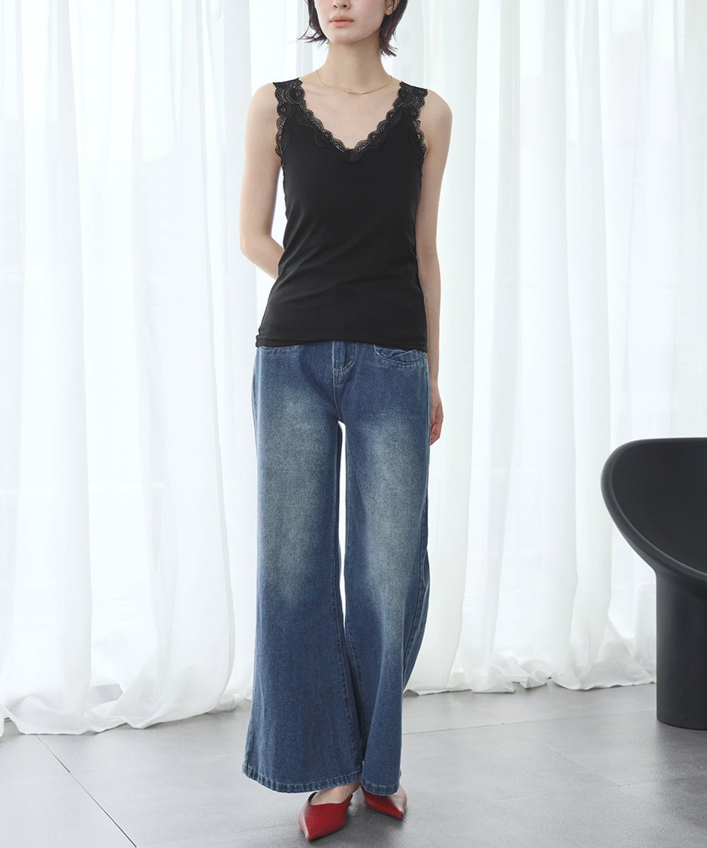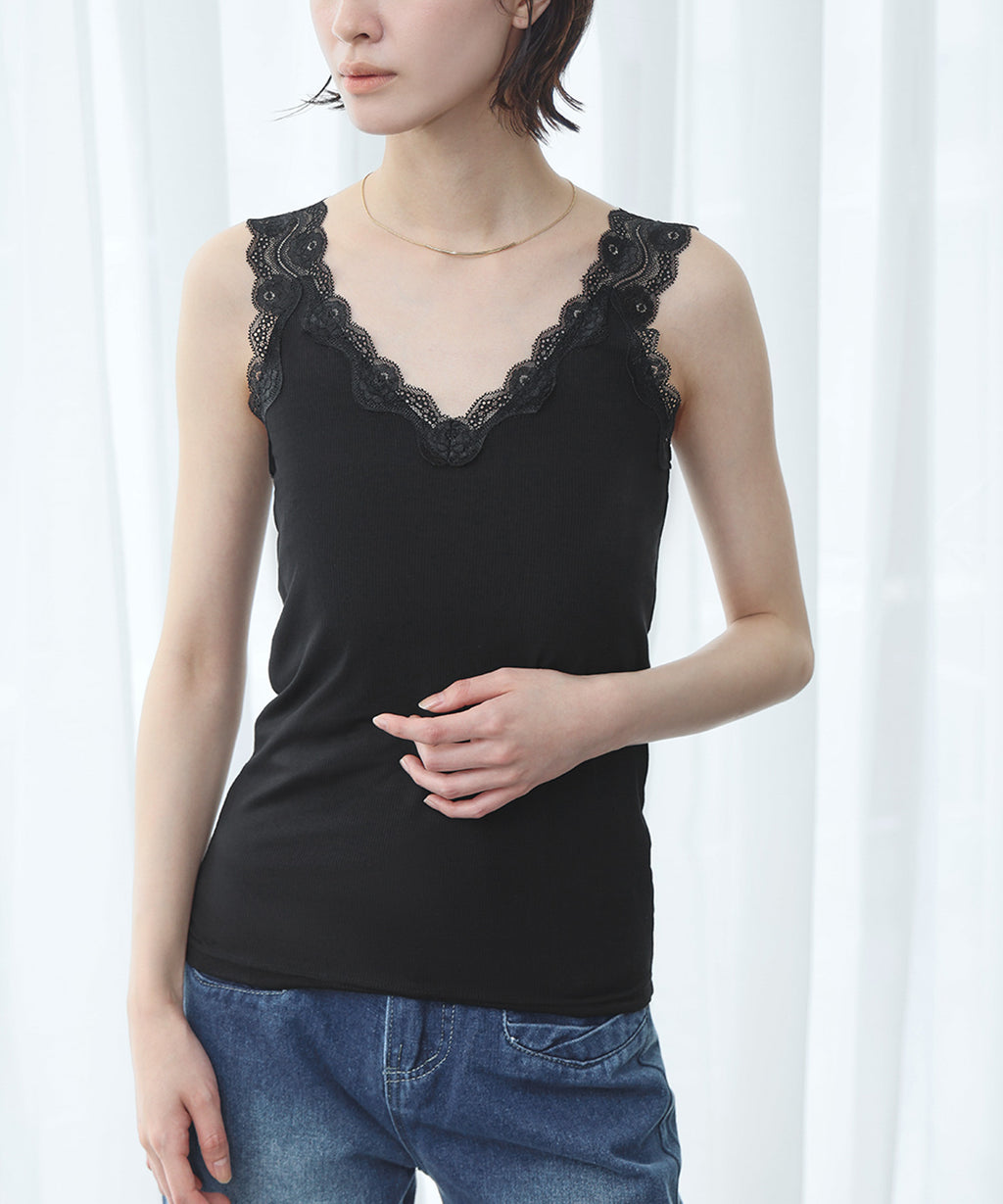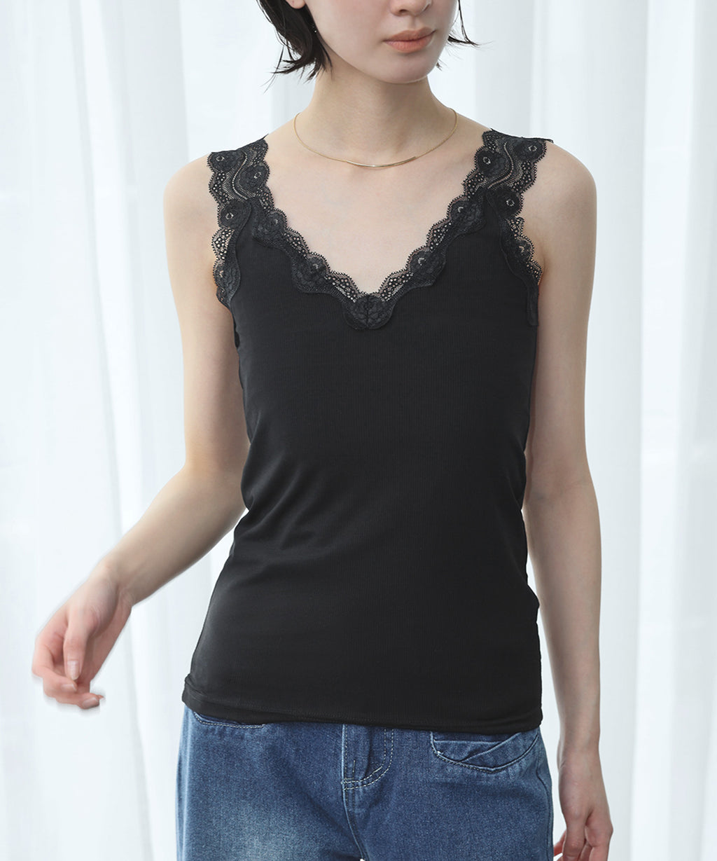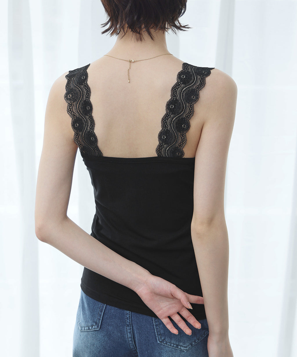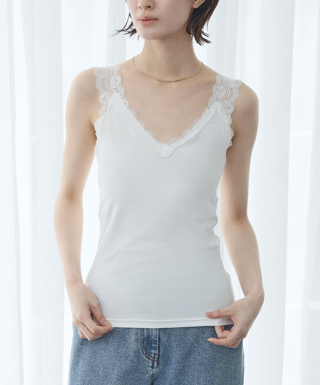 以精緻蕾絲裝飾的胸前設計為特色的背心。