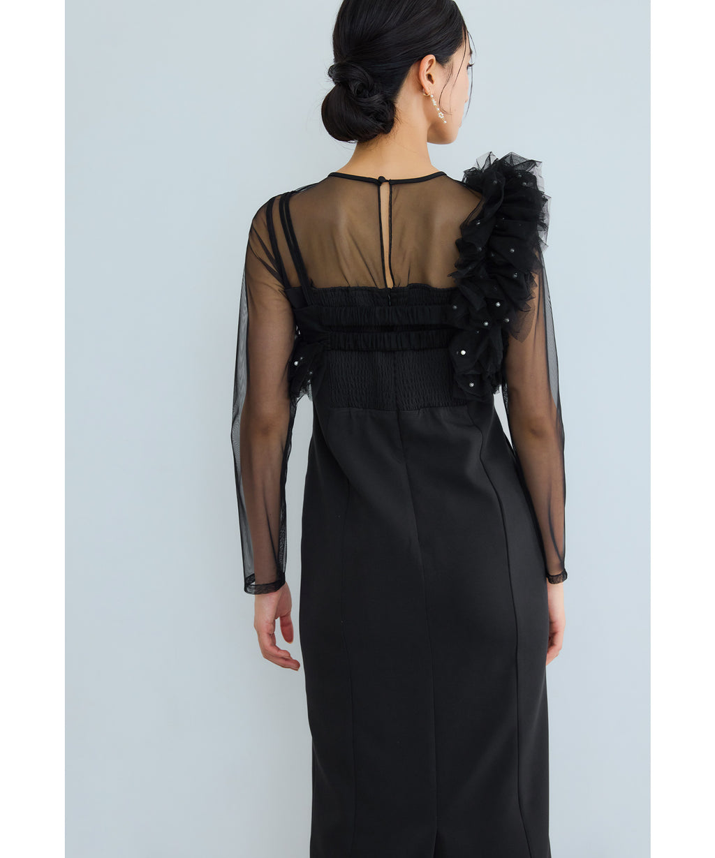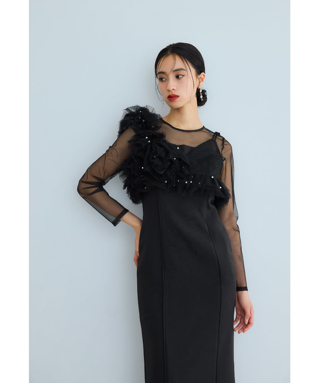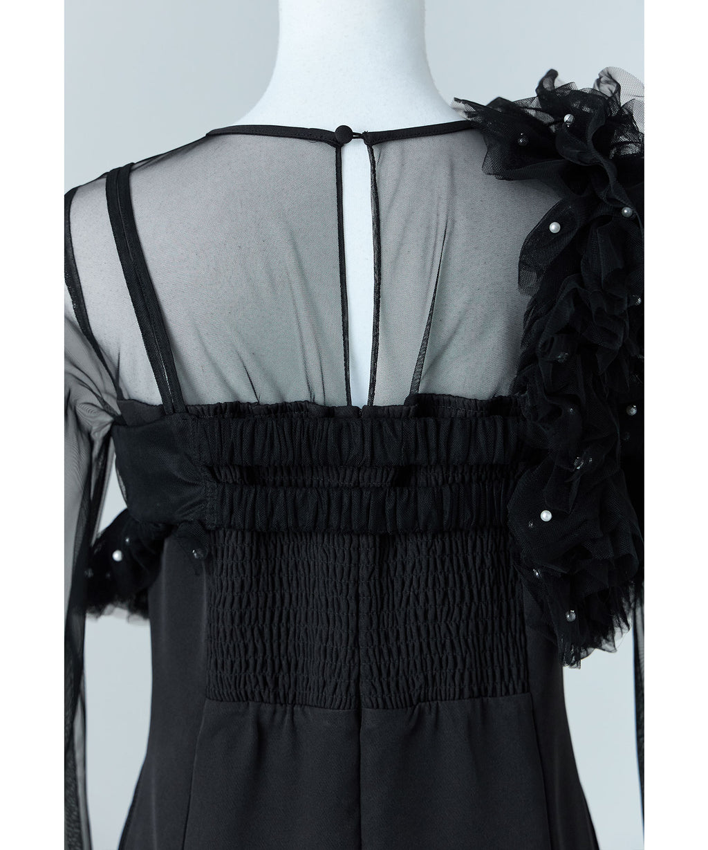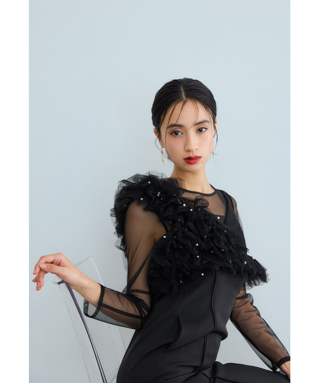 從肩膀到袖子部分切換為透視感美麗的薄紗,與胸衣也容易搭配。