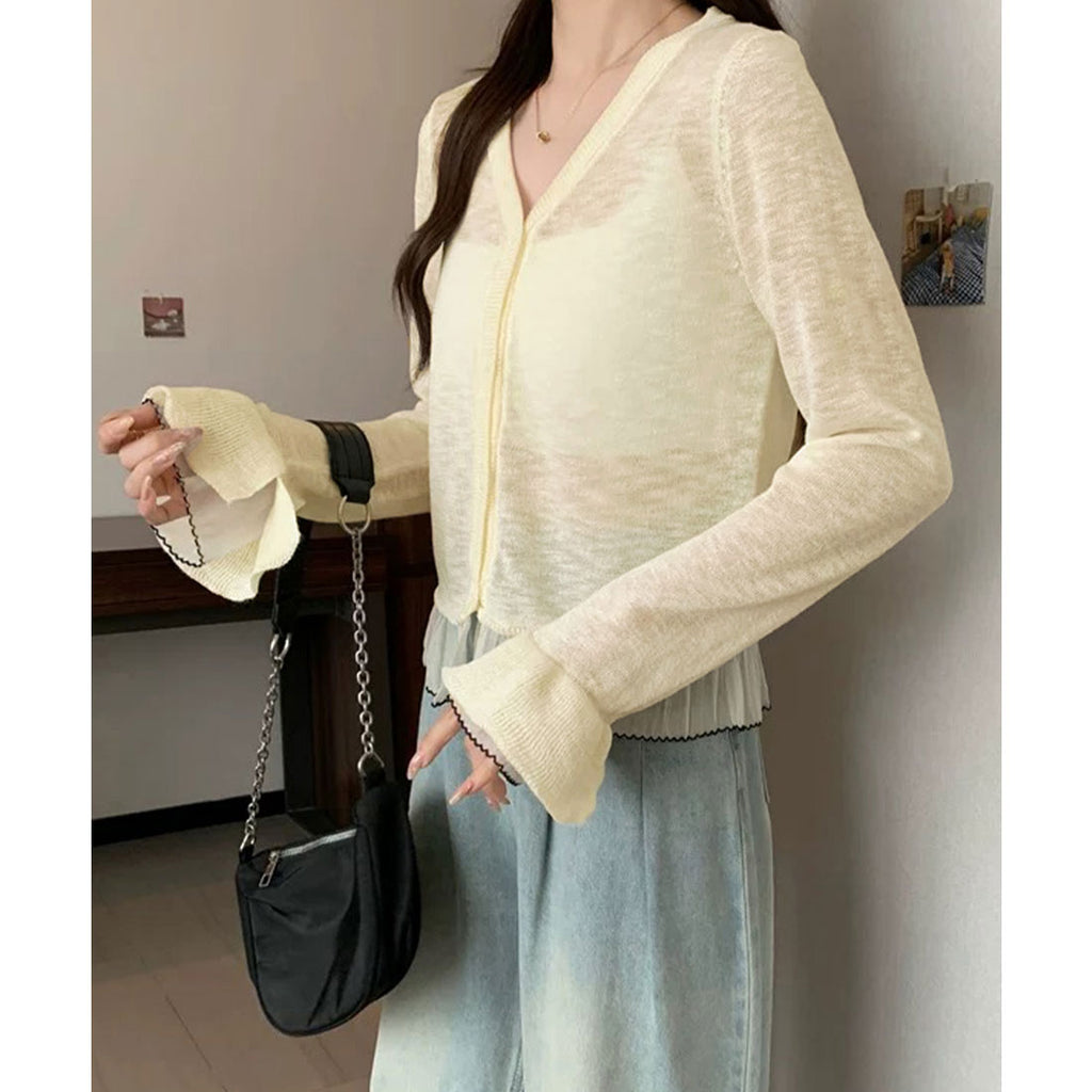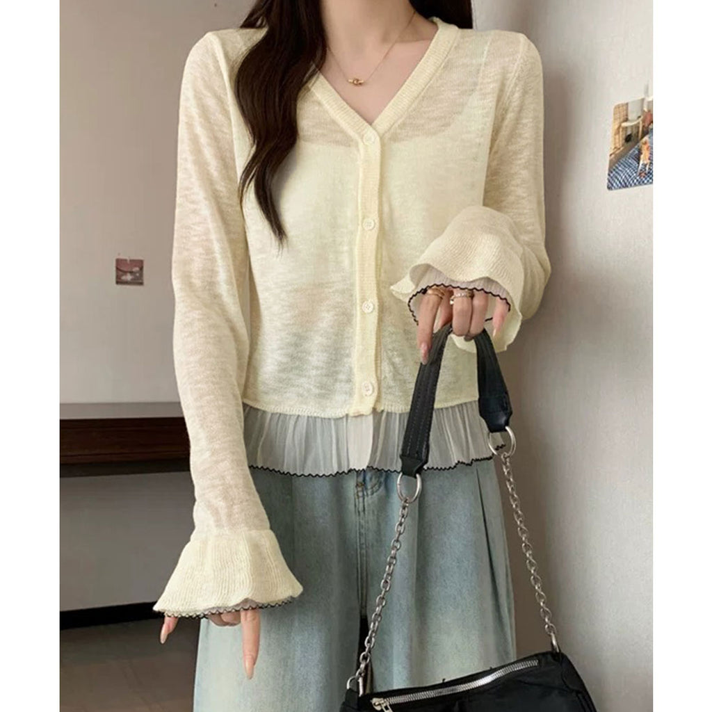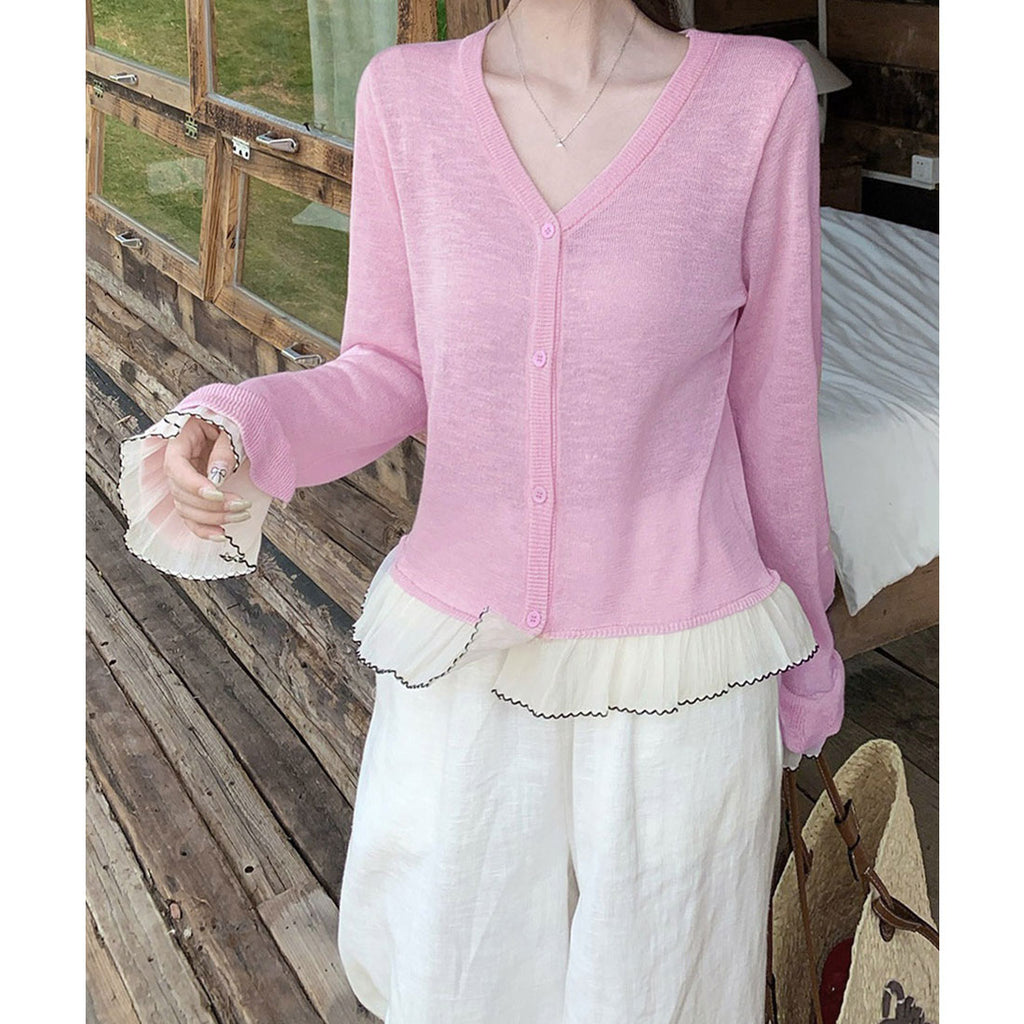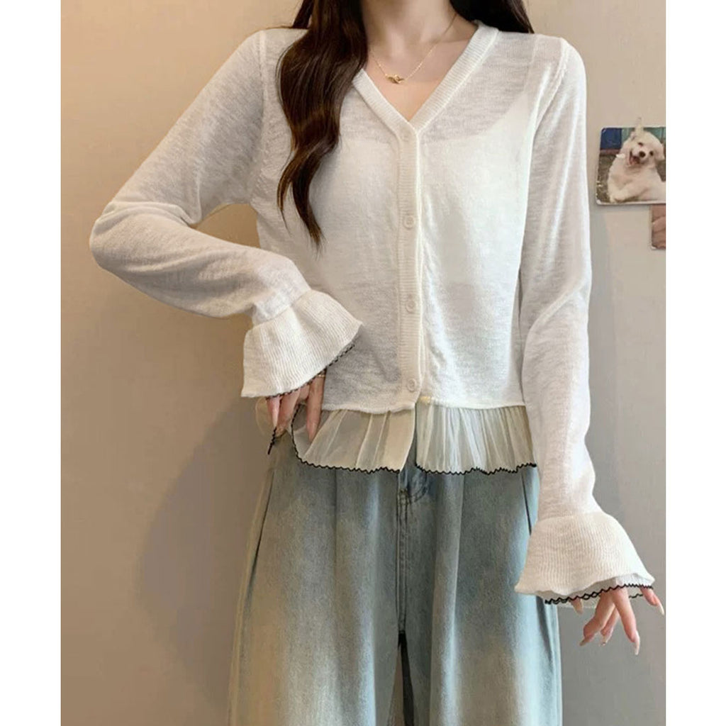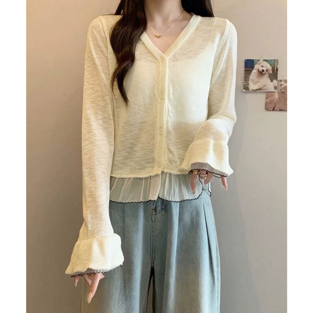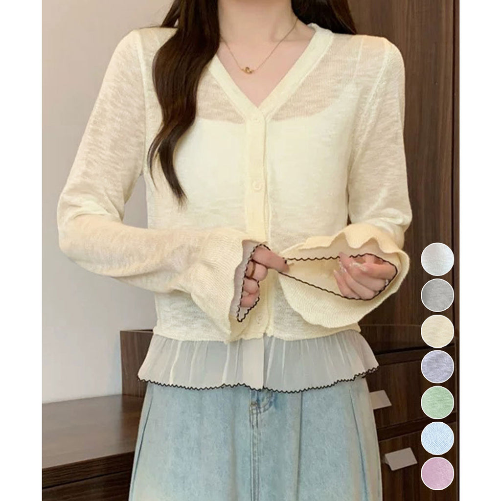 可愛大方的透視針織衫,女款,荷葉邊袖子,適合通學通勤夏季針織上衣,防紫外線外套,韓國風