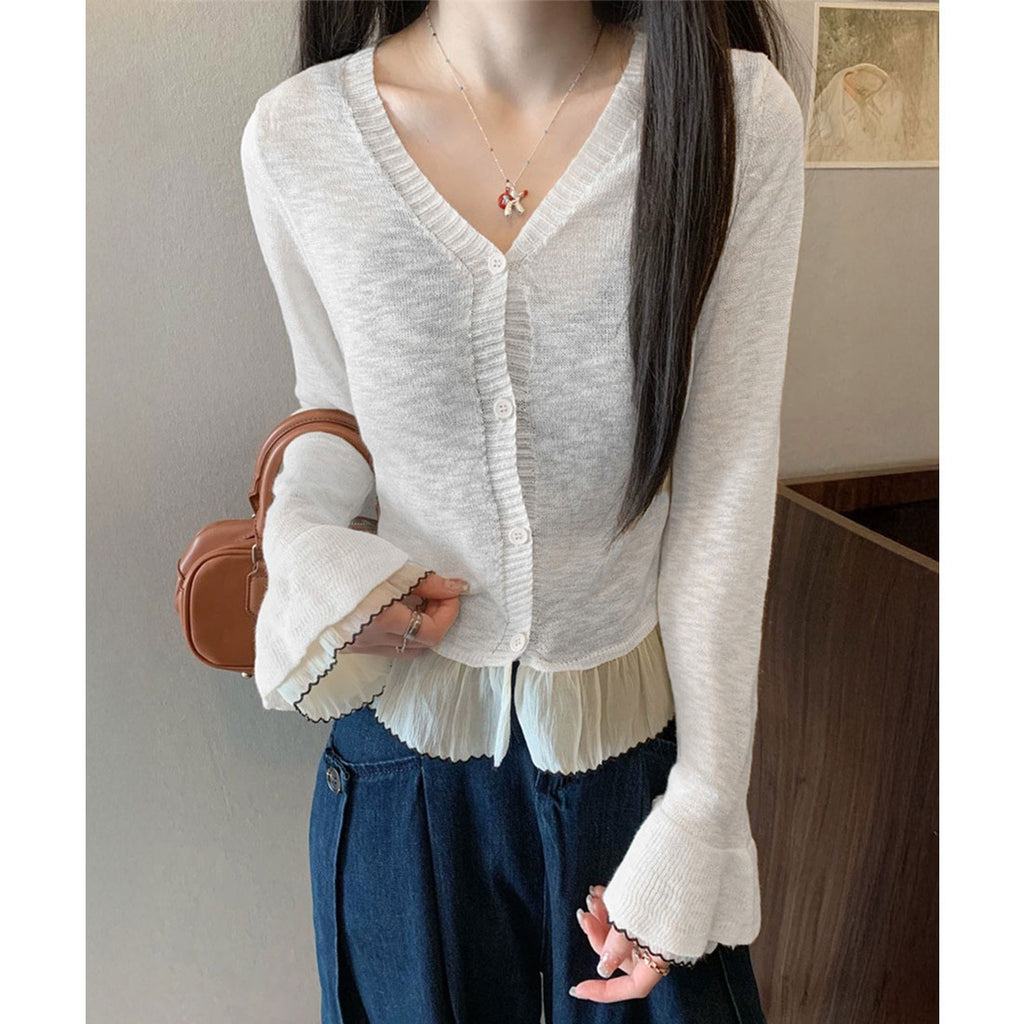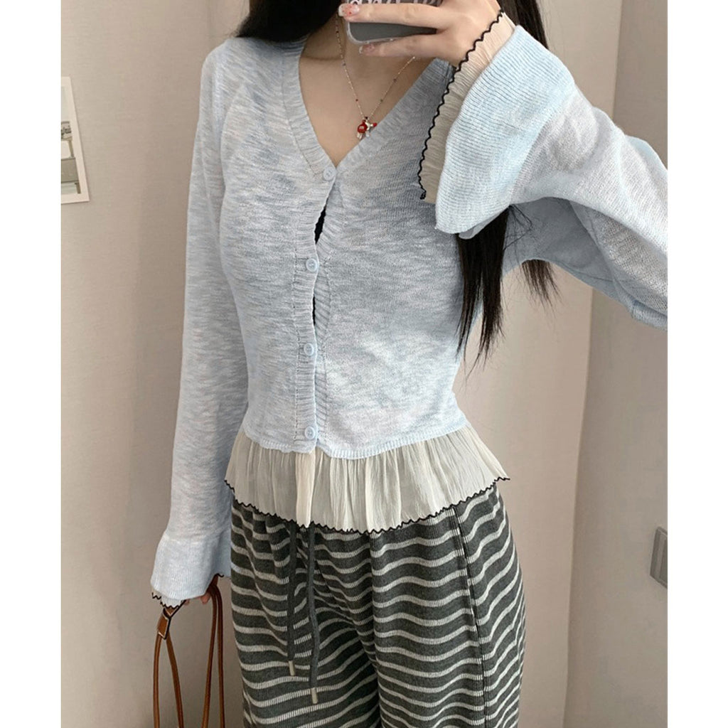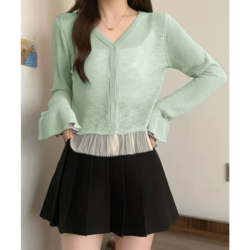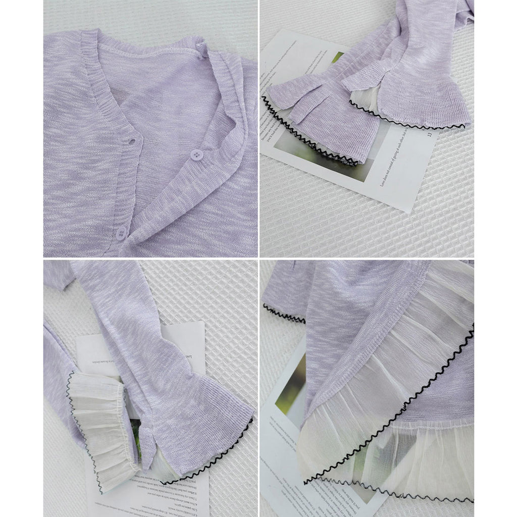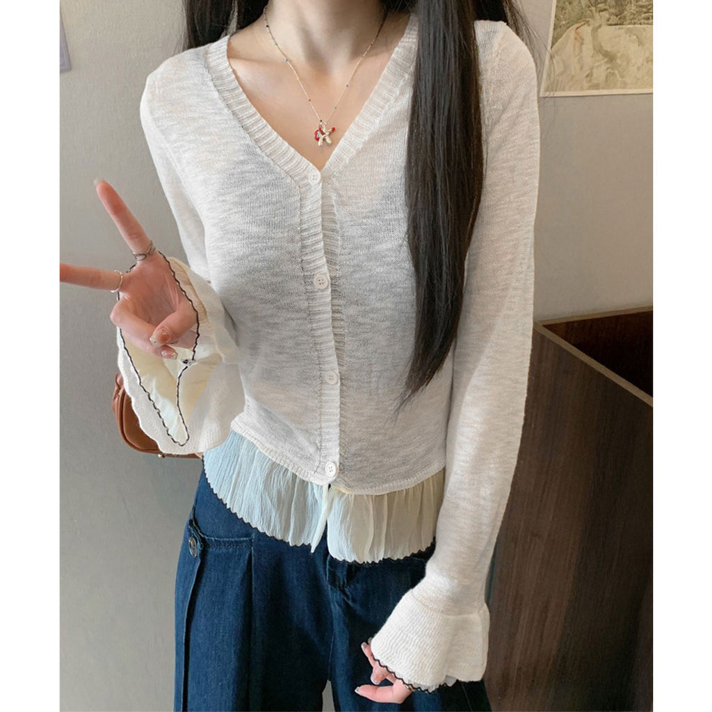 可愛大方的透視針織衫,女款,荷葉邊袖子,適合通學通勤夏季針織上衣,防紫外線外套,韓國風