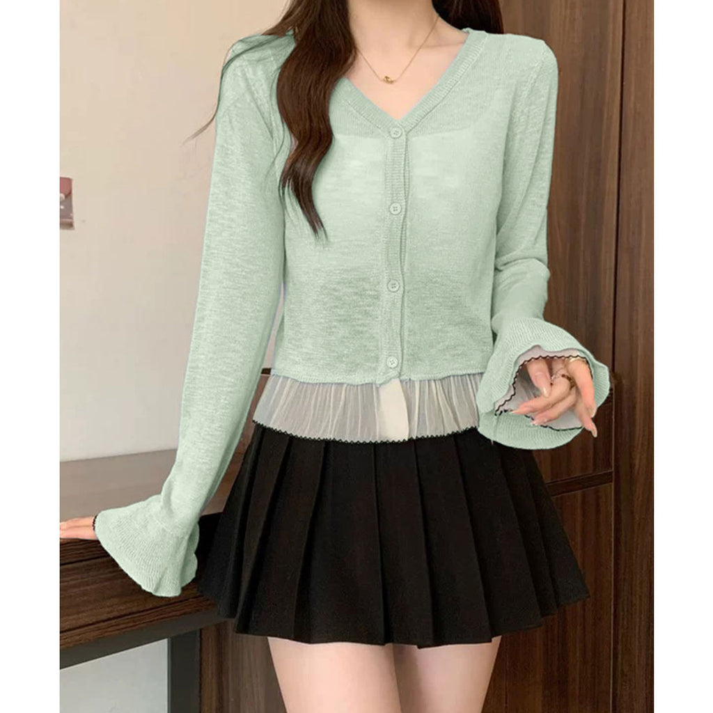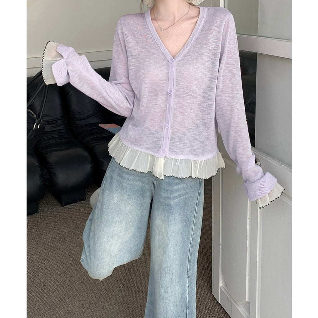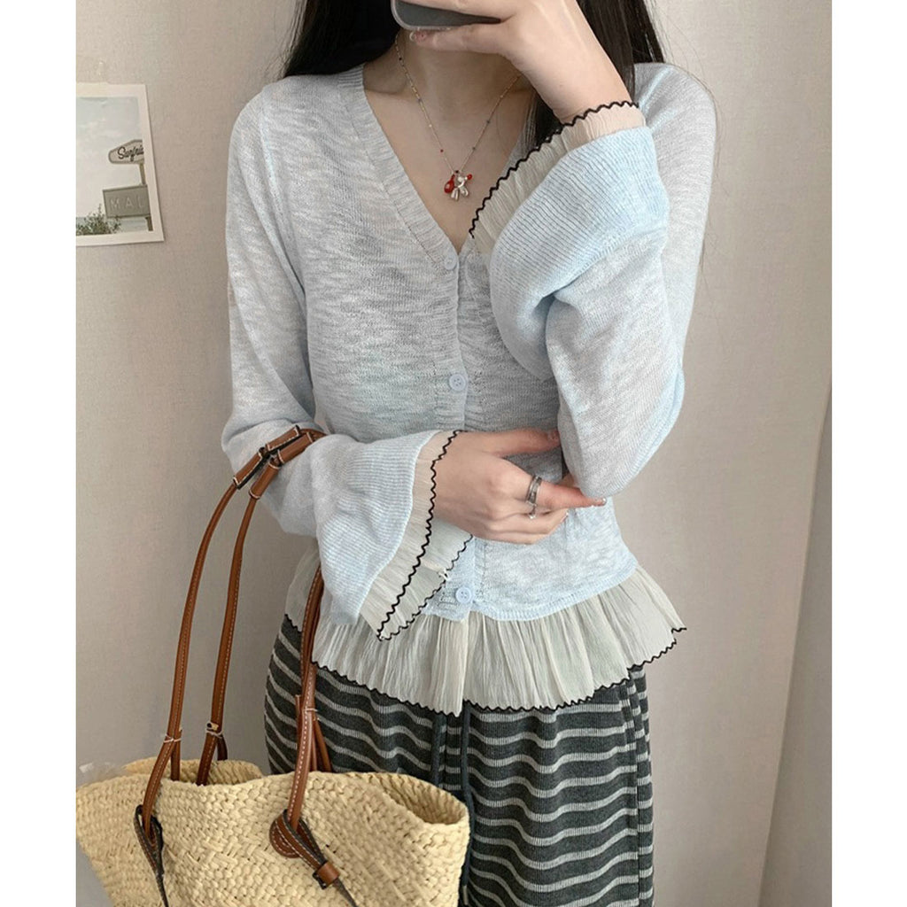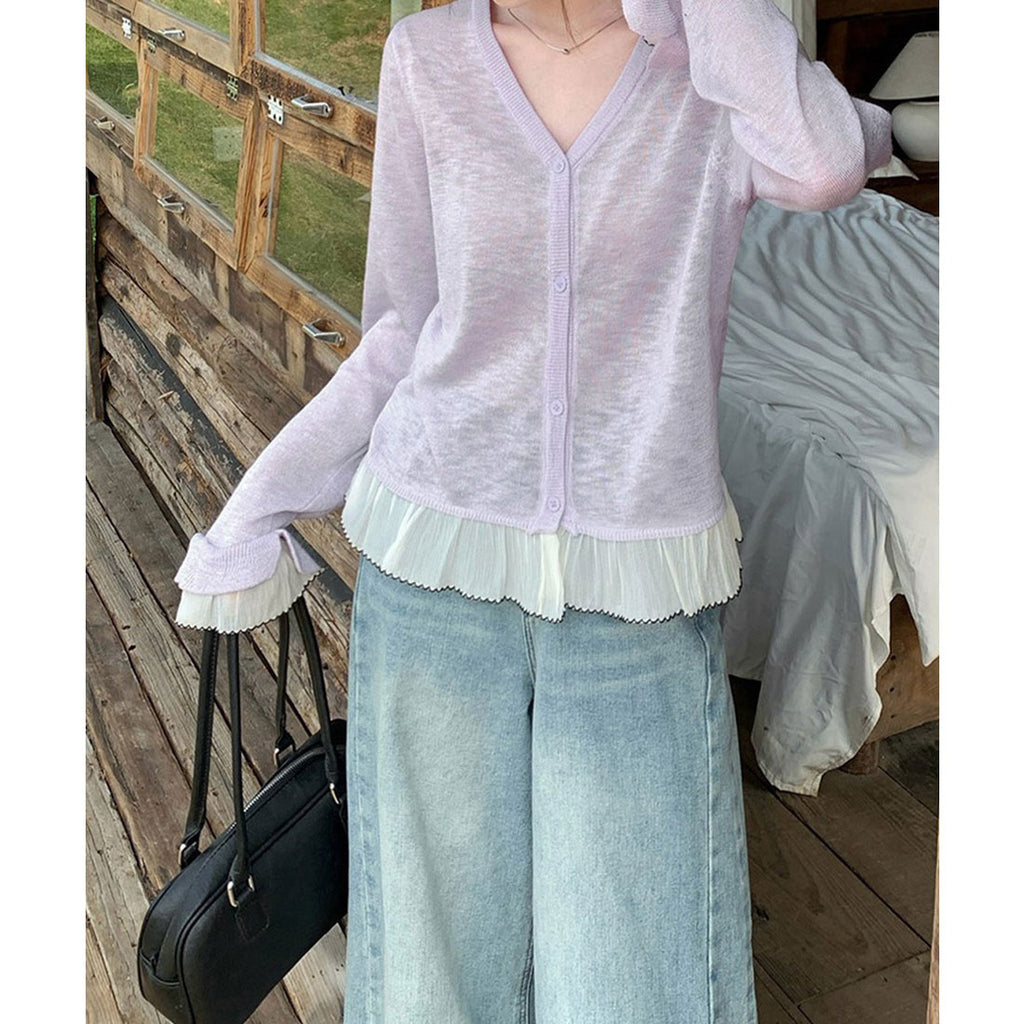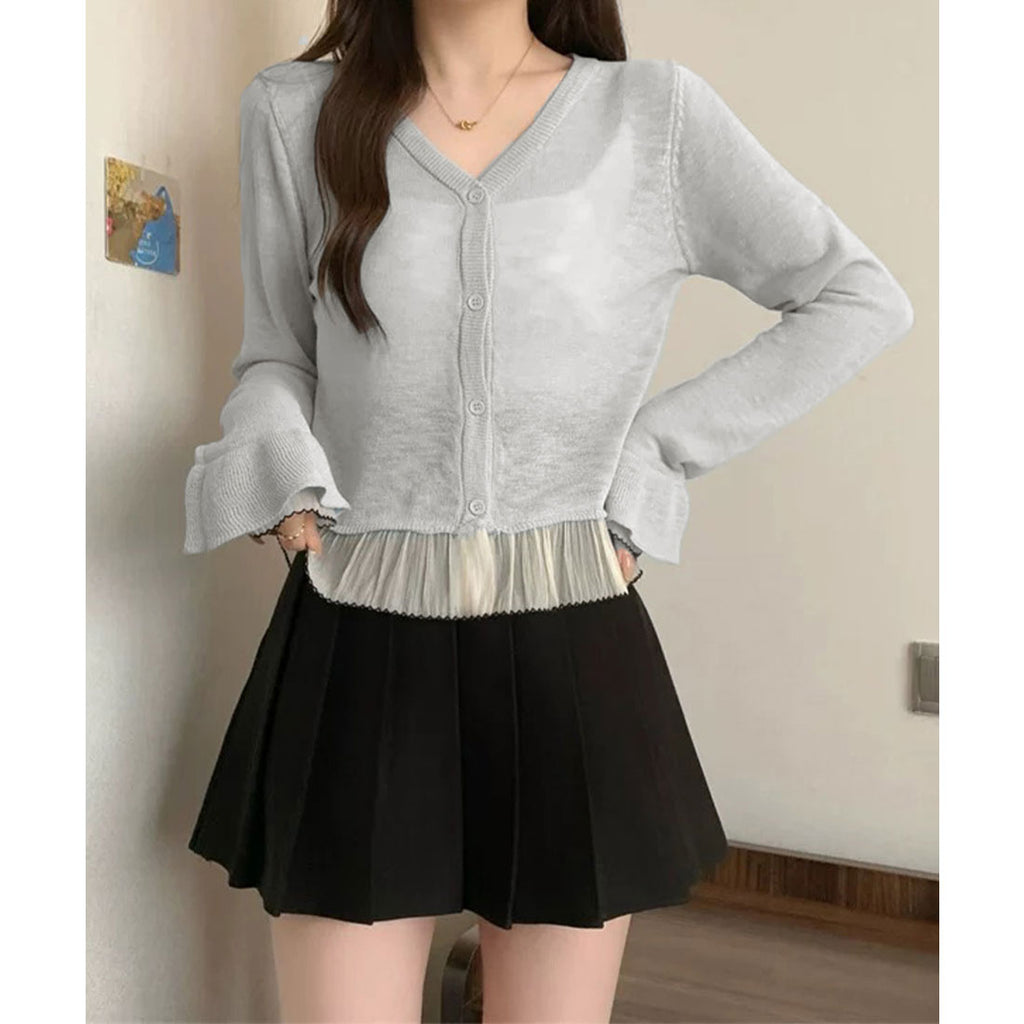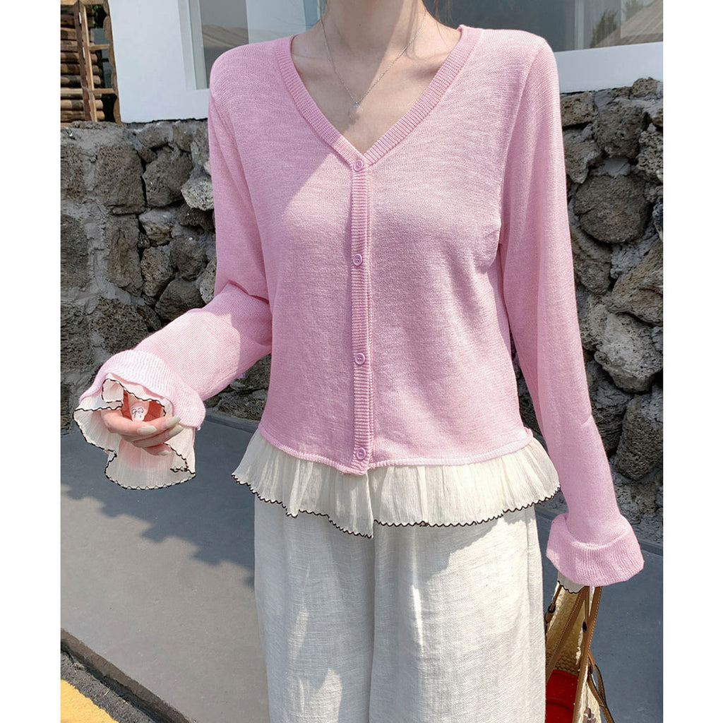 可愛大方的透視針織衫,女款,荷葉邊袖子,適合通學通勤夏季針織上衣,防紫外線外套,韓國風