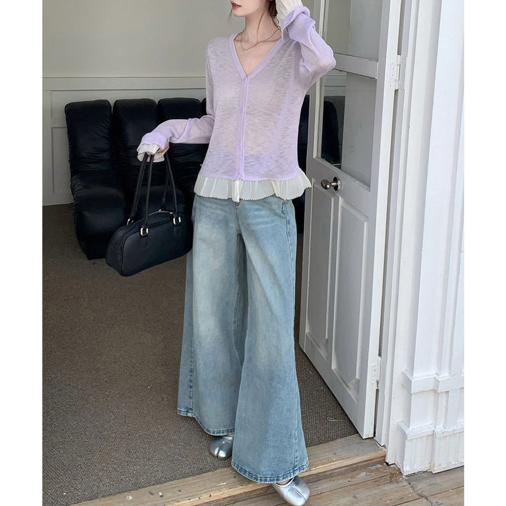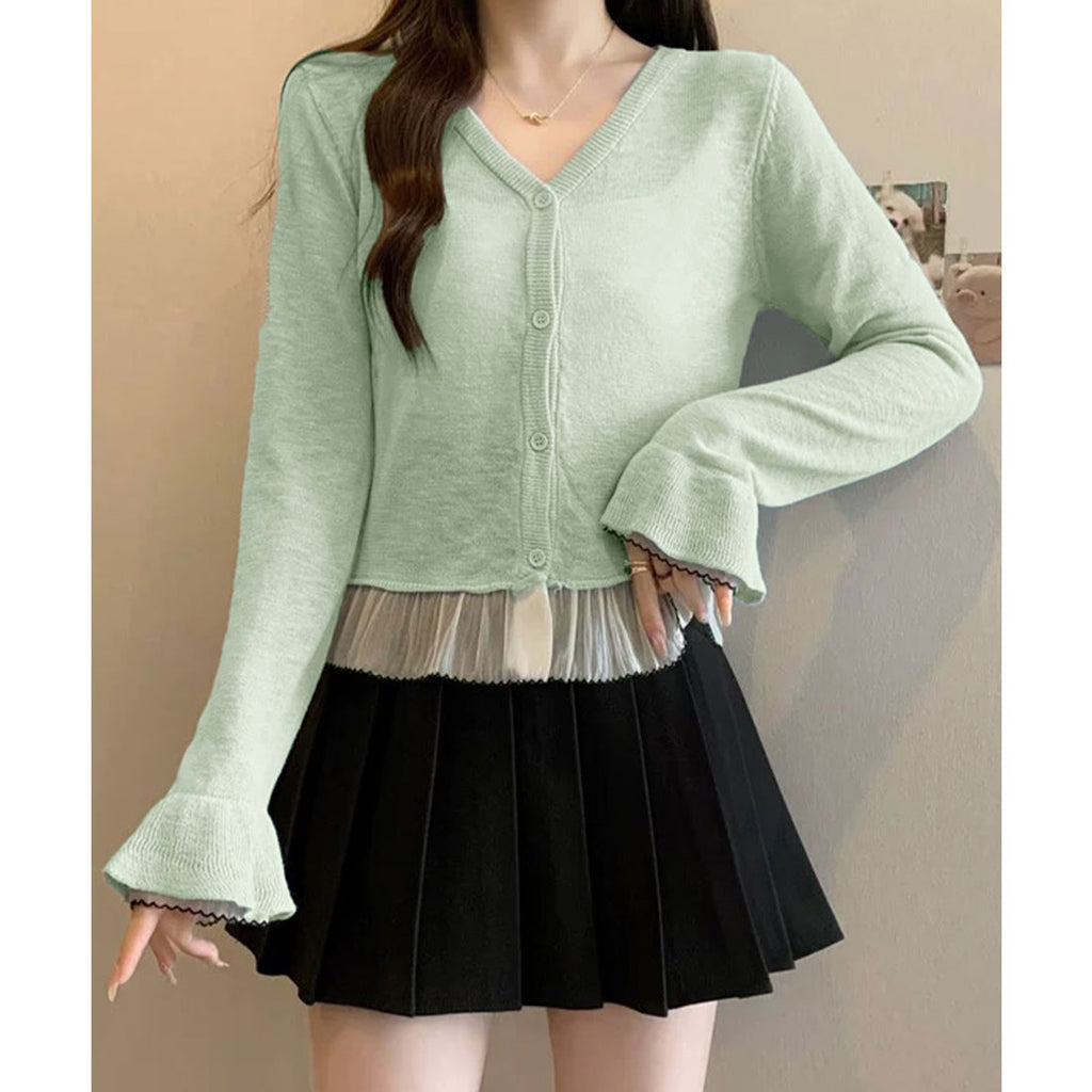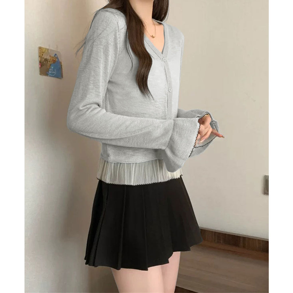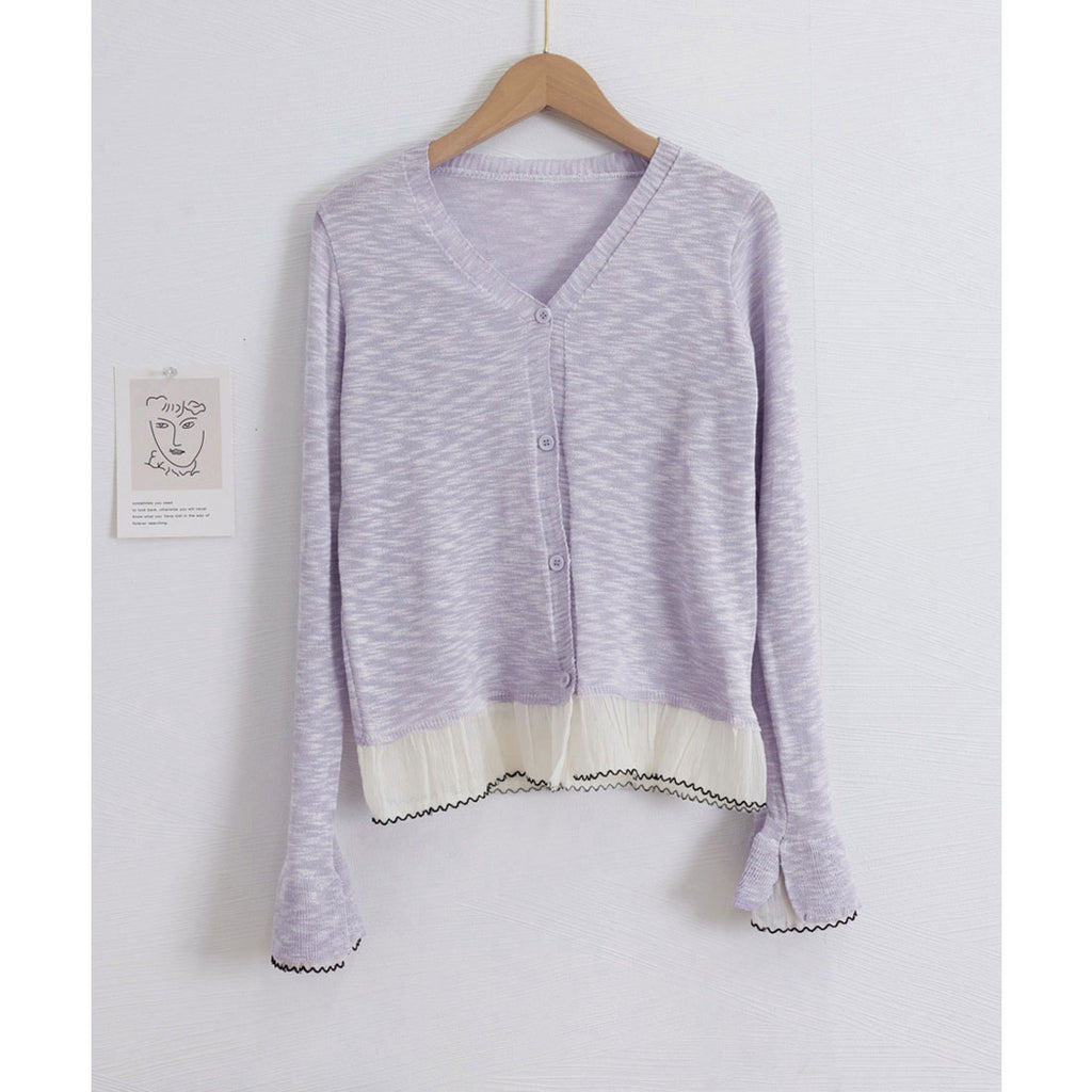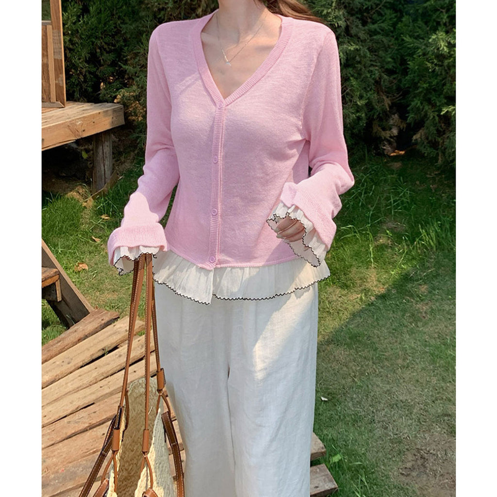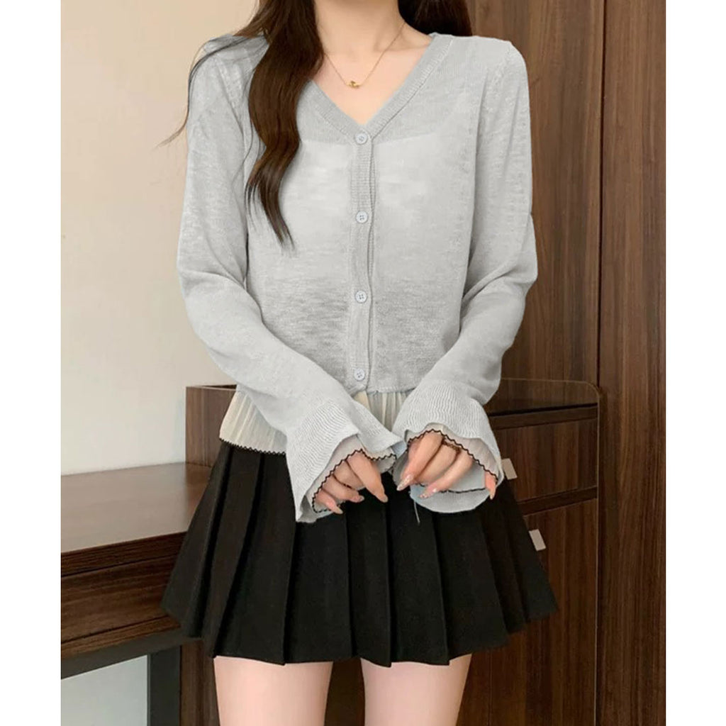 可愛大方的透視針織衫,女款,荷葉邊袖子,適合通學通勤夏季針織上衣,防紫外線外套,韓國風