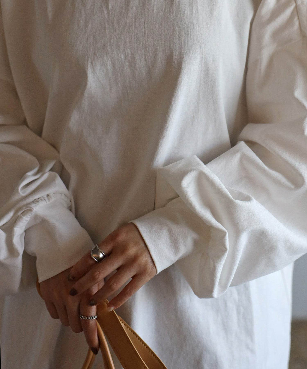 袖口採用褶皺設計,捲起袖子後變成可愛的蓬鬆袖。
