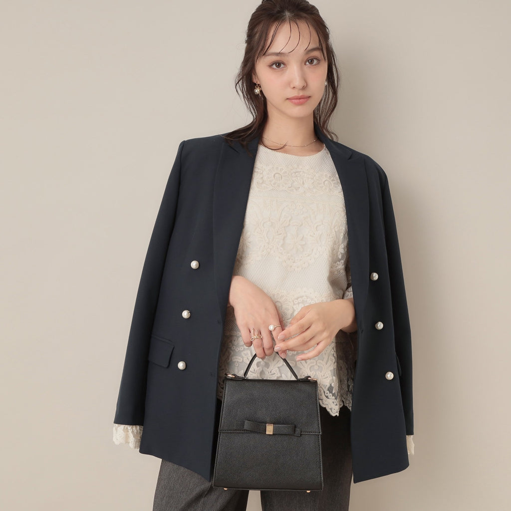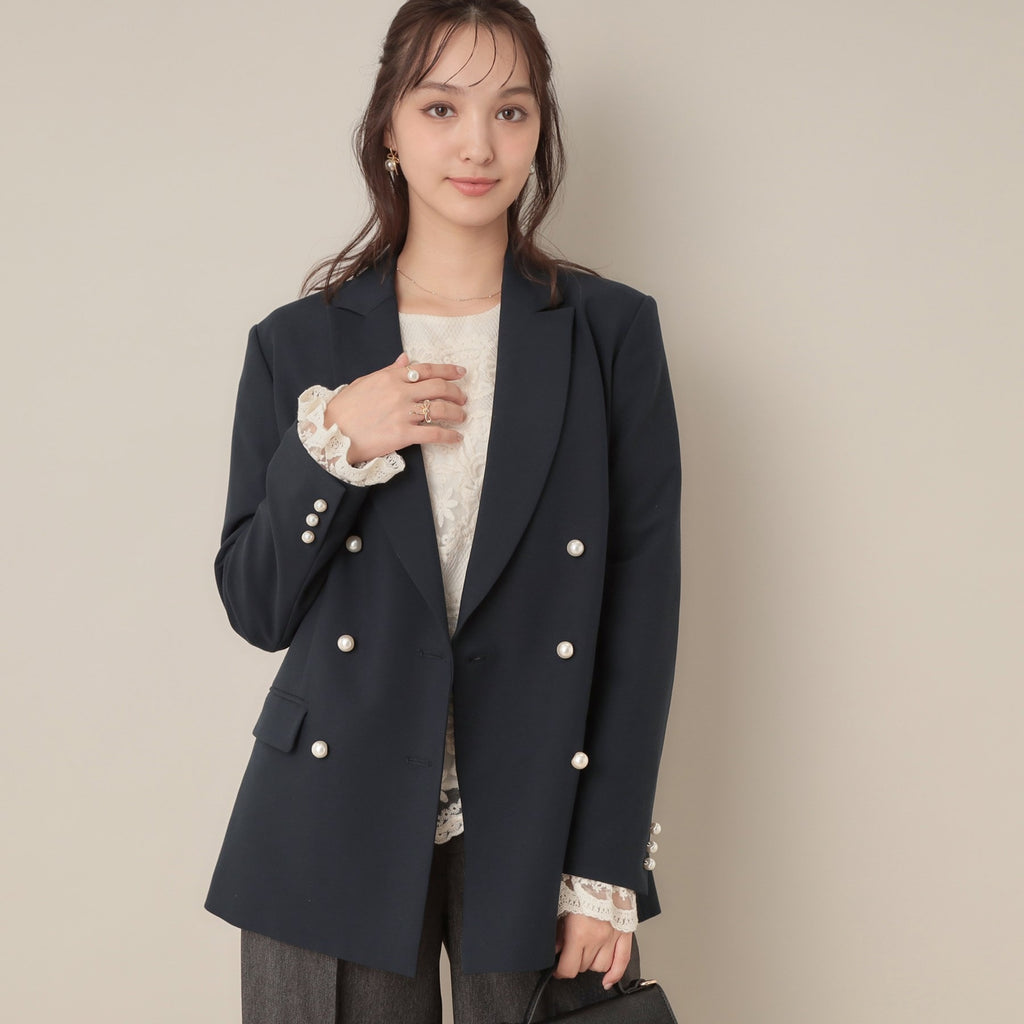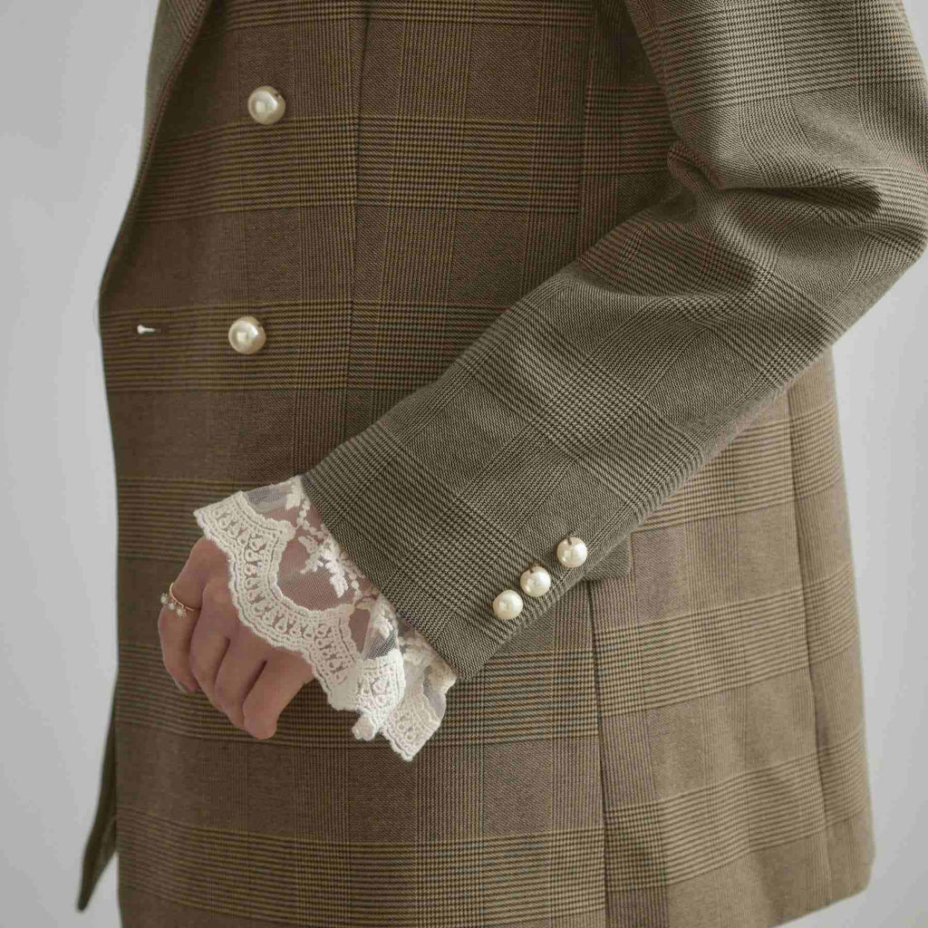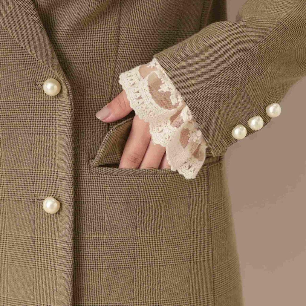 袖口配有可拆卸的蕾絲袖口扣釦的珍珠調扣子西裝外套