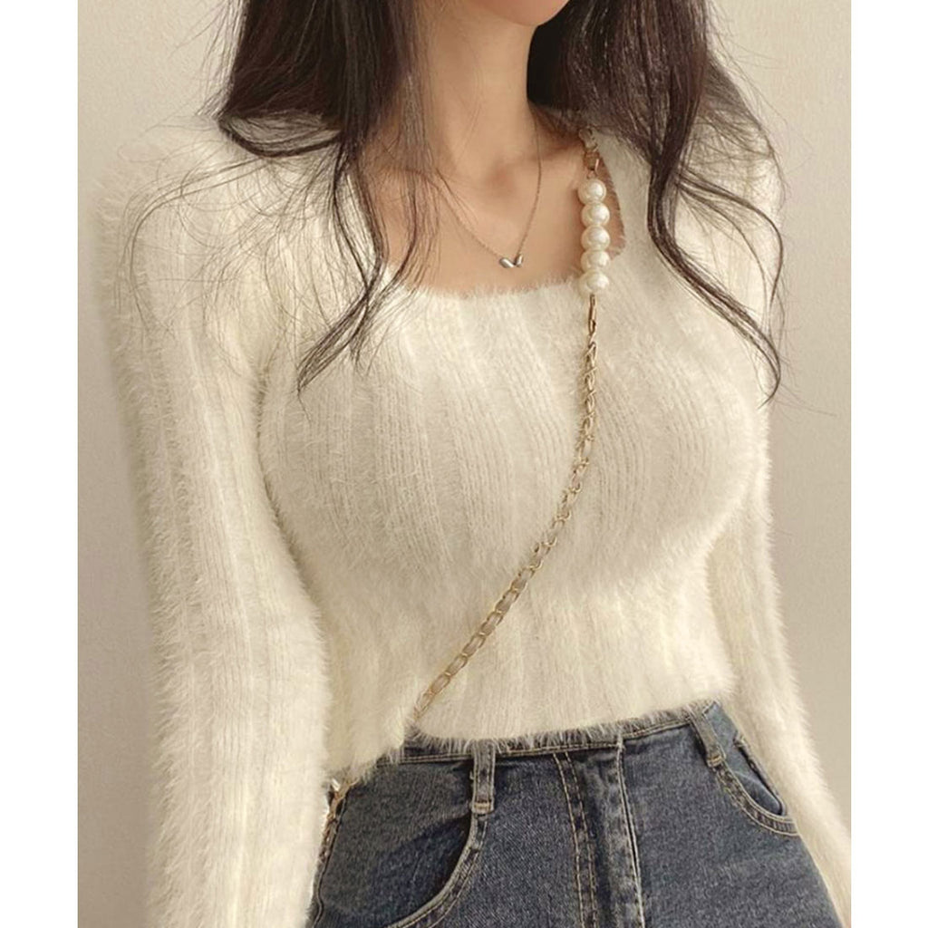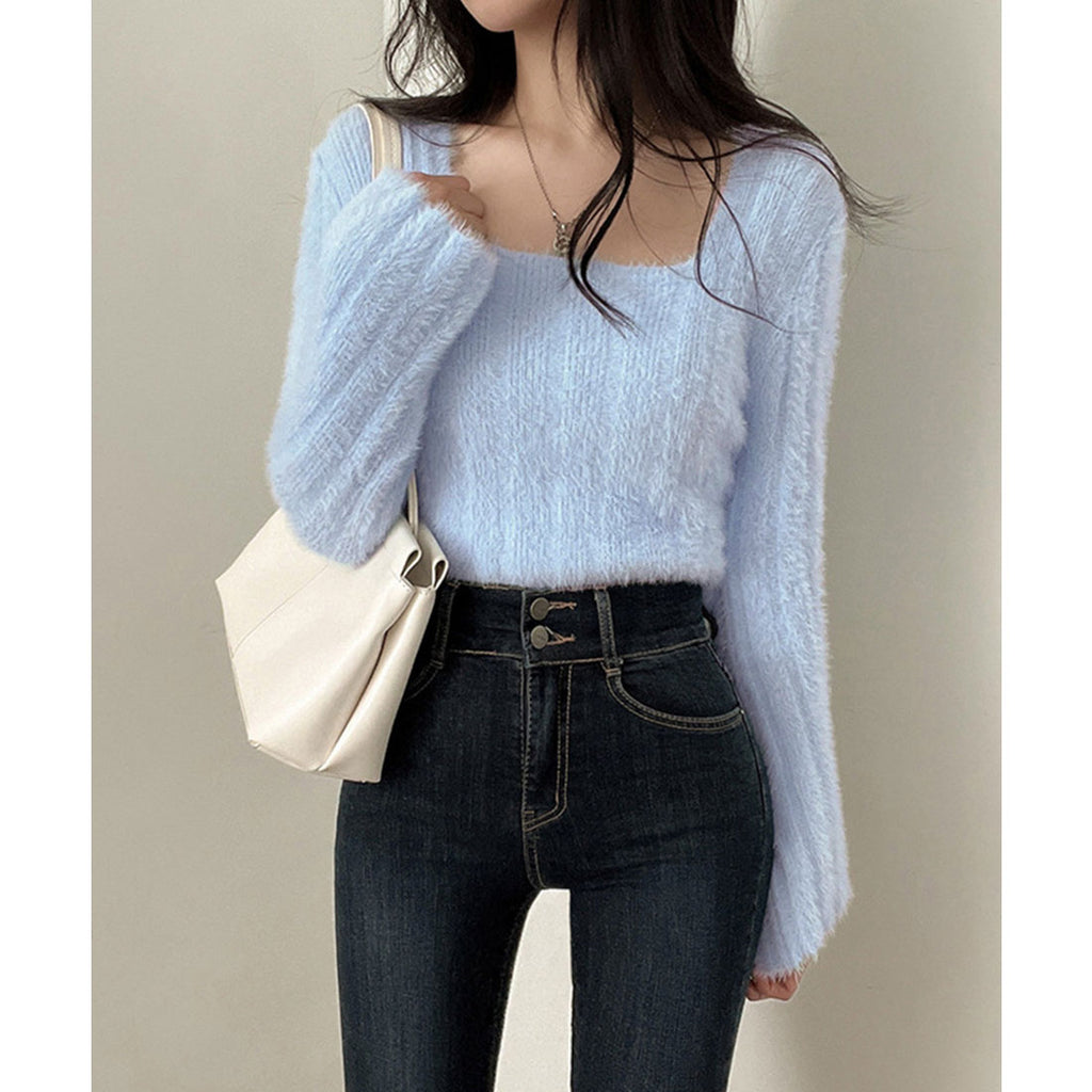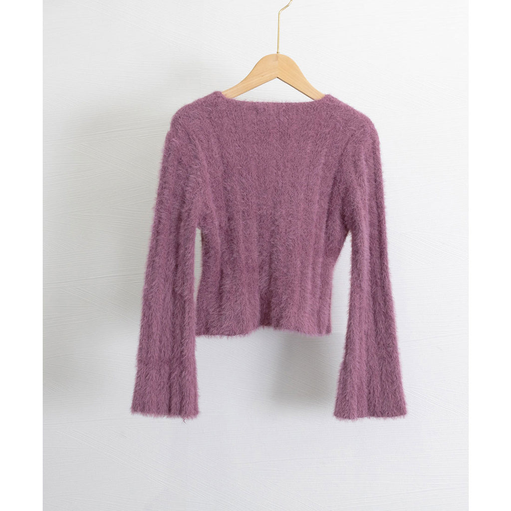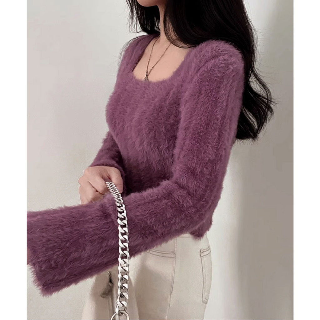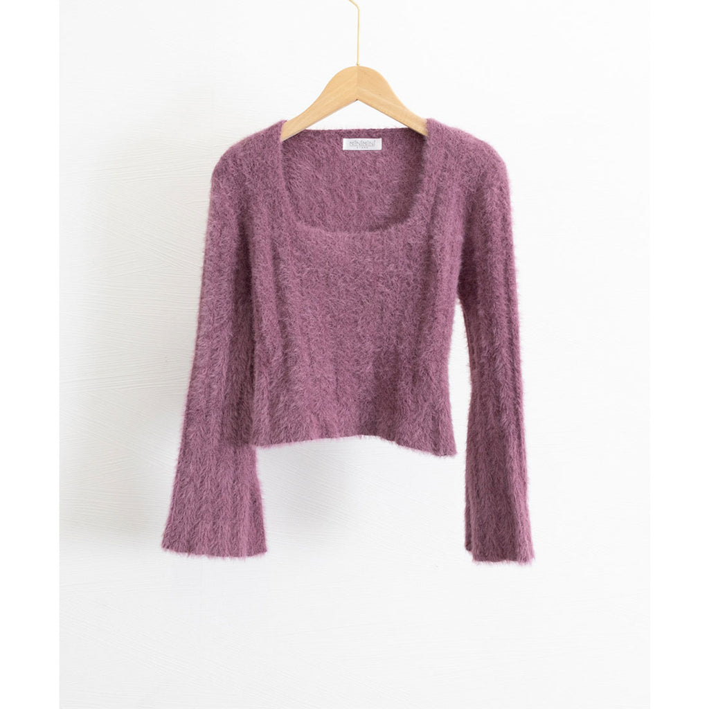 女士 ふわふわ針織上衣 喇叭袖 針織毛衣 方領 大人可愛 素色 柔軟針織 秋冬