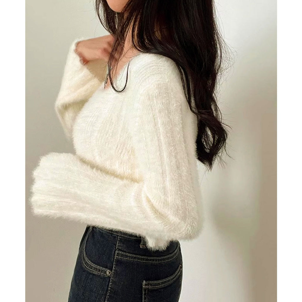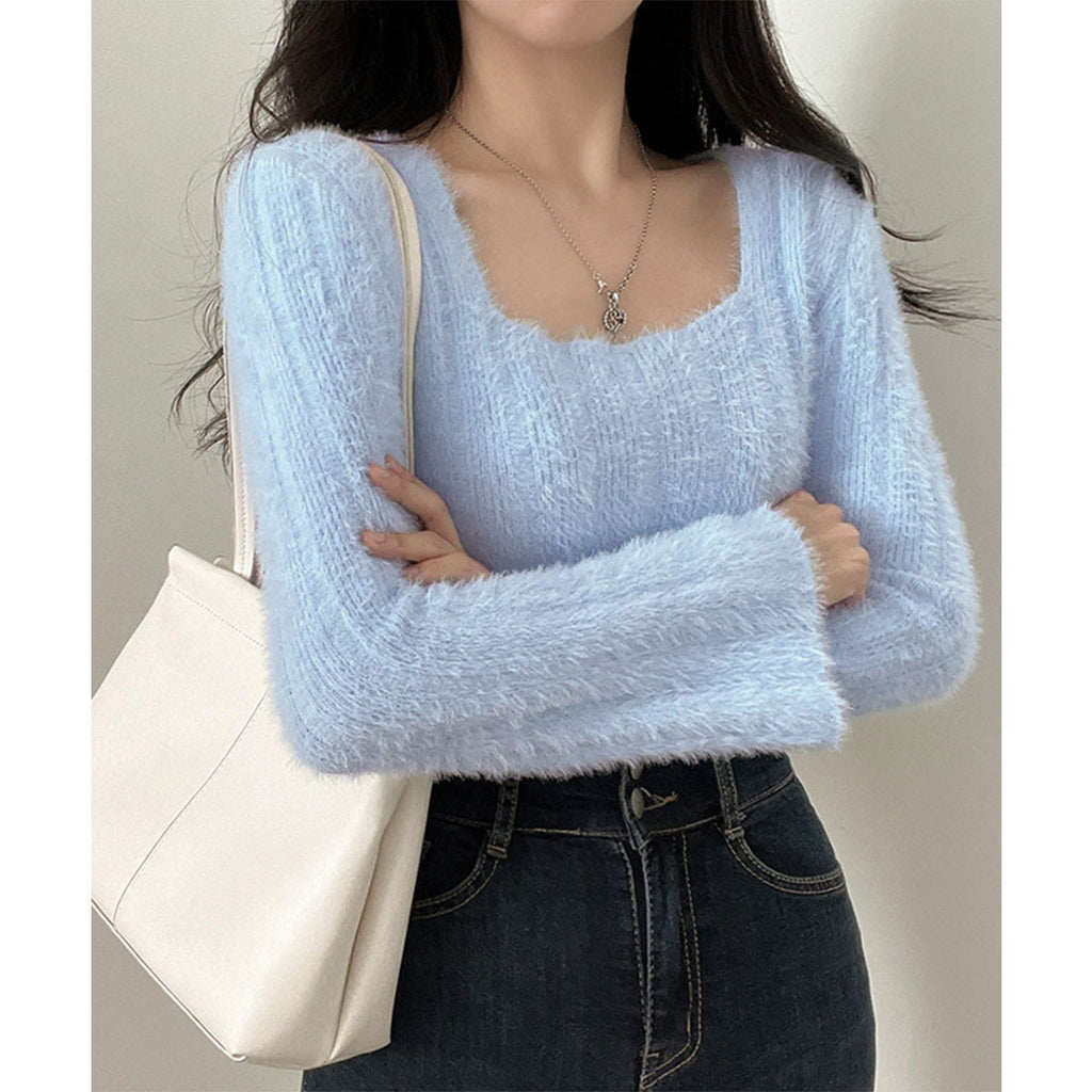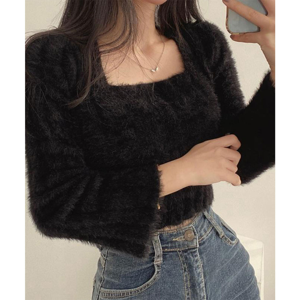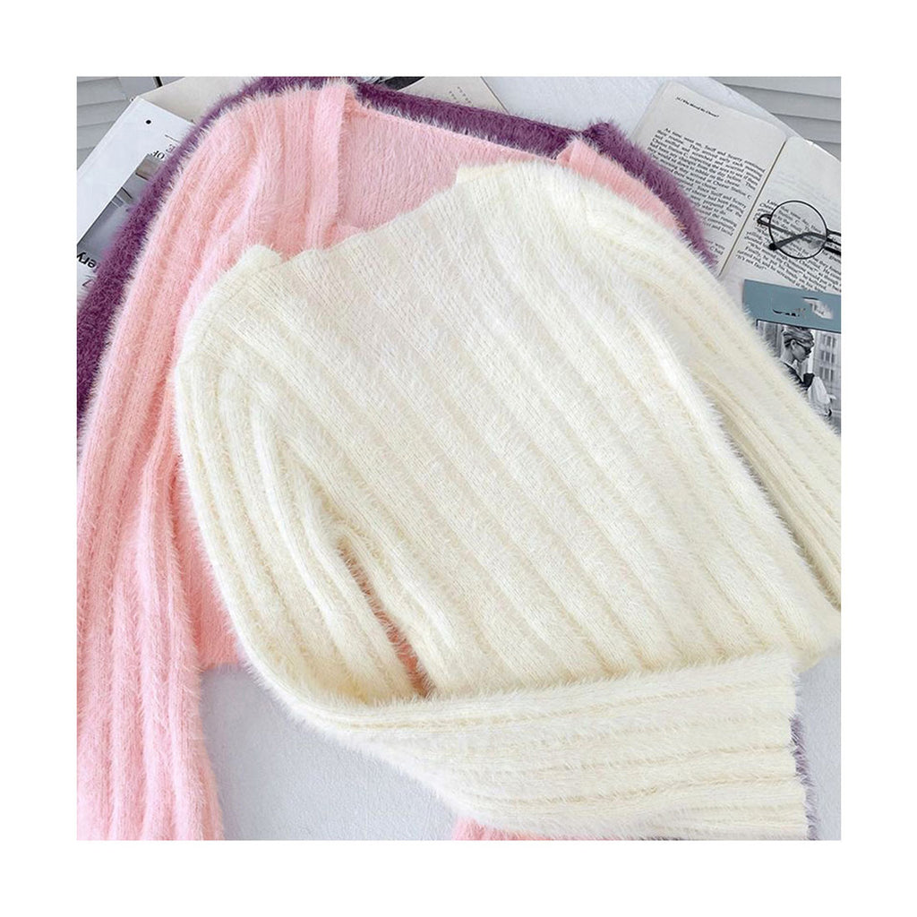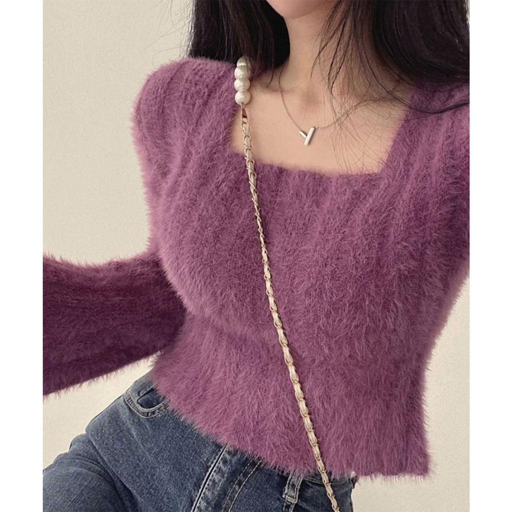 女士 ふわふわ針織上衣 喇叭袖 針織毛衣 方領 大人可愛 素色 柔軟針織 秋冬