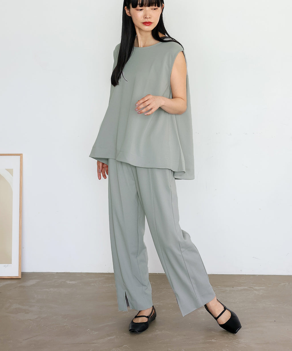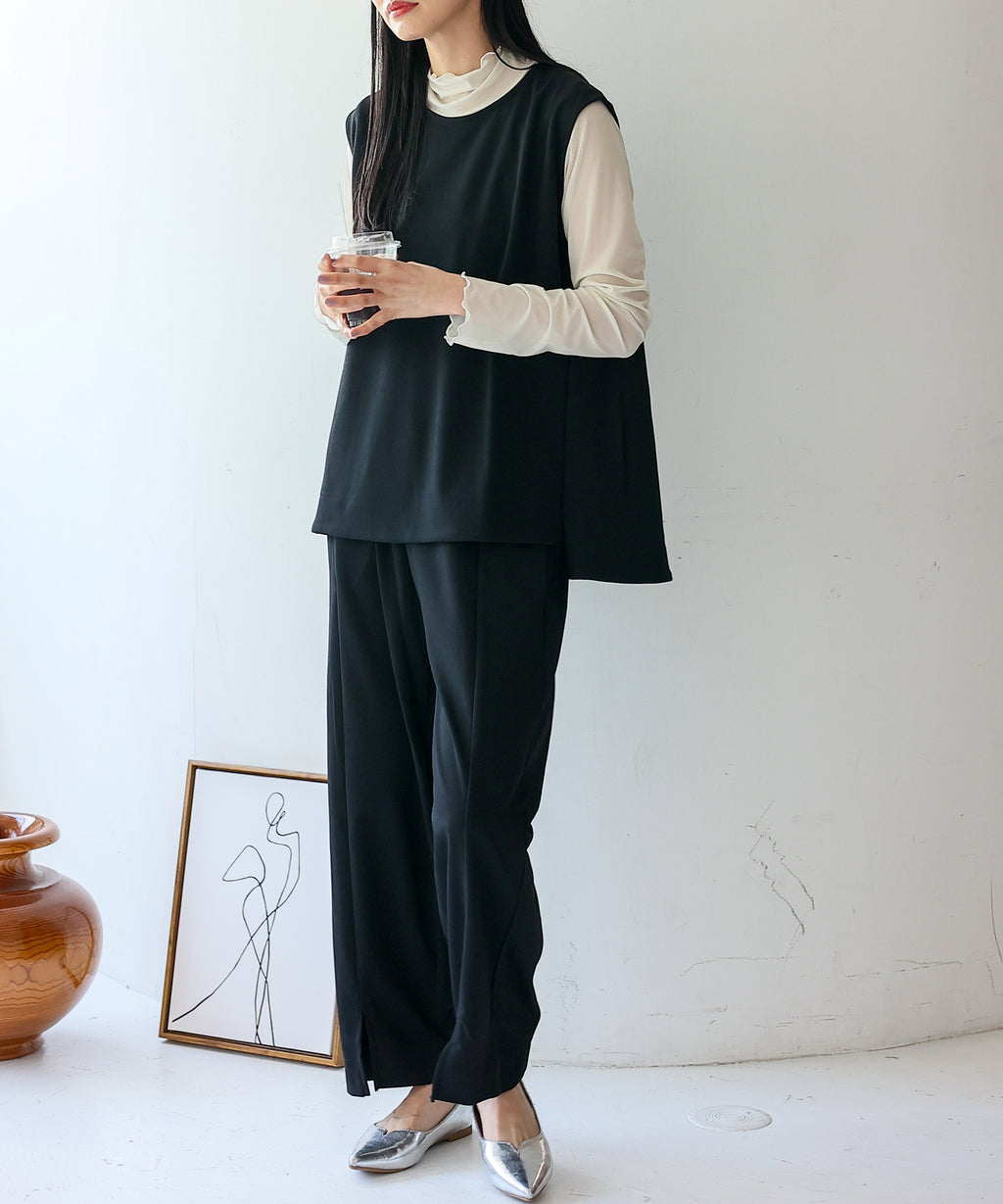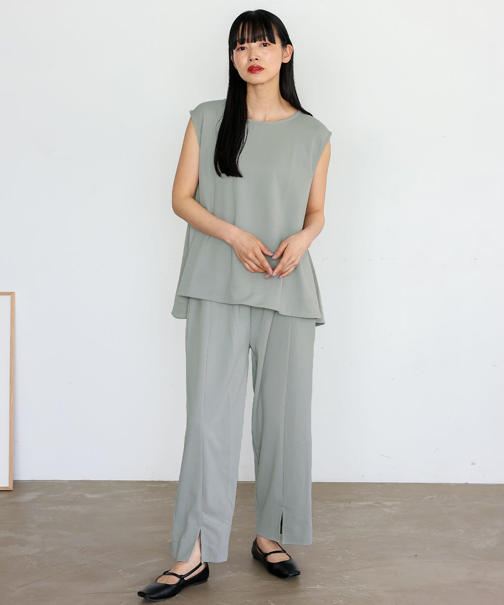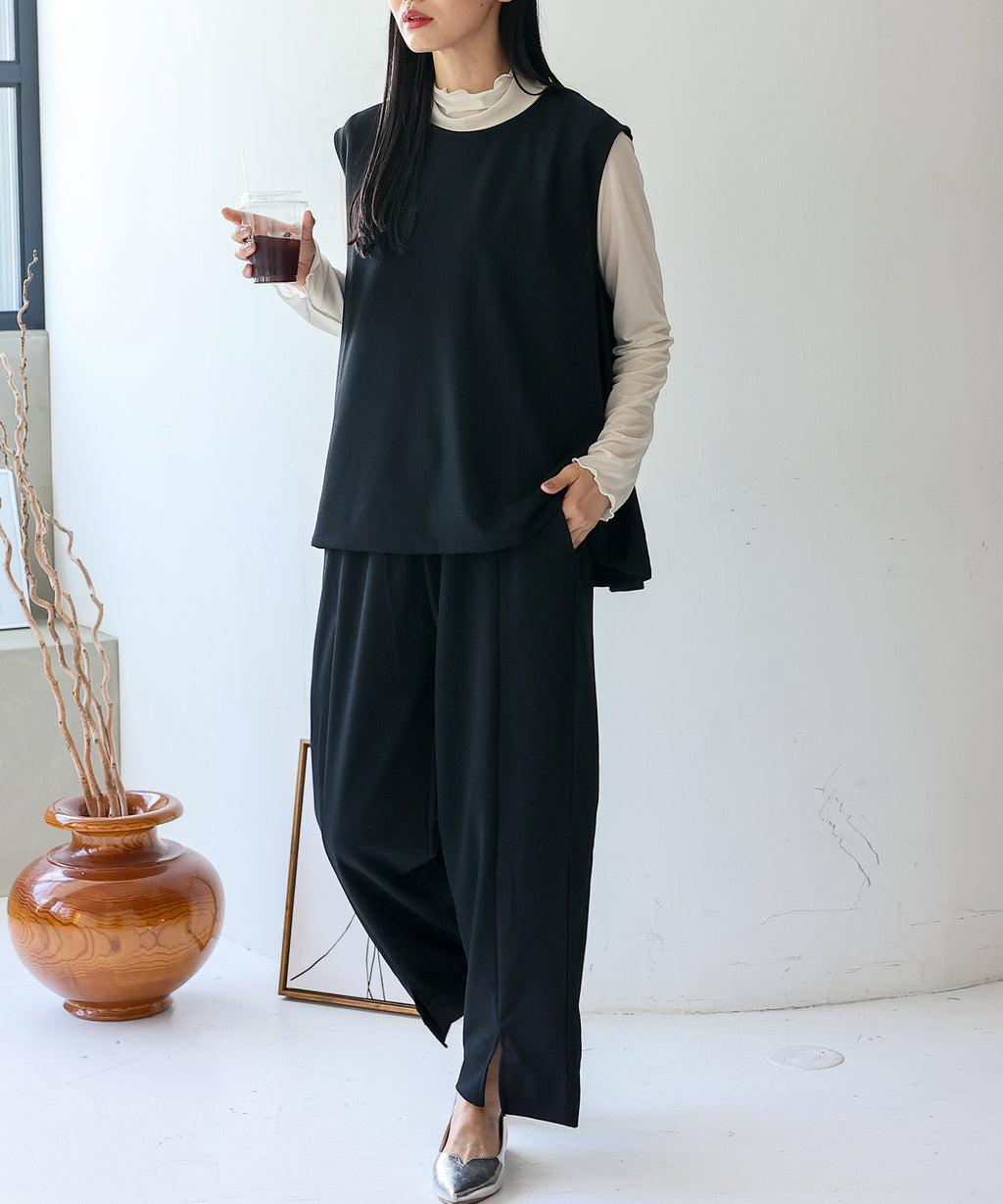 時短時尚的實現!無袖上衣×開衩褲的套裝。
