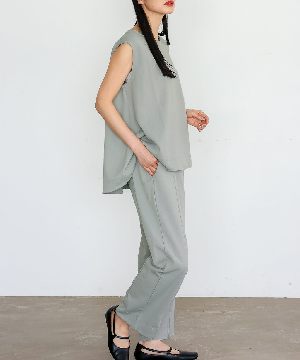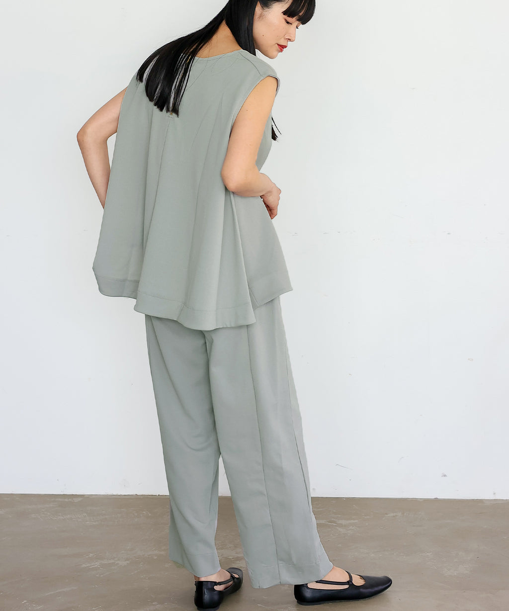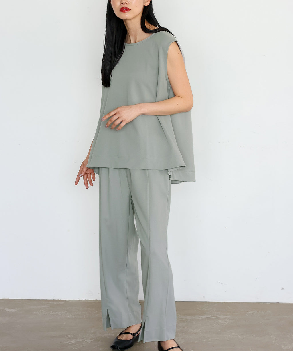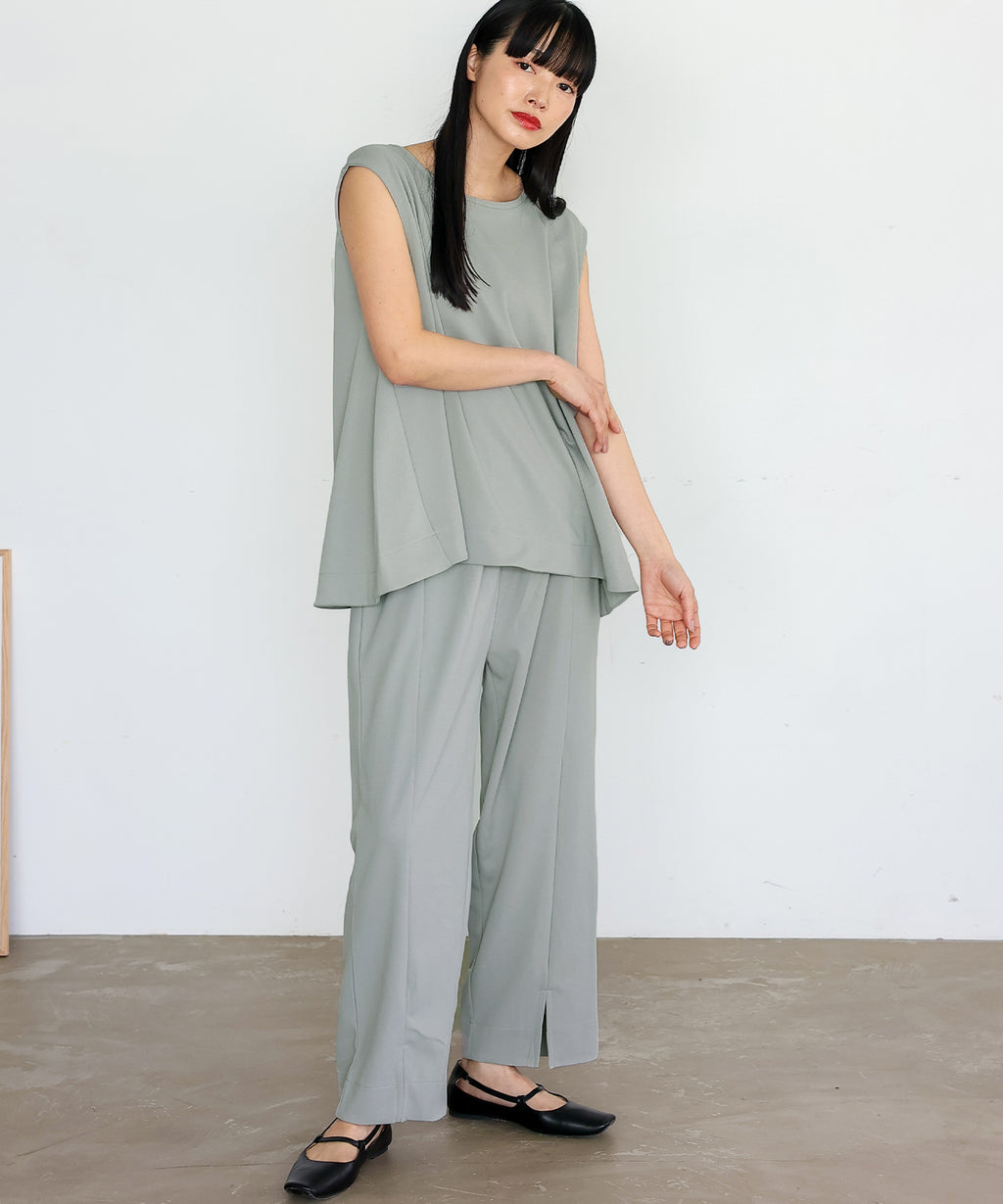 時短時尚的實現!無袖上衣×開衩褲的套裝。