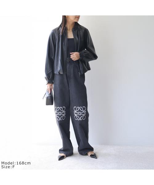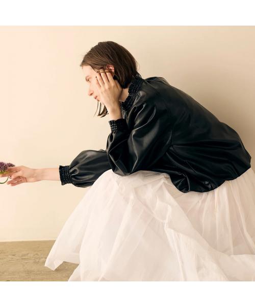 適合秋季剛開始時就可以穿著的裏地藍色外套,採用光滑柔軟的環保皮革,內裡有褶皺和皺褶設計,營造適度的蓬鬆感,即使搭配厚毛衣也沒問題。