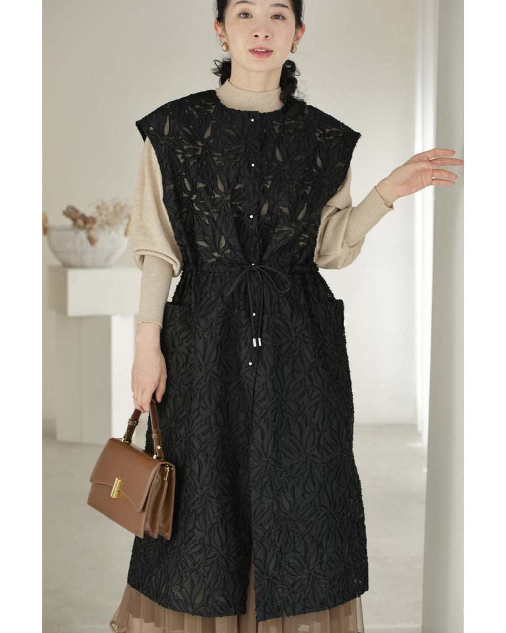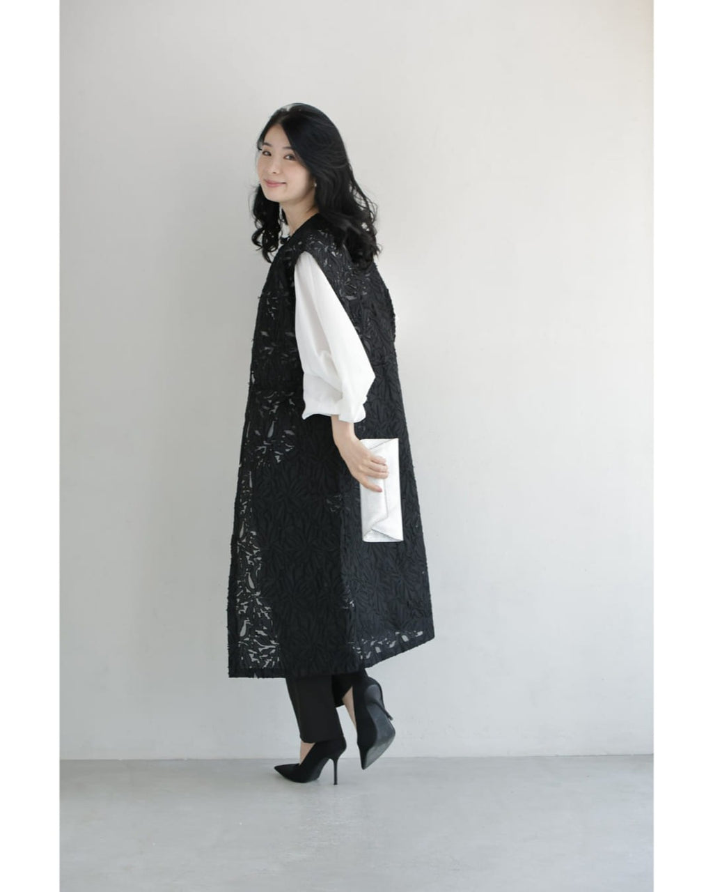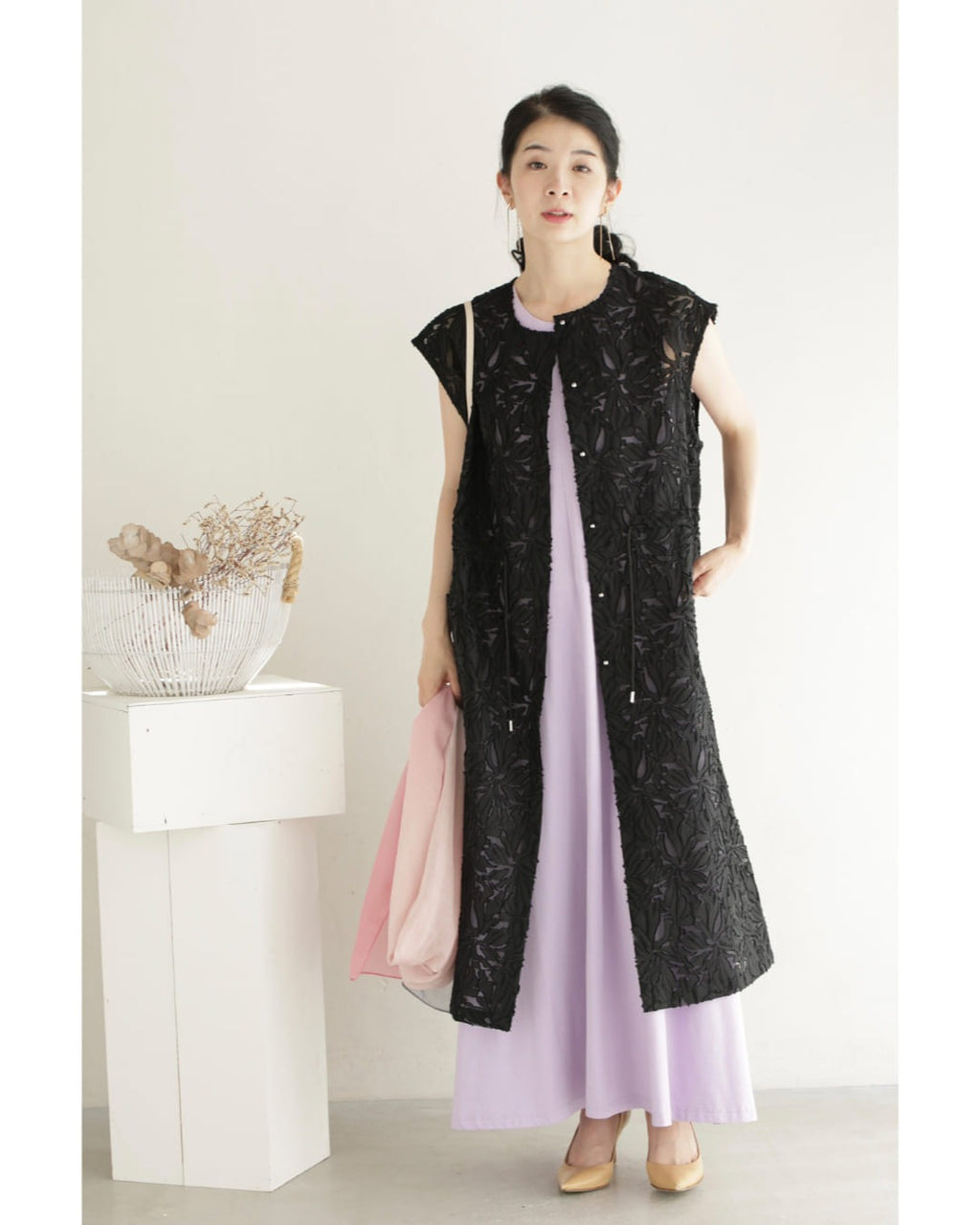 ロング丈ながら軽やかな素材感で重量を感じさせず、動くたびに揺れる表情が女性らしさを引き立てます。