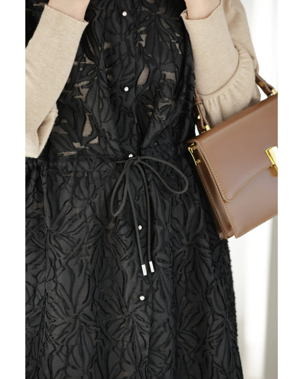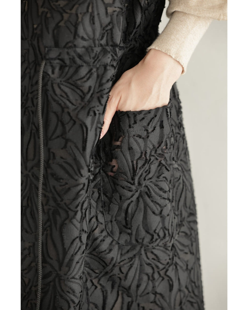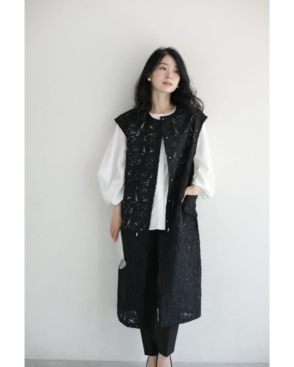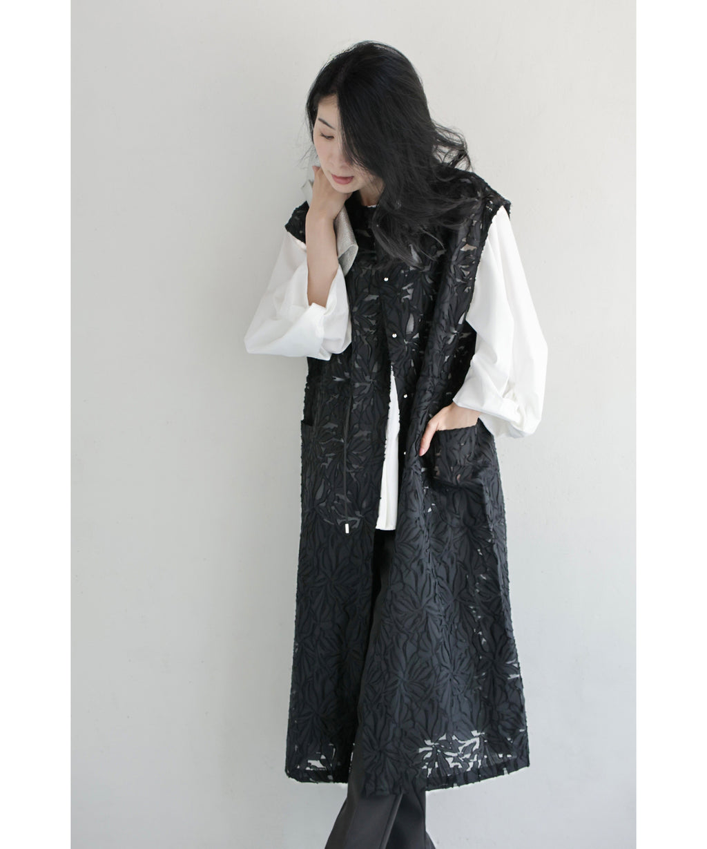 ロング丈ながら軽やかな素材感で重量を感じさせず、動くたびに揺れる表情が女性らしさを引き立てます。