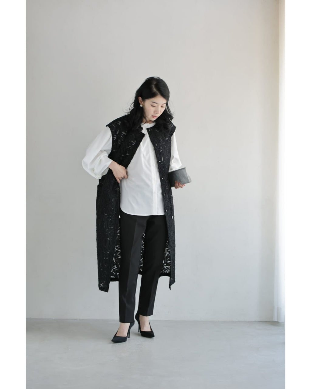 縦に流れるIラインシルエットが自然な錯視効果を生み、すっきりとした体型カバーを叶えてくれるのも嬉しいポイント。