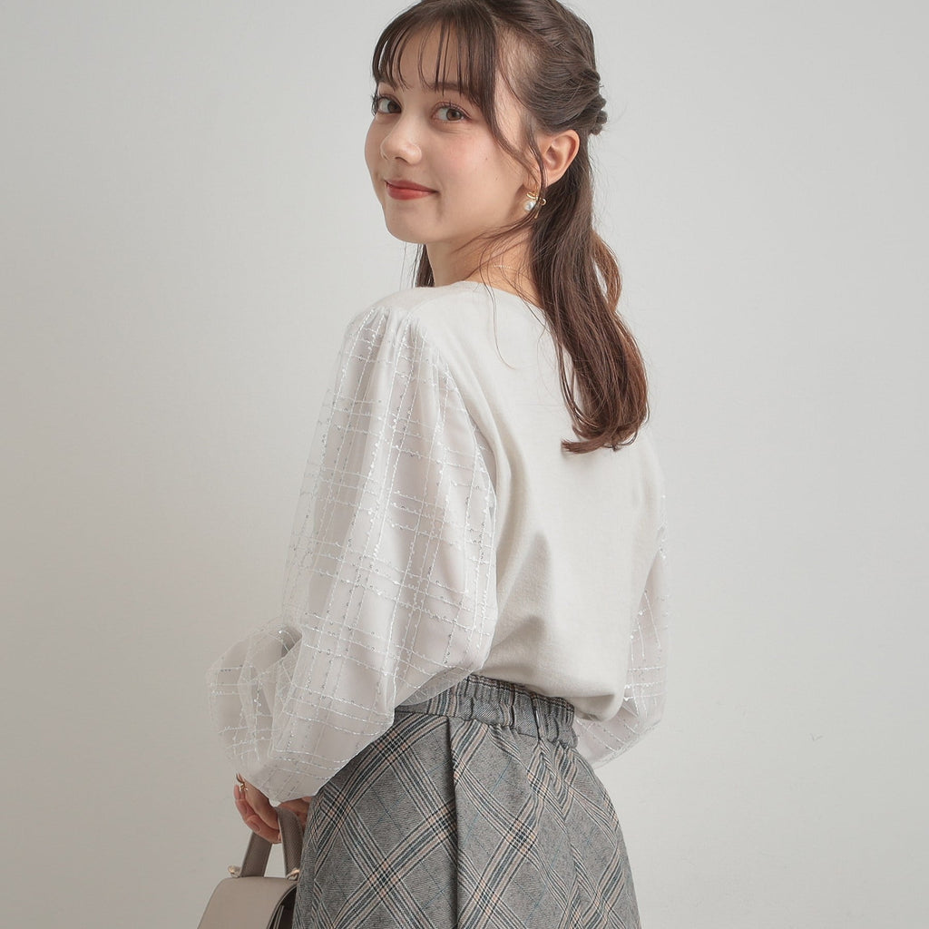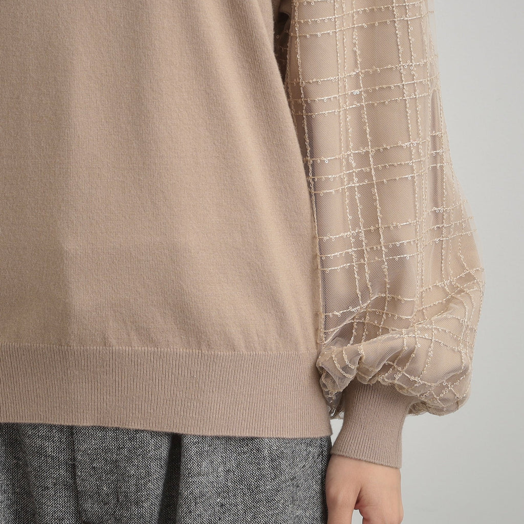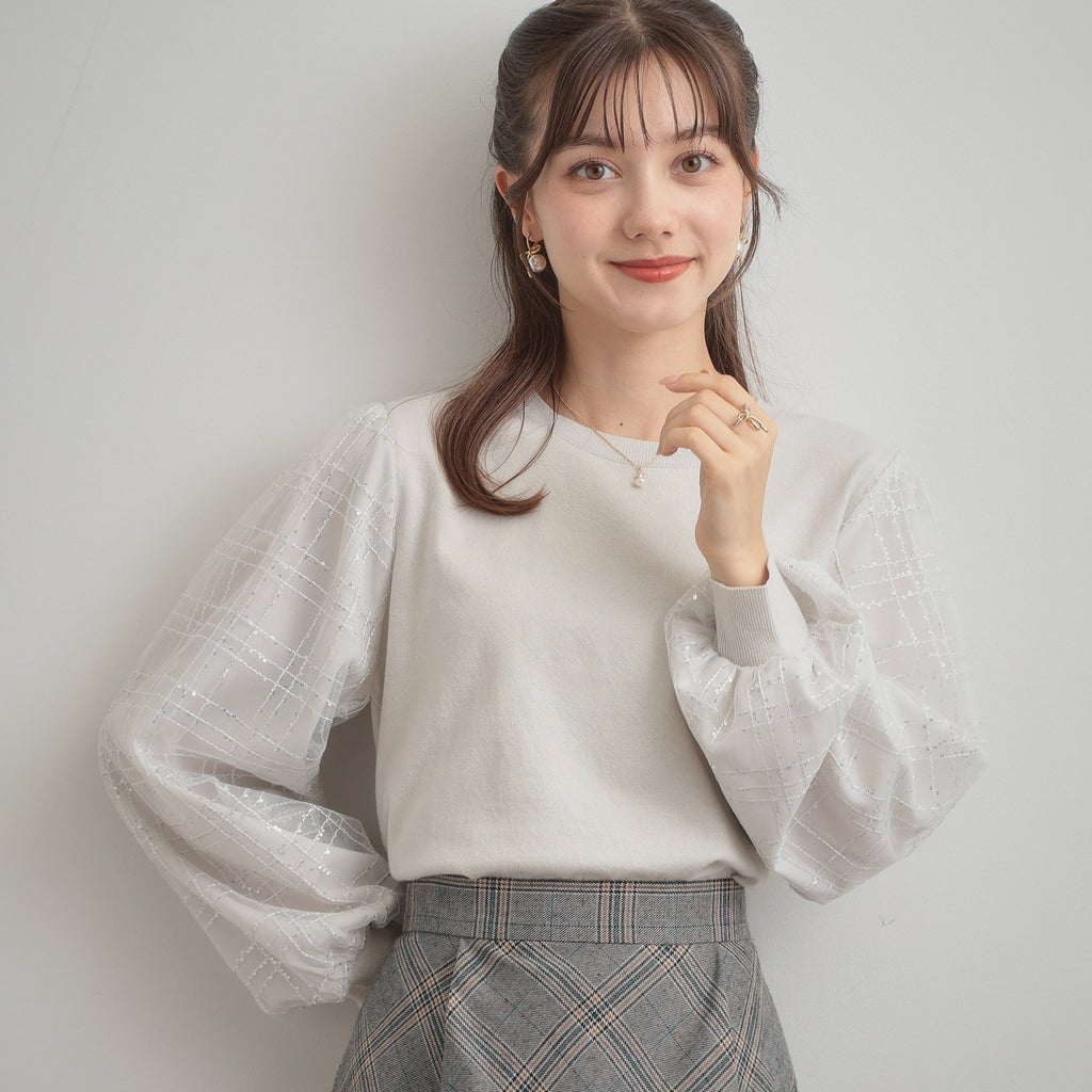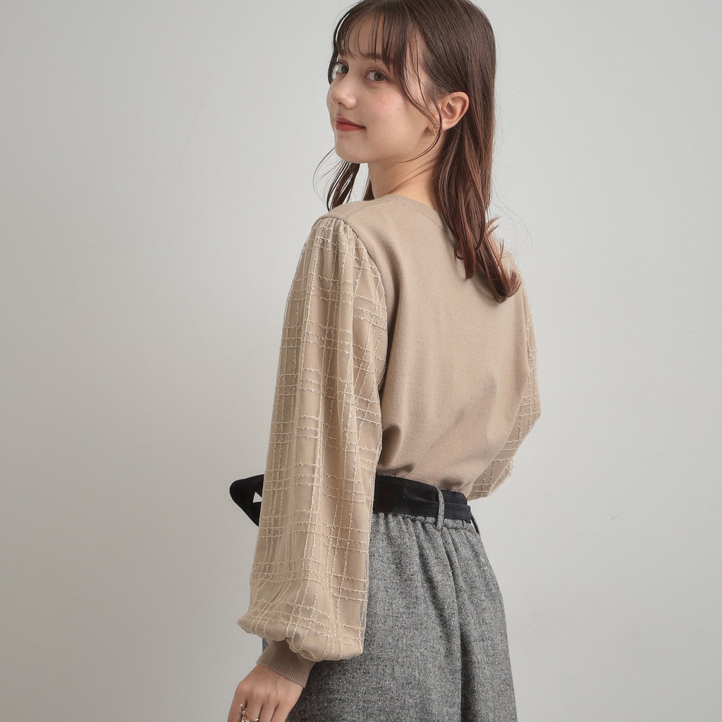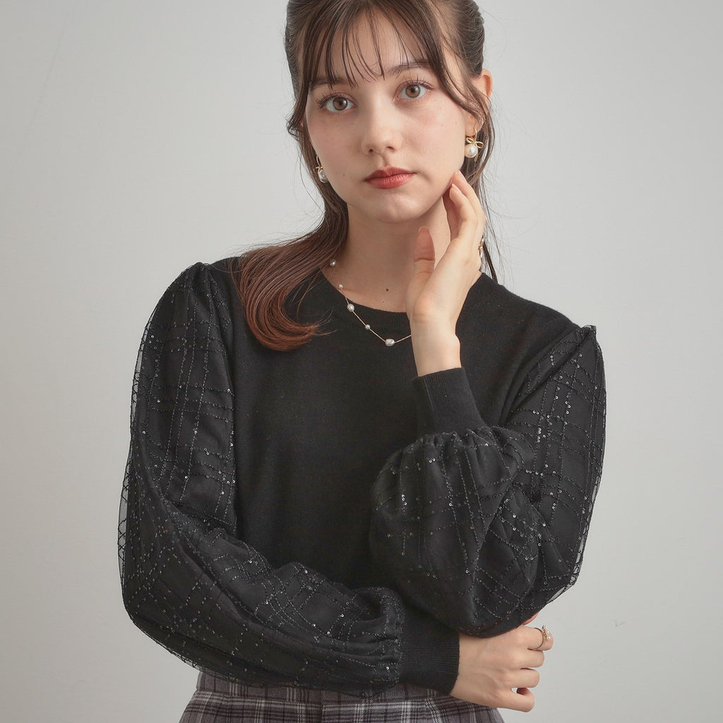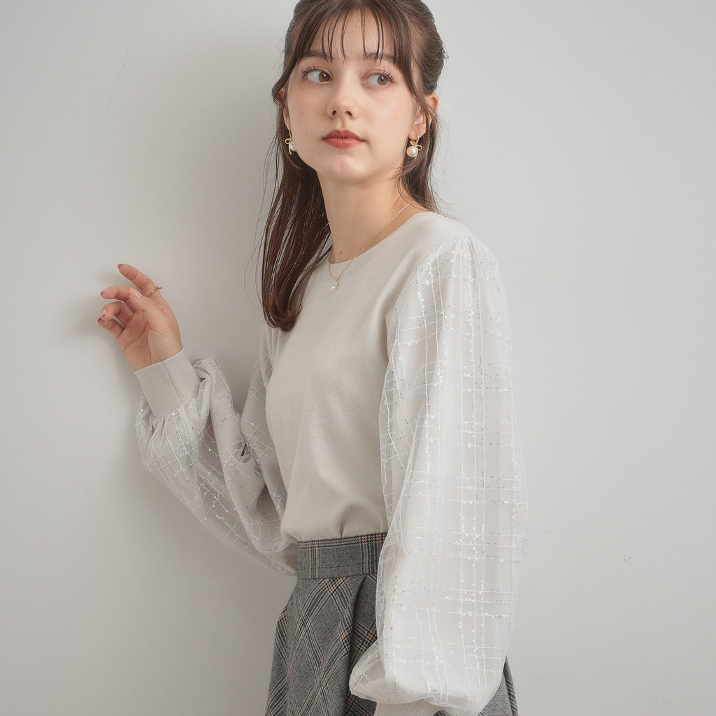 本體部分採用柔軟的天竺編織針織,袖子則是上品閃爍的亮片格紋蕾絲材質,搭配透氣性較低的喬其紗設計。