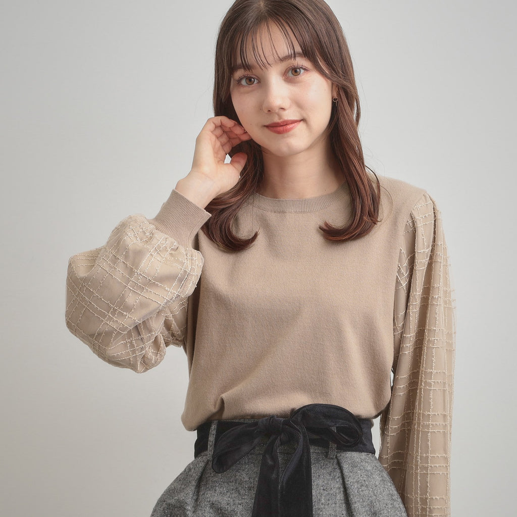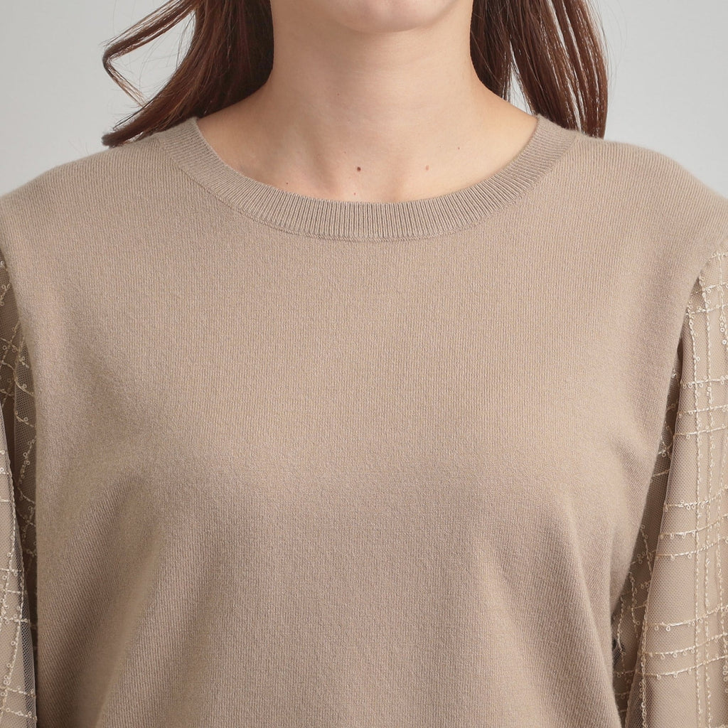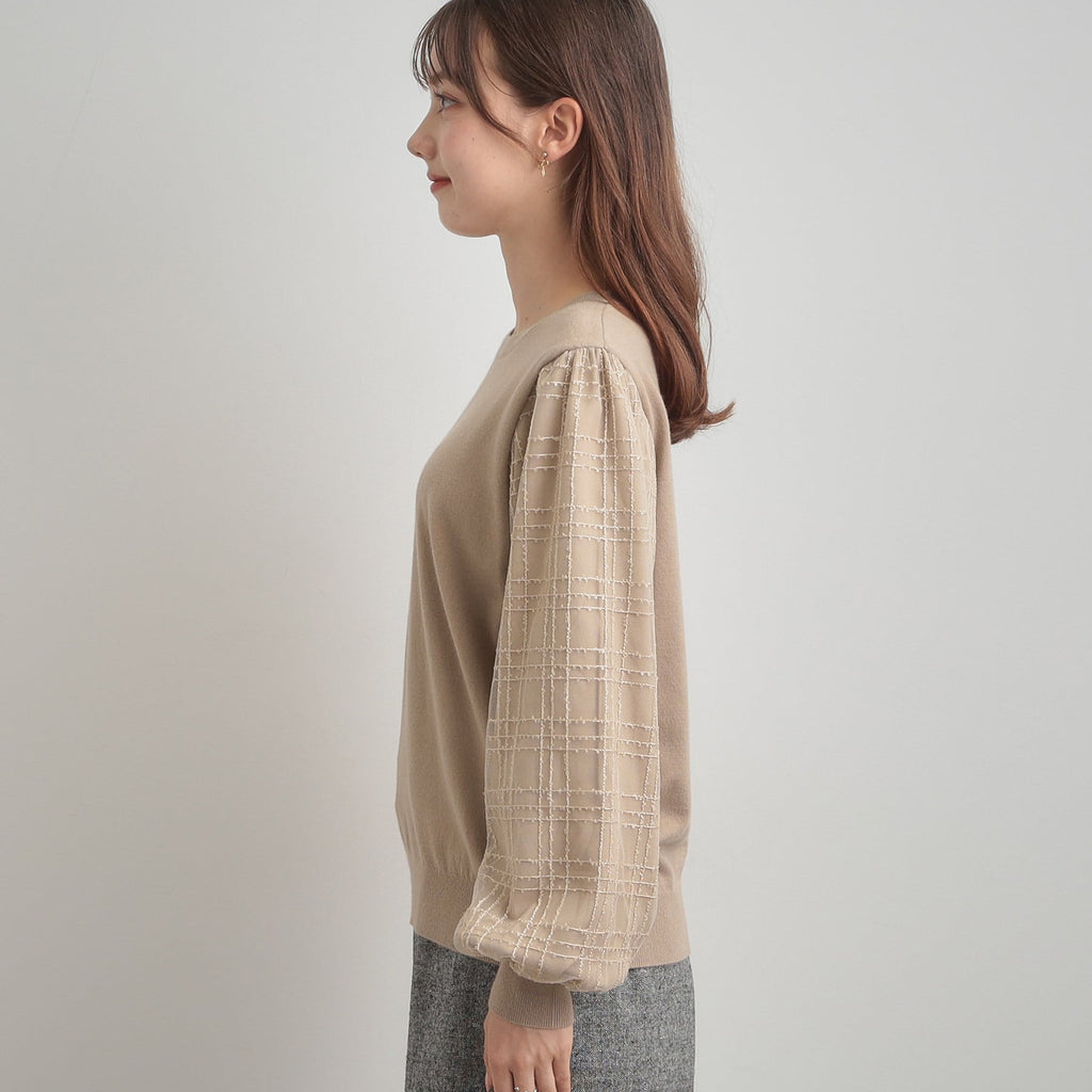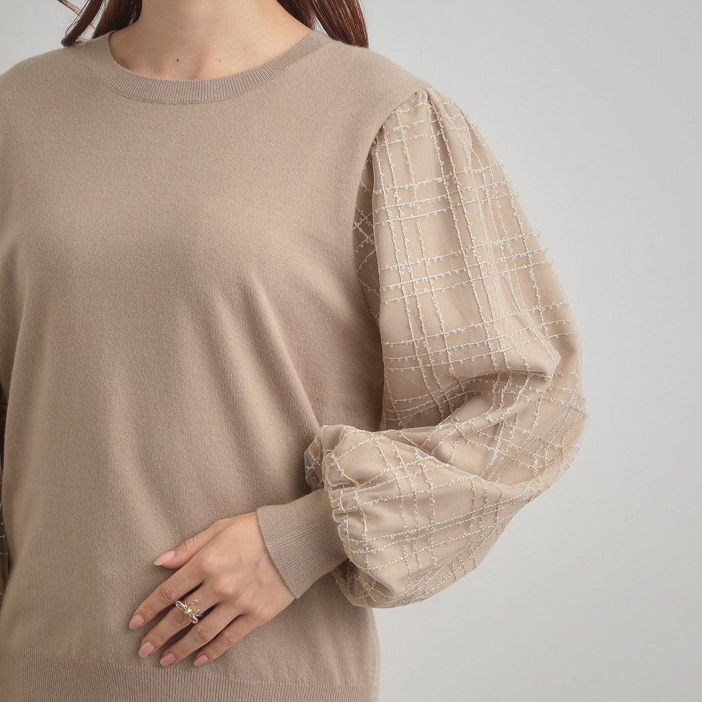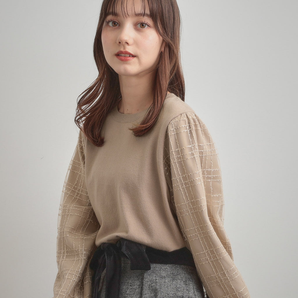 本體部分採用柔軟的天竺編織針織,袖子則是上品閃爍的亮片格紋蕾絲材質,搭配透氣性較低的喬其紗設計。