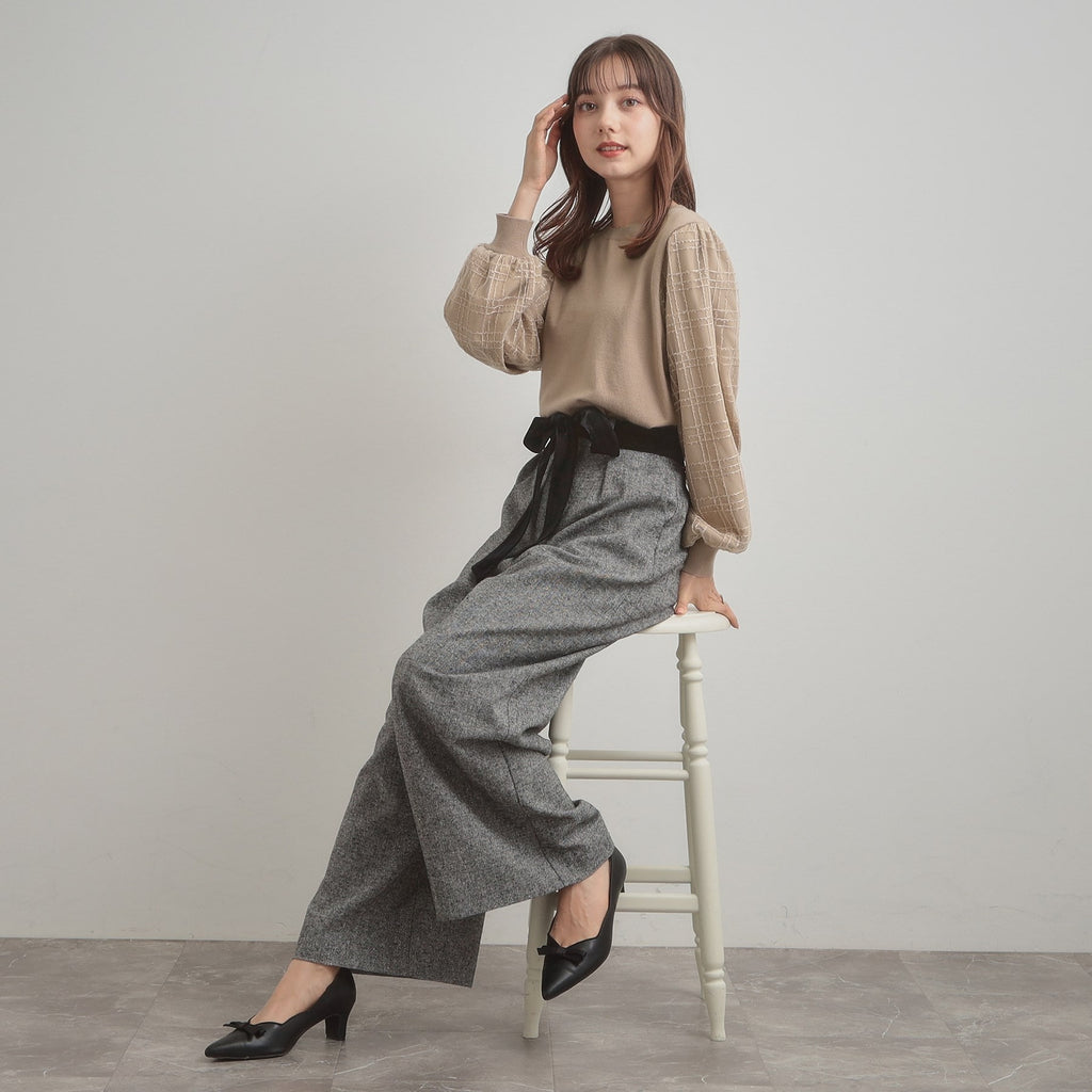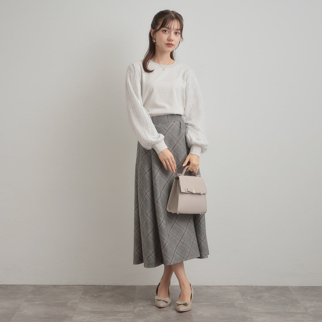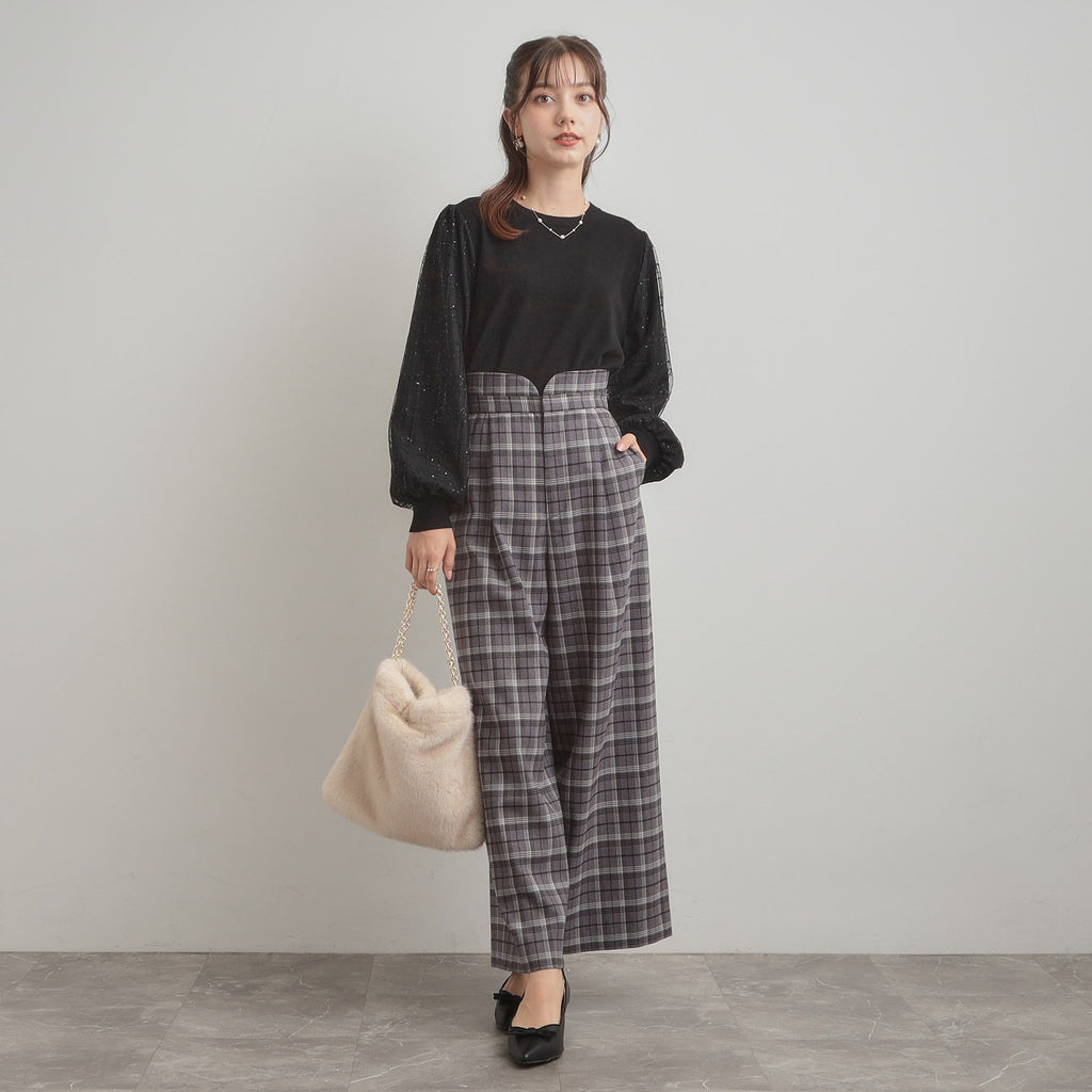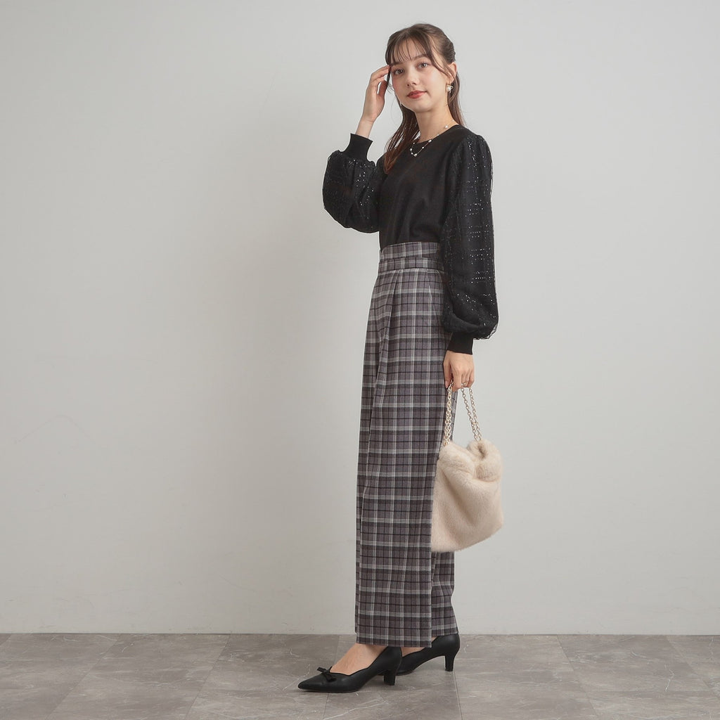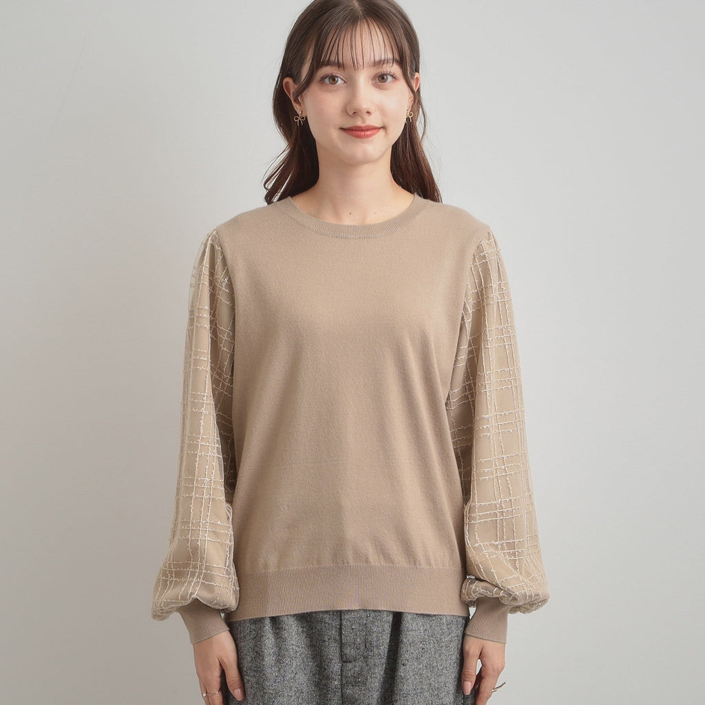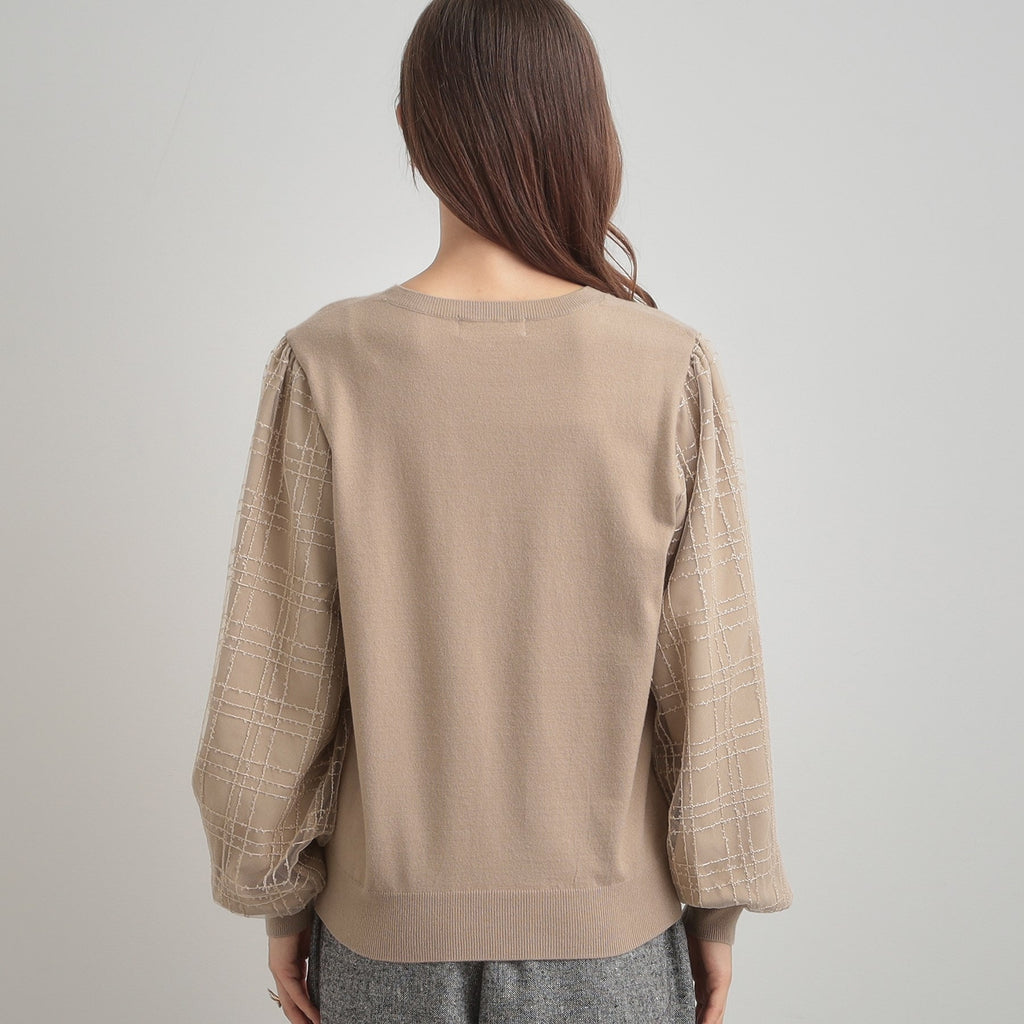 本體部分採用柔軟的天竺編織針織,袖子則是上品閃爍的亮片格紋蕾絲材質,搭配透氣性較低的喬其紗設計。
