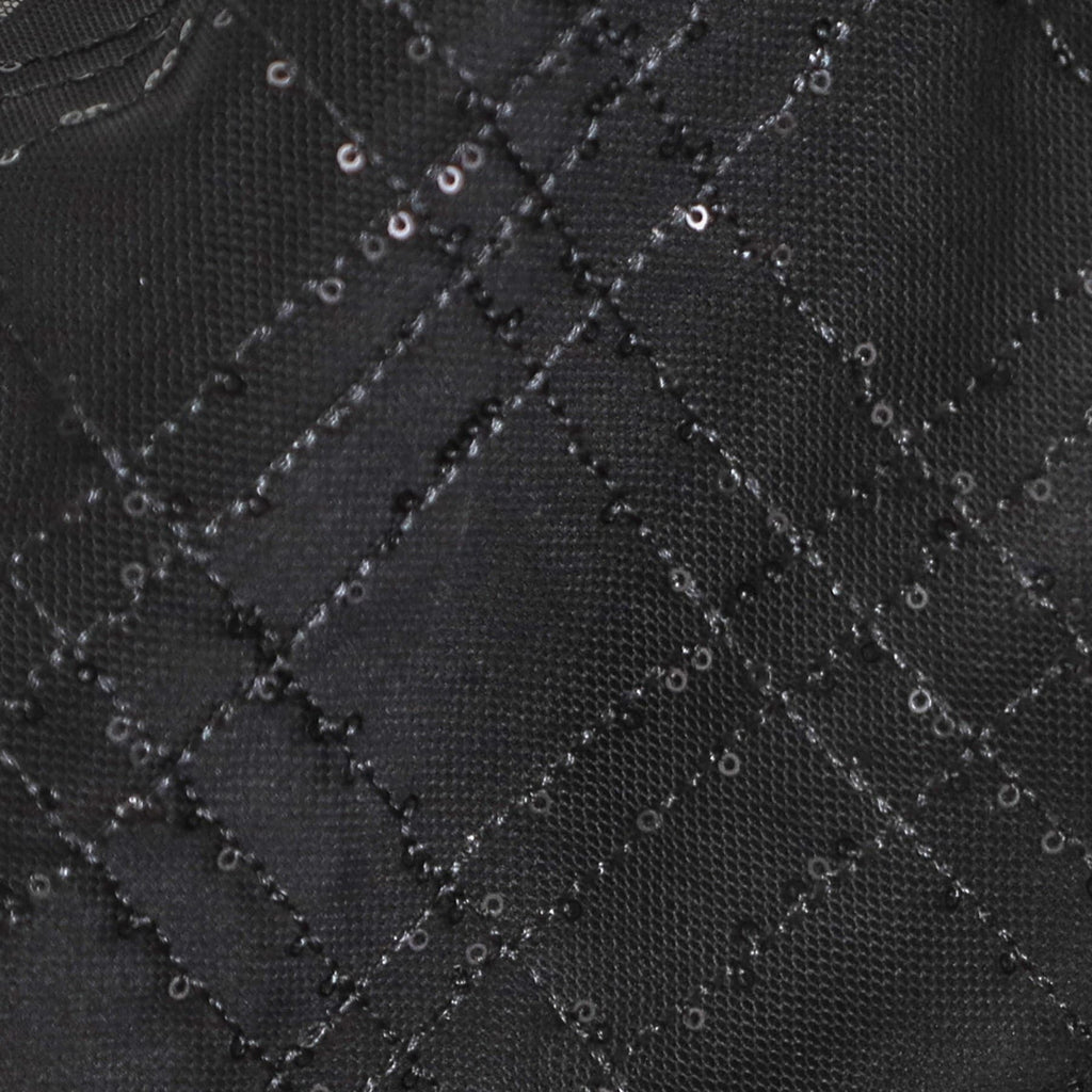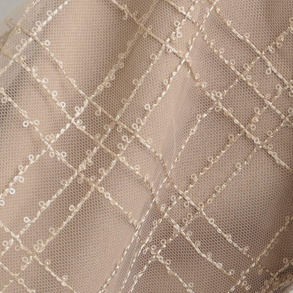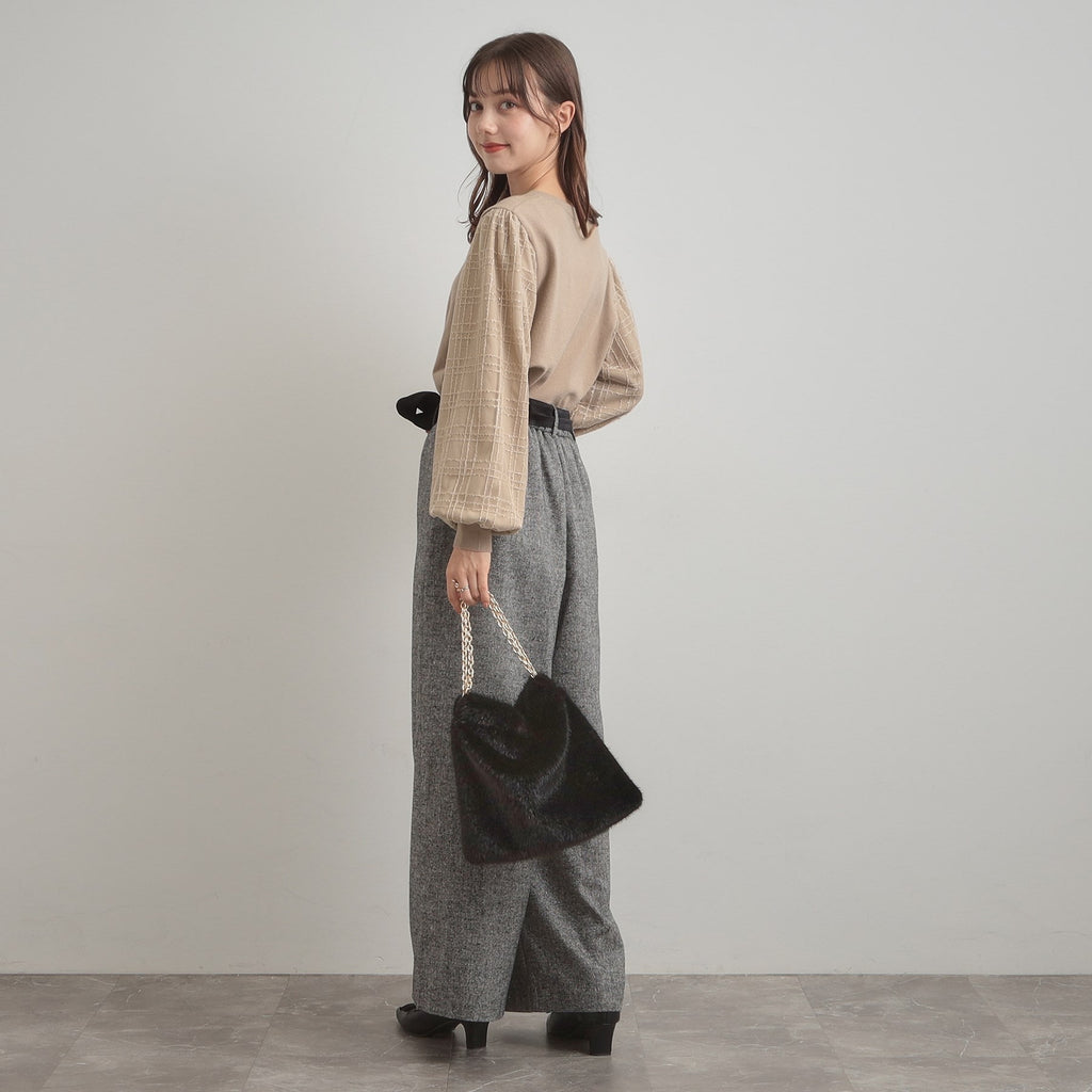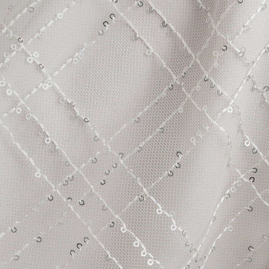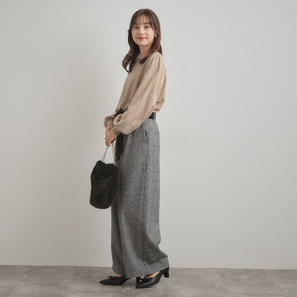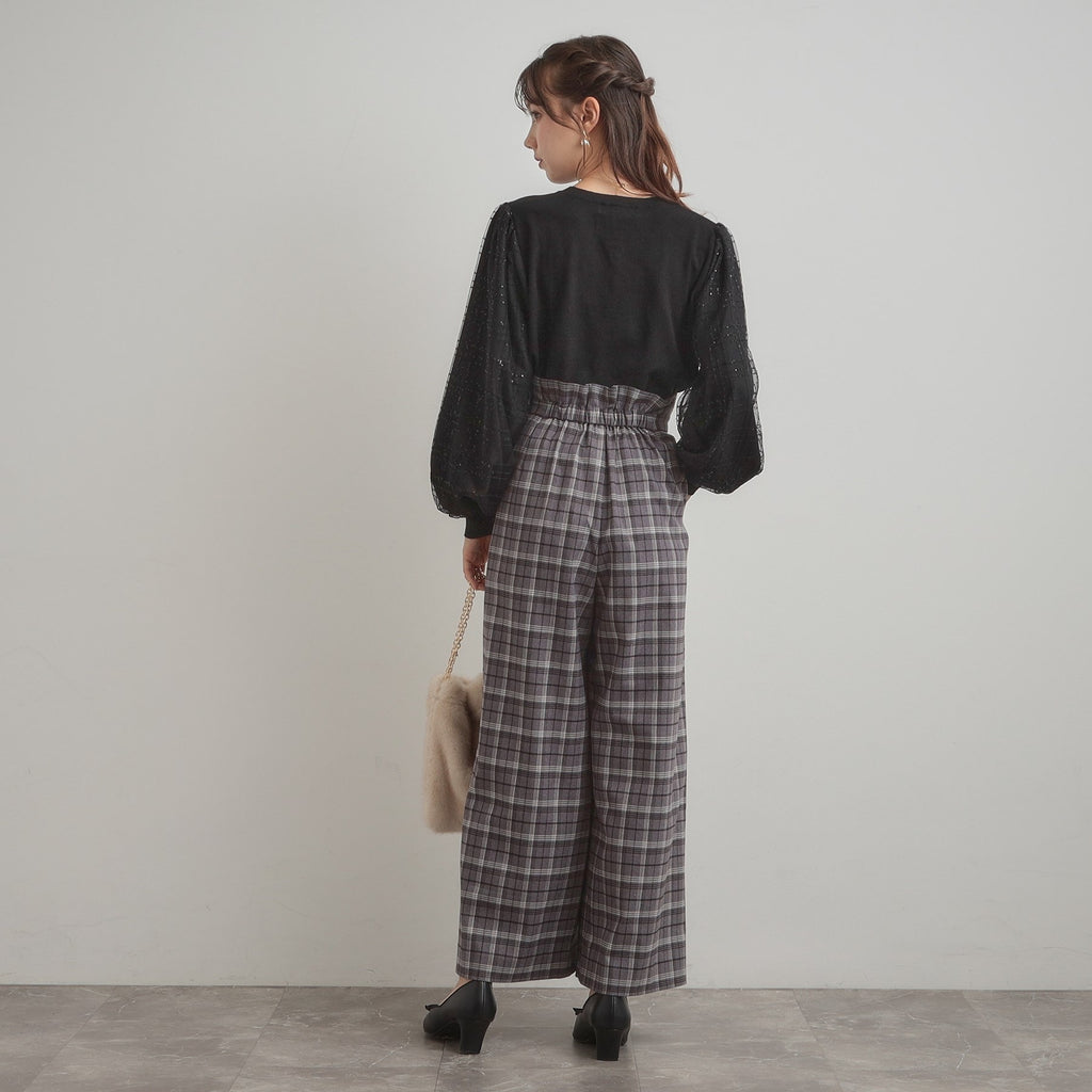 本體部分採用柔軟的天竺編織針織,袖子則是上品閃爍的亮片格紋蕾絲材質,搭配透氣性較低的喬其紗設計。