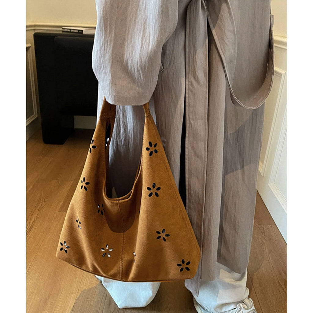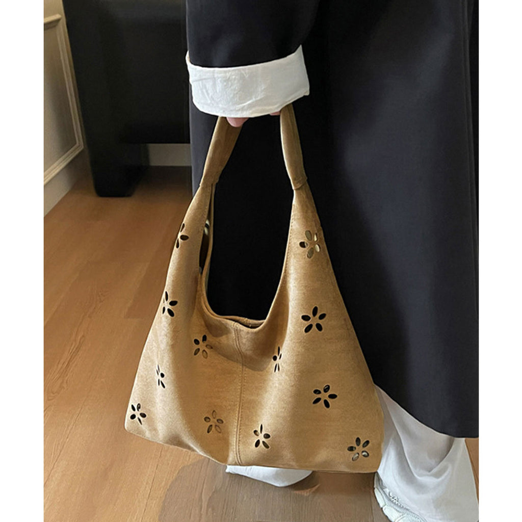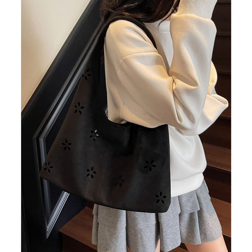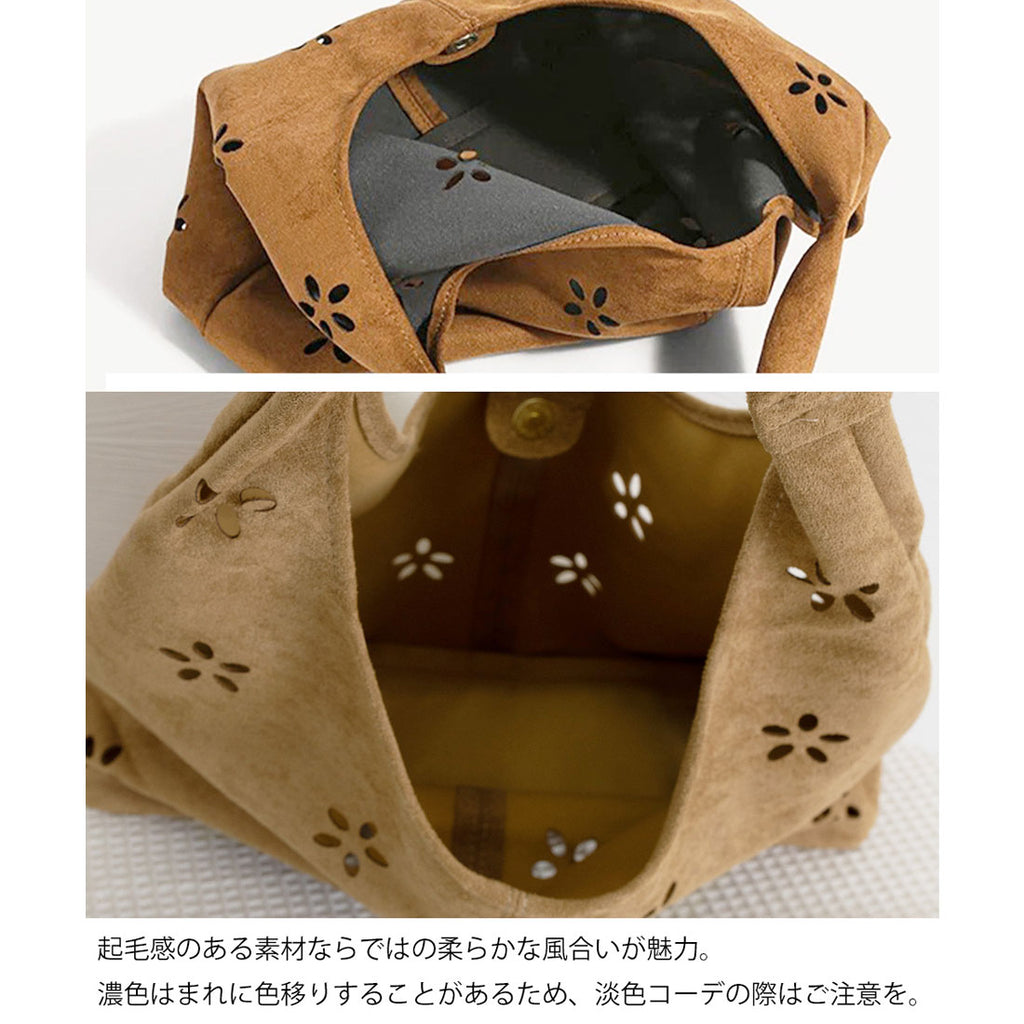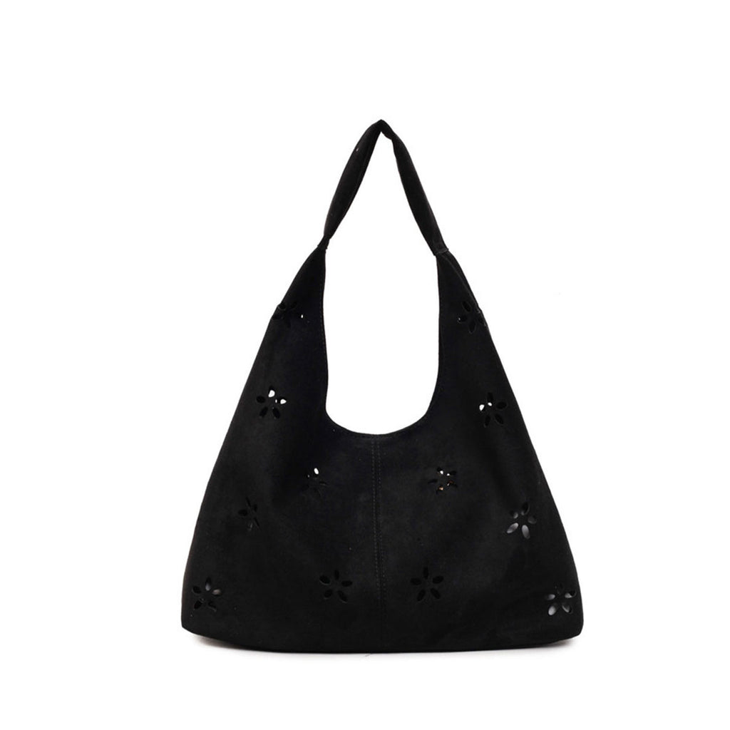 レディース フラワーカット手提げかばん おしゃれ肩掛けカバン レトロ 麂皮ライクハンドバッグ 大人可愛い秋冬バッグ黑