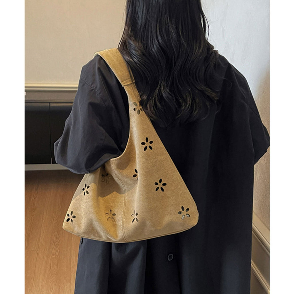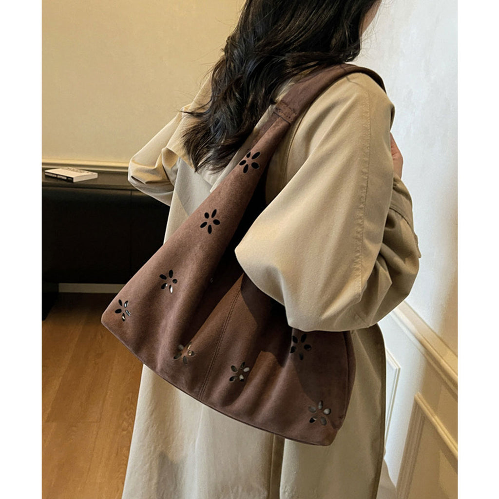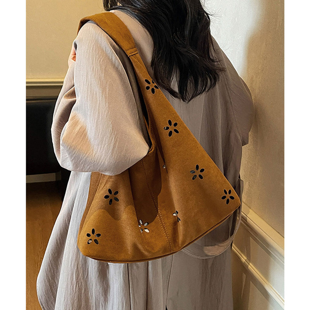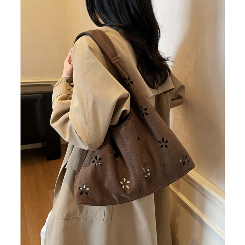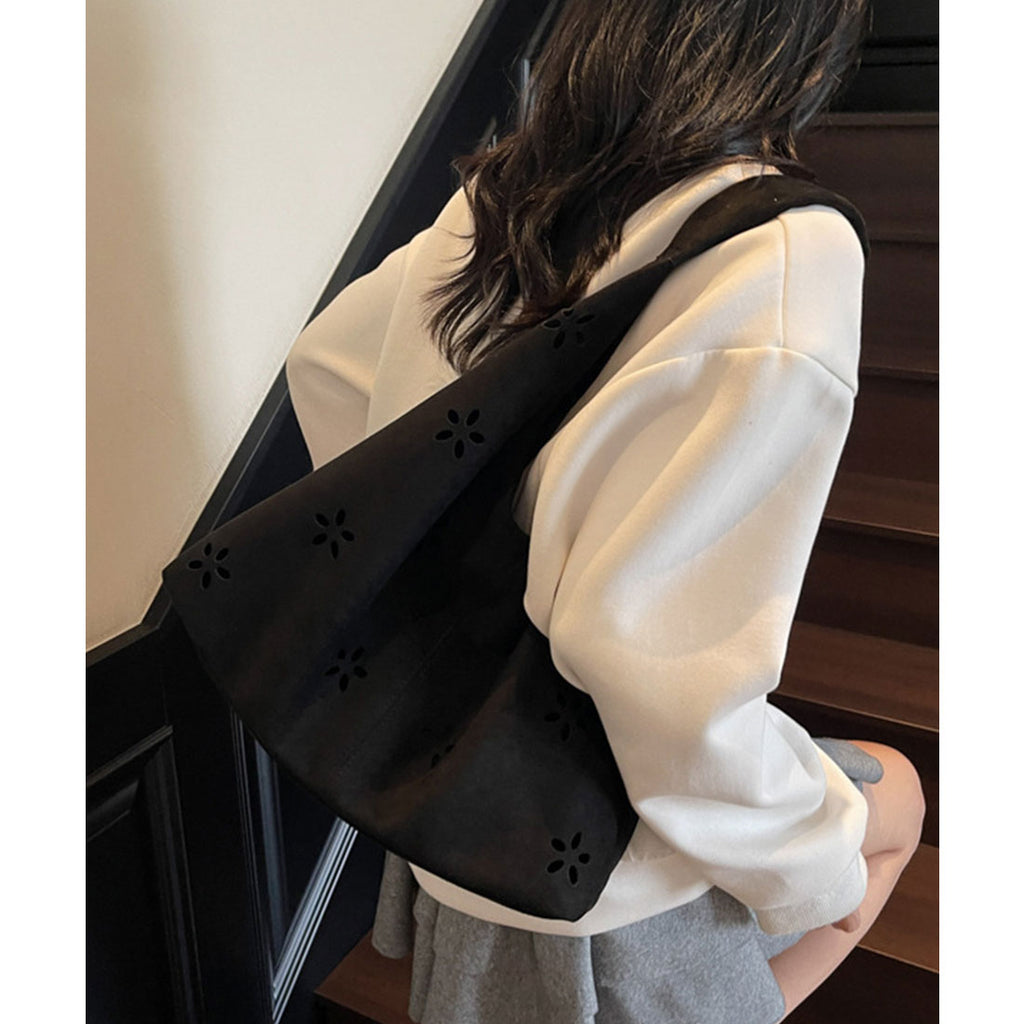 レディース フラワーカット手提げかばん おしゃれ肩掛けカバン レトロ 麂皮ライクハンドバッグ 大人可愛い秋冬バッグ黑