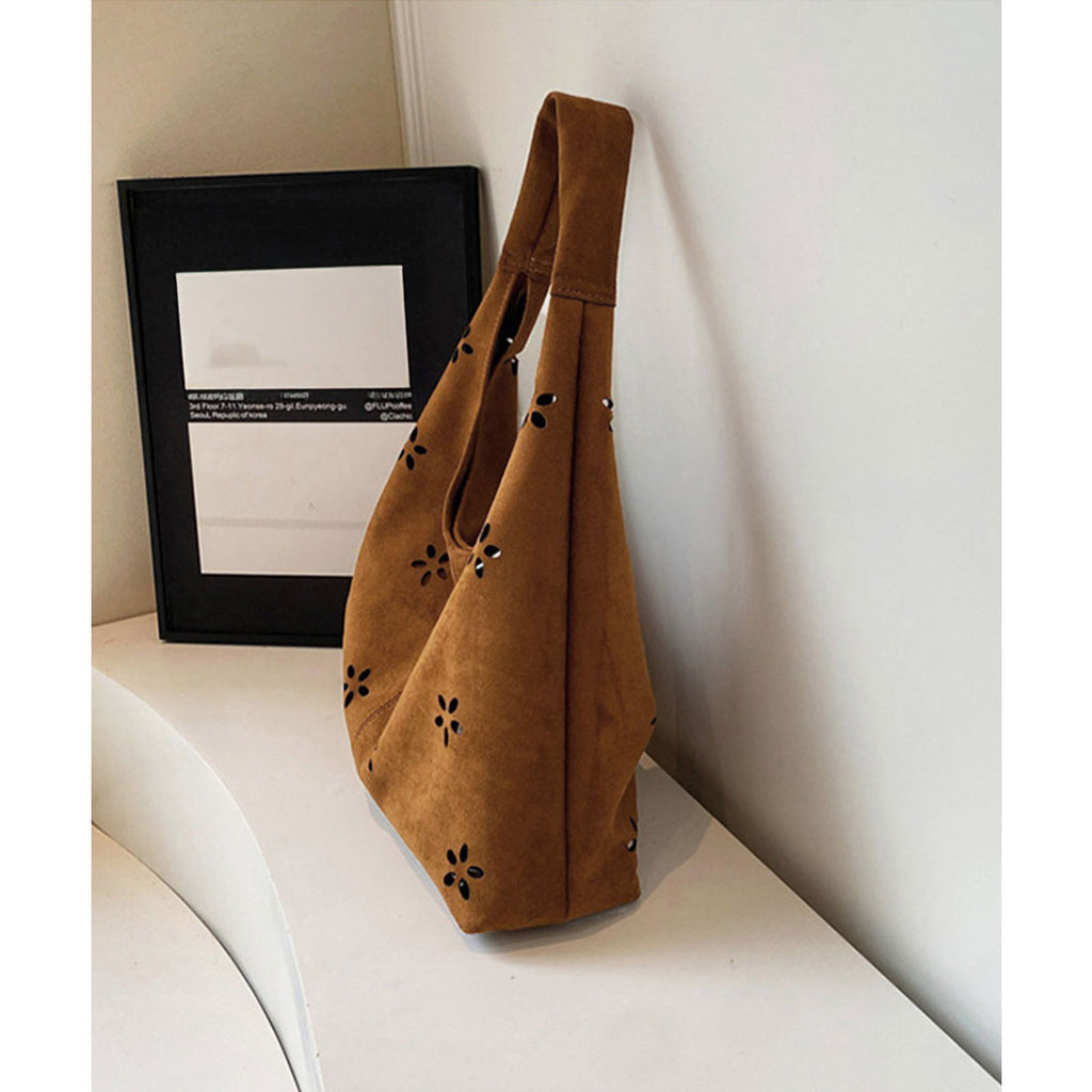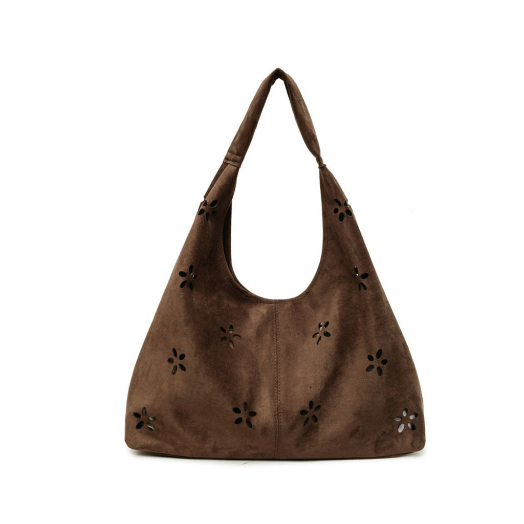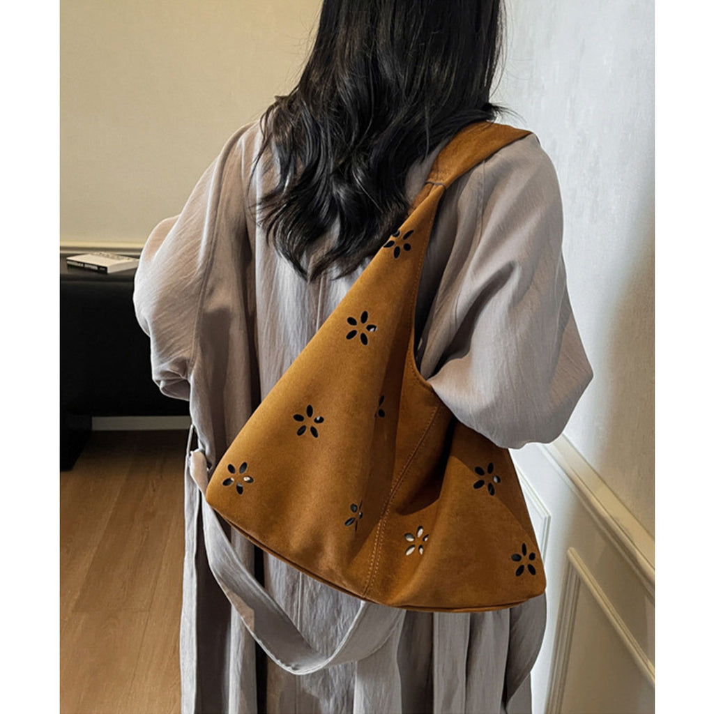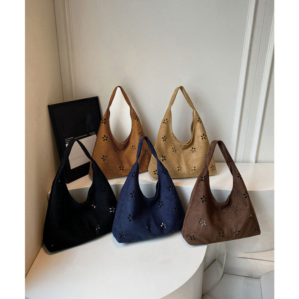 レディース フラワーカット手提げかばん おしゃれ肩掛けカバン レトロ 麂皮ライクハンドバッグ 大人可愛い秋冬バッグ黑