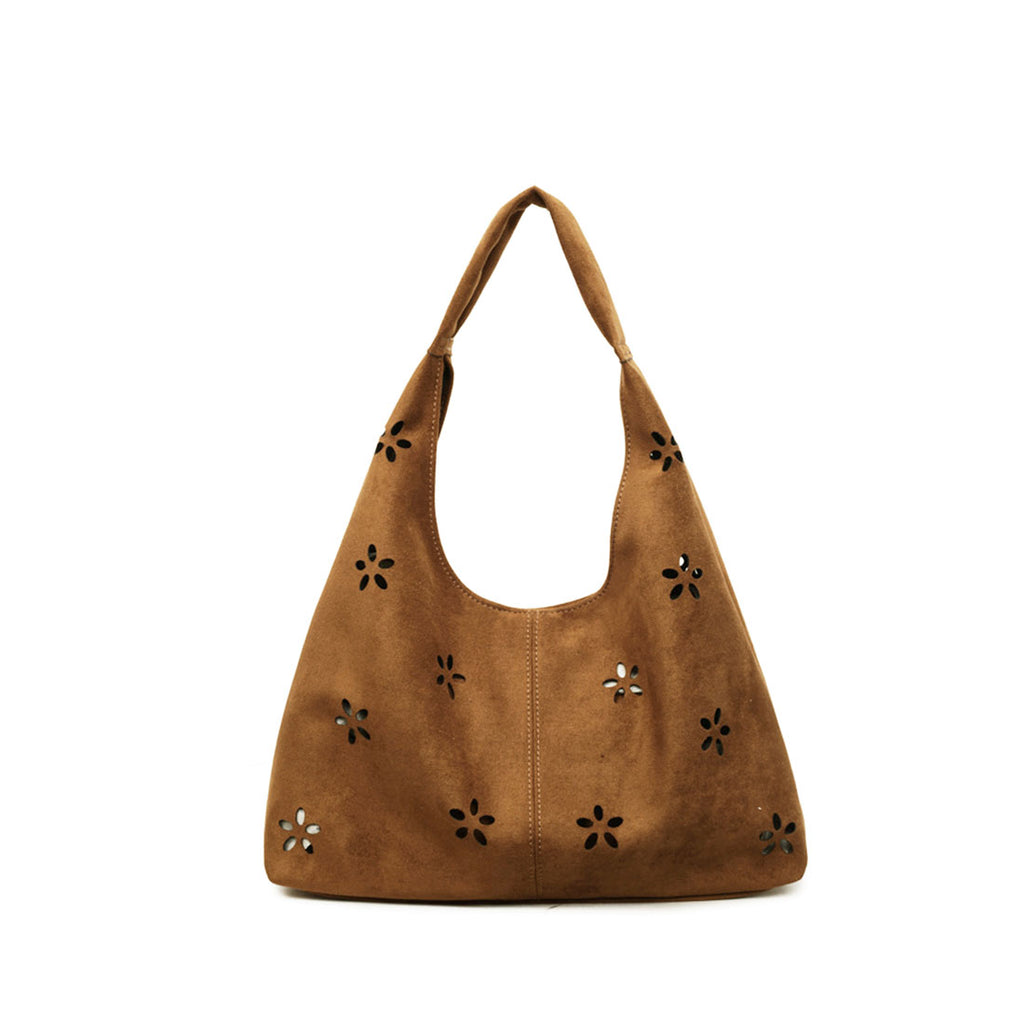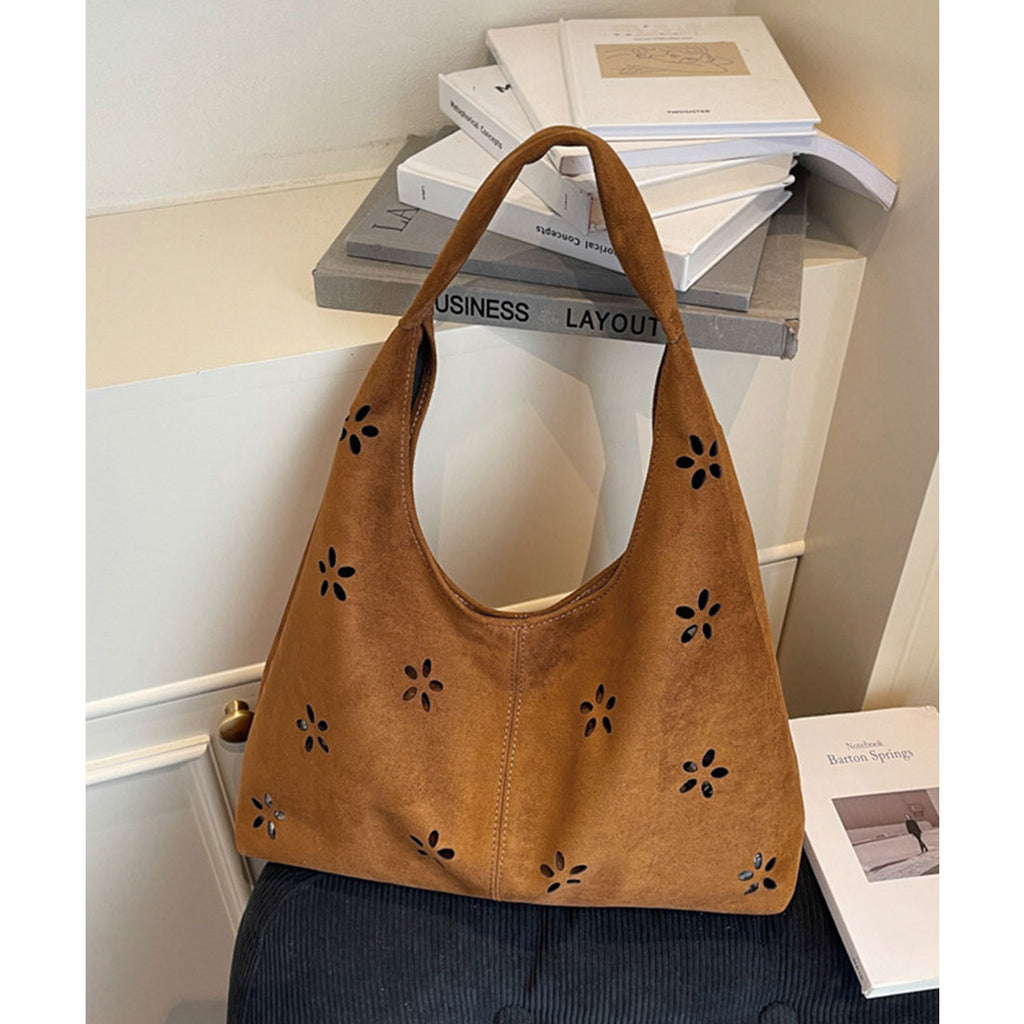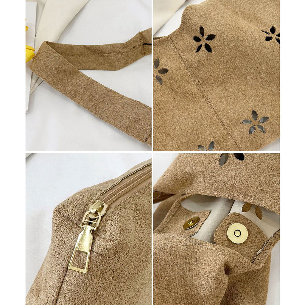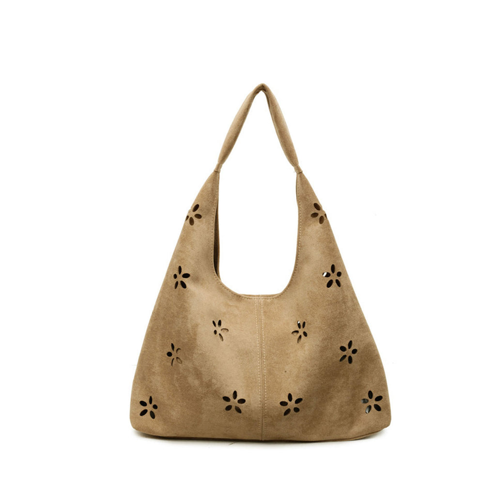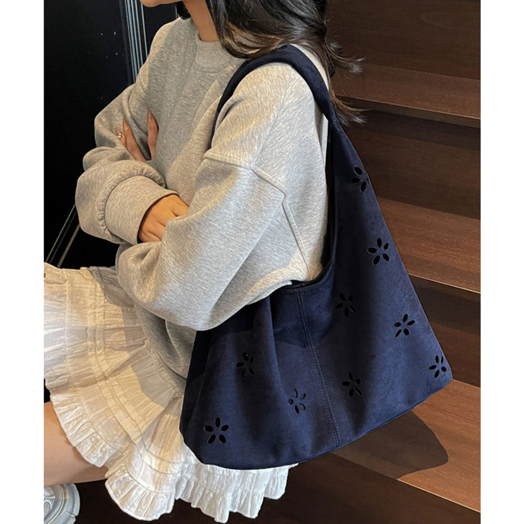 レディース フラワーカット手提げかばん おしゃれ肩掛けカバン レトロ 麂皮ライクハンドバッグ 大人可愛い秋冬バッグ黑