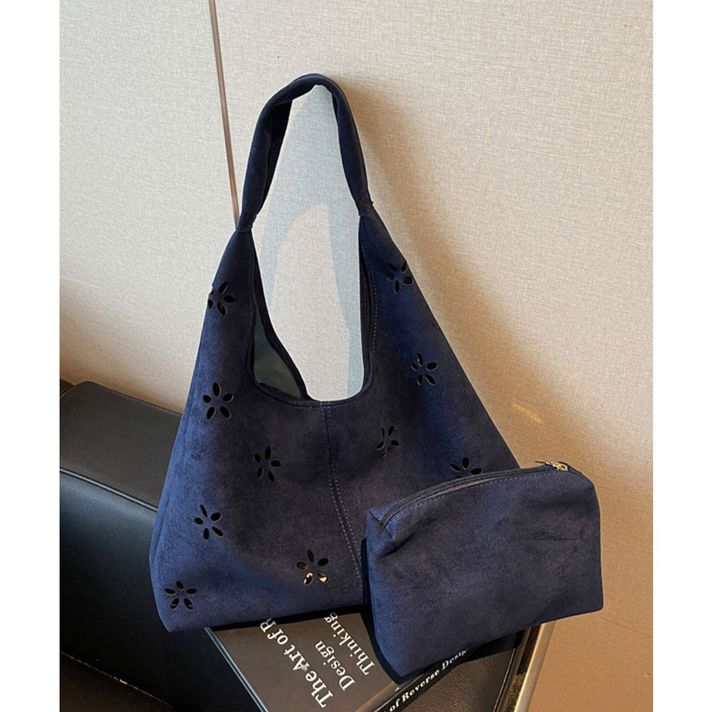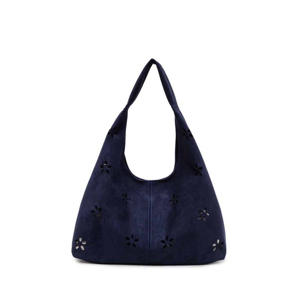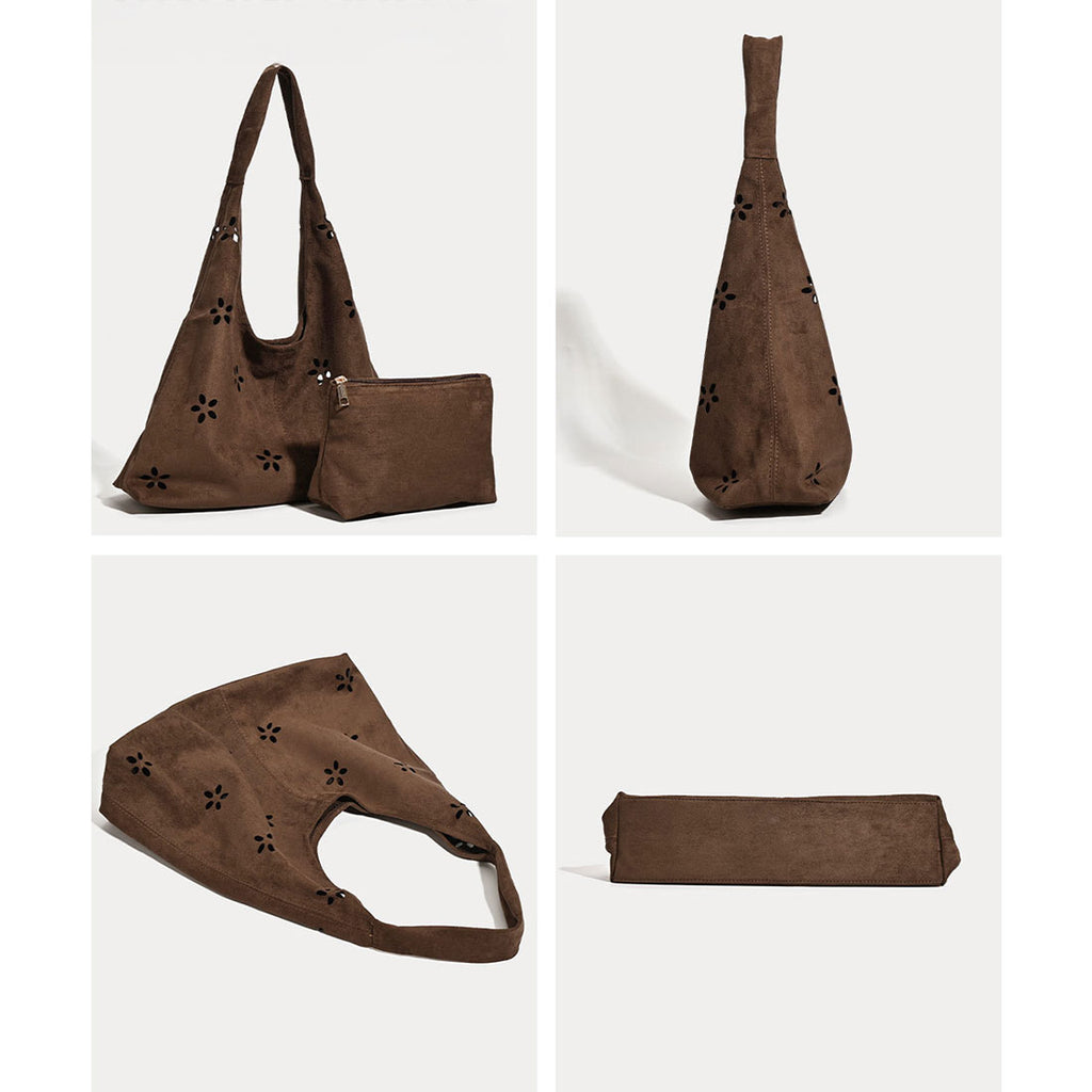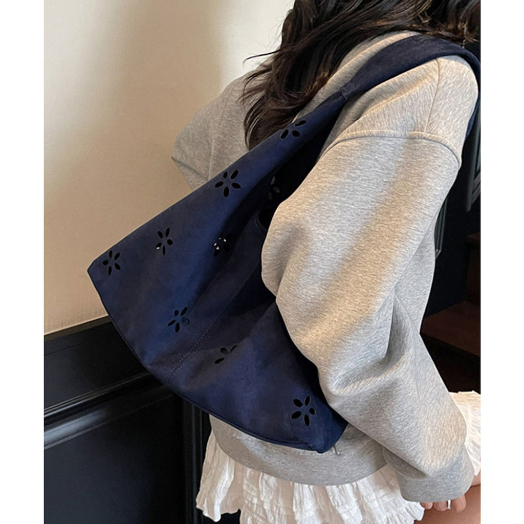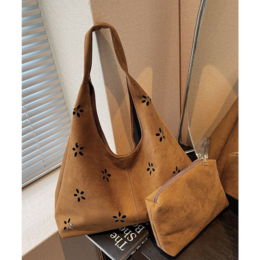 レディース フラワーカット手提げかばん おしゃれ肩掛けカバン レトロ 麂皮ライクハンドバッグ 大人可愛い秋冬バッグ黑