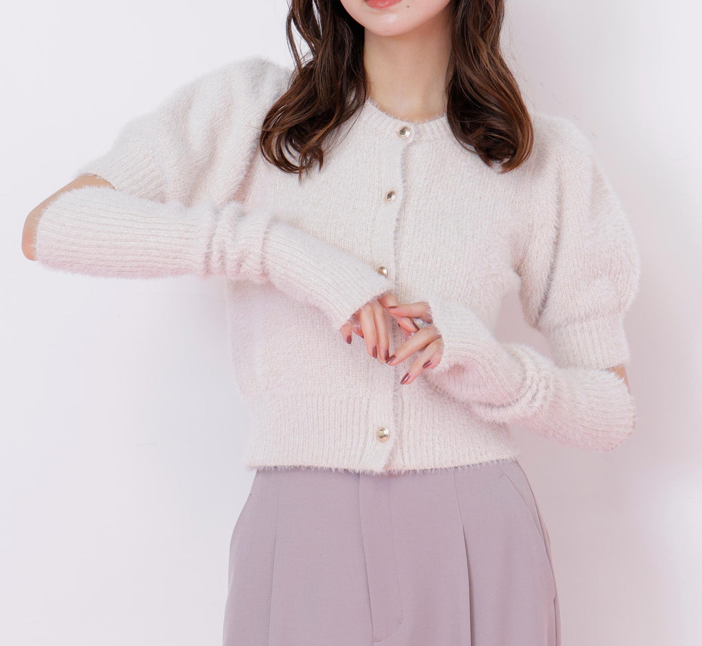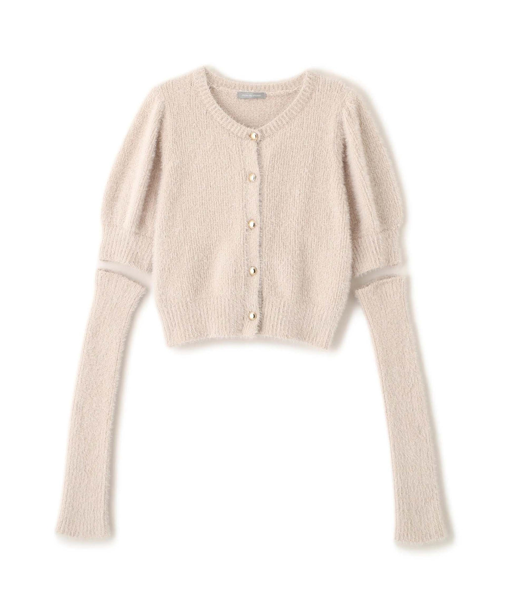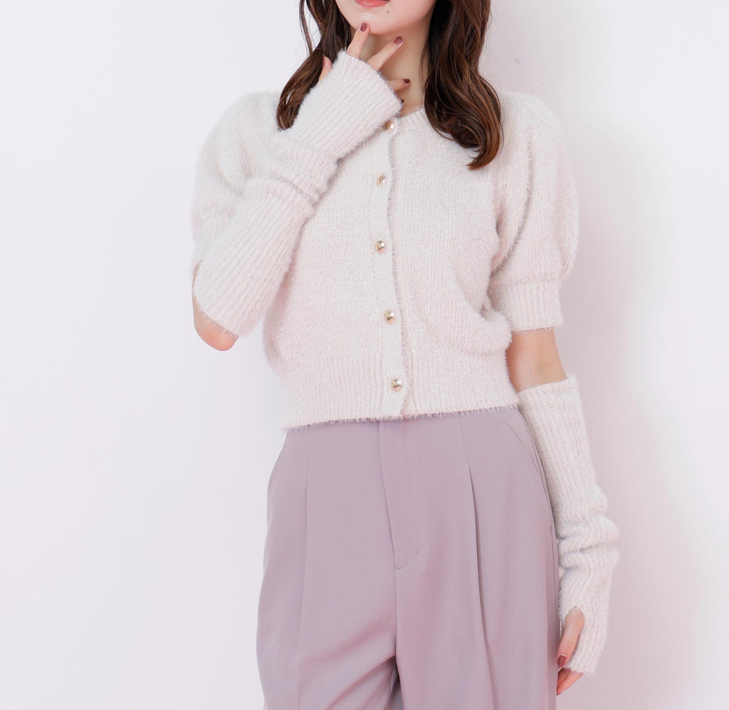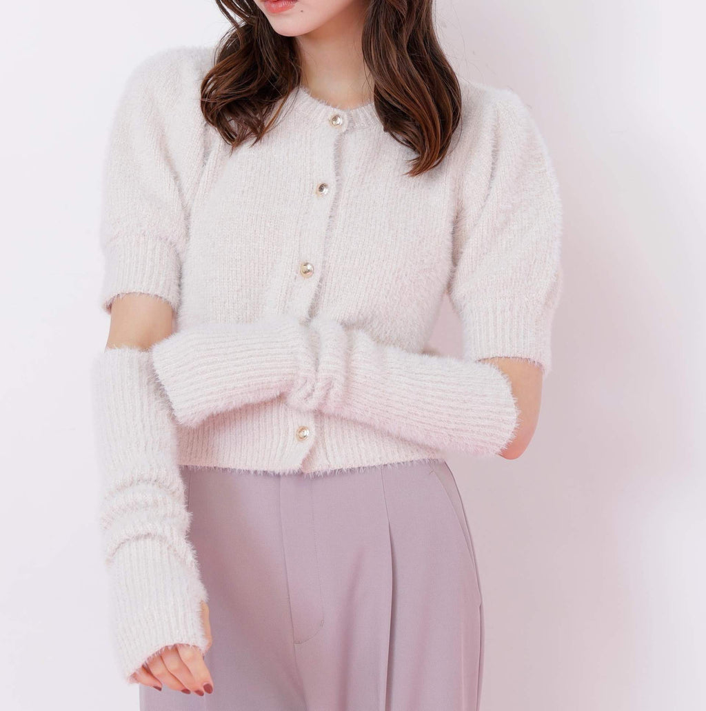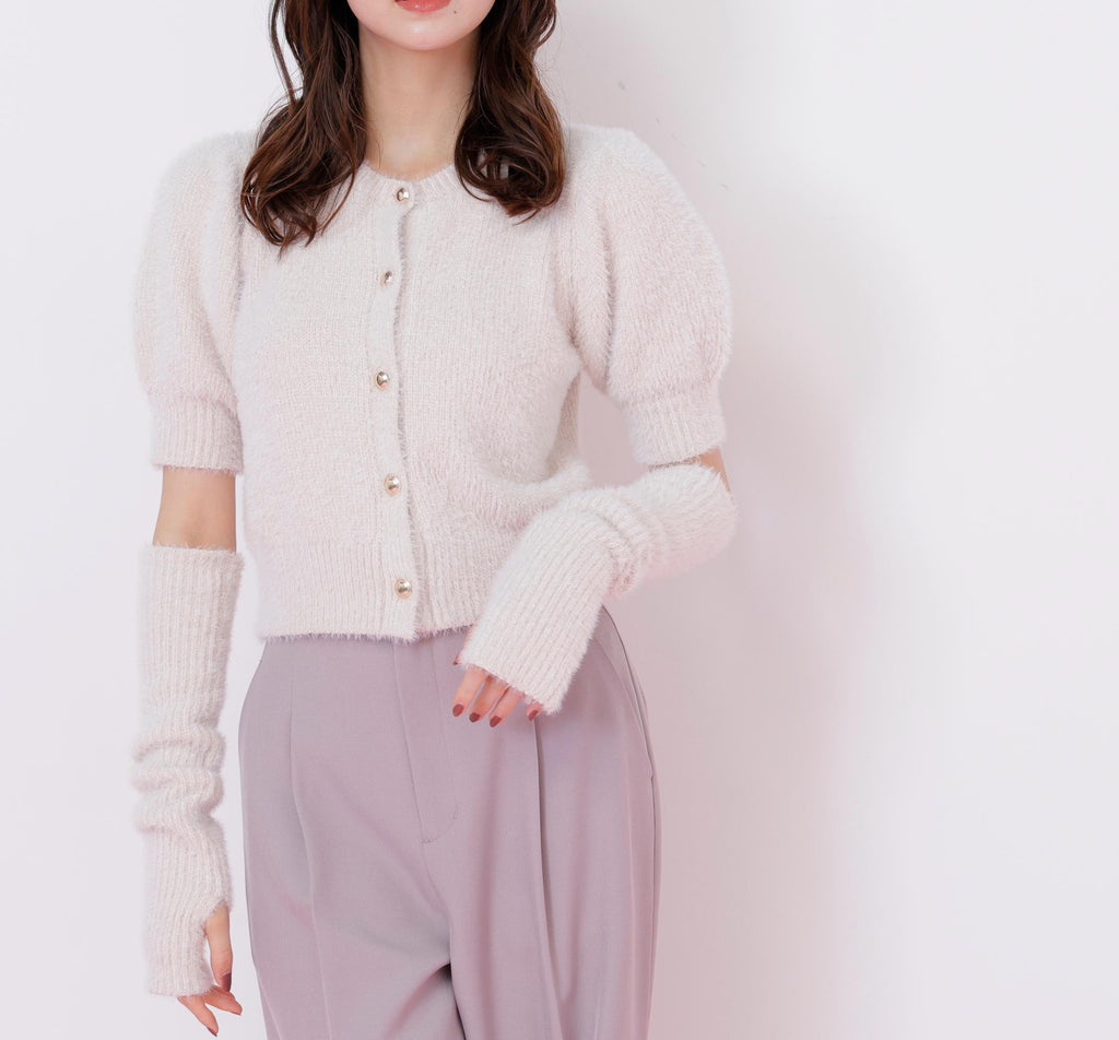 秋冬氛圍高漲的質感為搭配增添亮點的開襟毛衣上衣。閃光球和短款羽毛紗線交織編織而成的原創編織。拆下手臂保暖器後,也可以作為短袖開襟毛衣穿搭。與格子裙、層層裙和迷你下著都非常搭配。※由於拍攝時的照明原因,顏色可能會看起來不同。