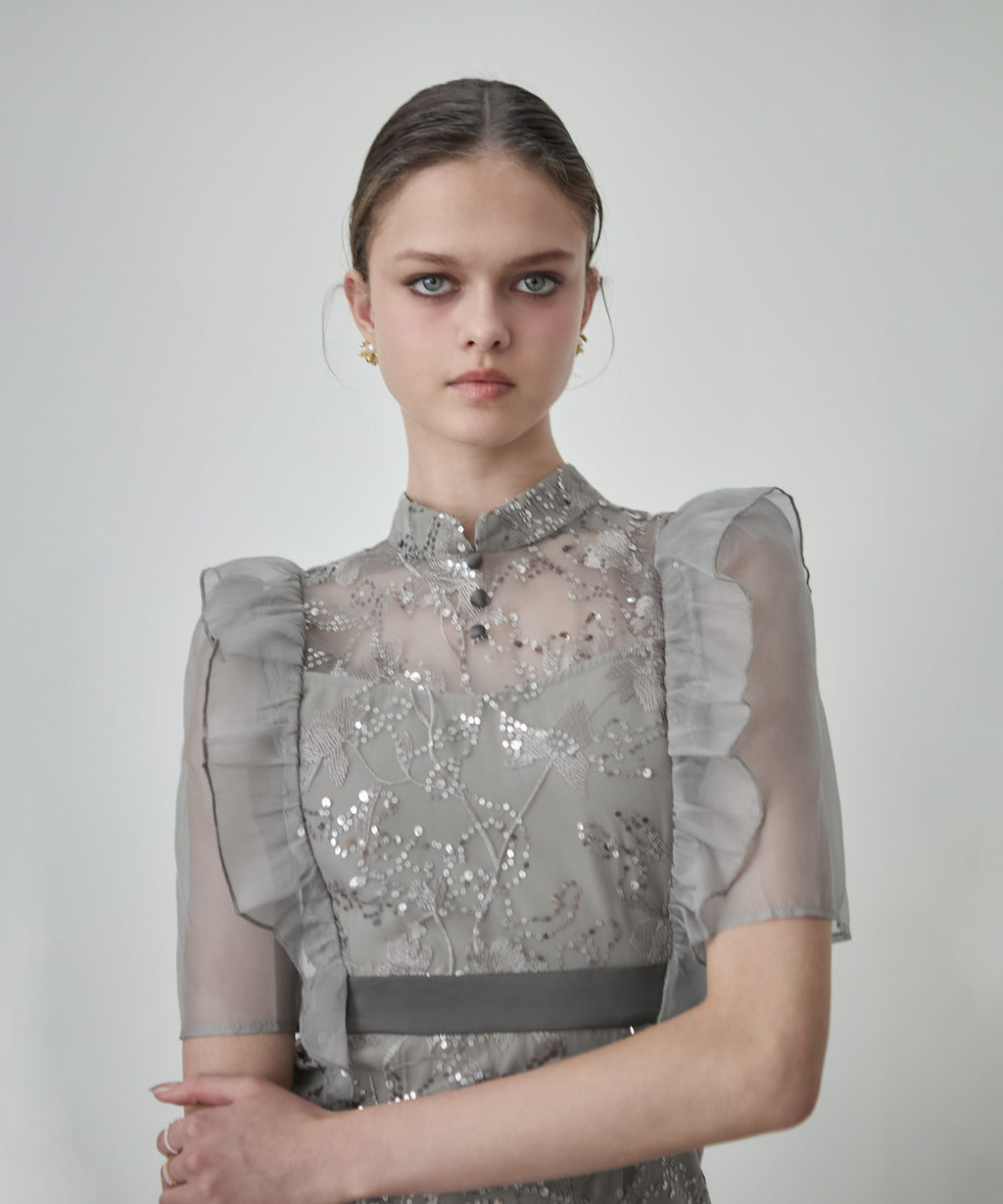袖子使用適度透視的歐根紗材質,展現輕盈與優雅。