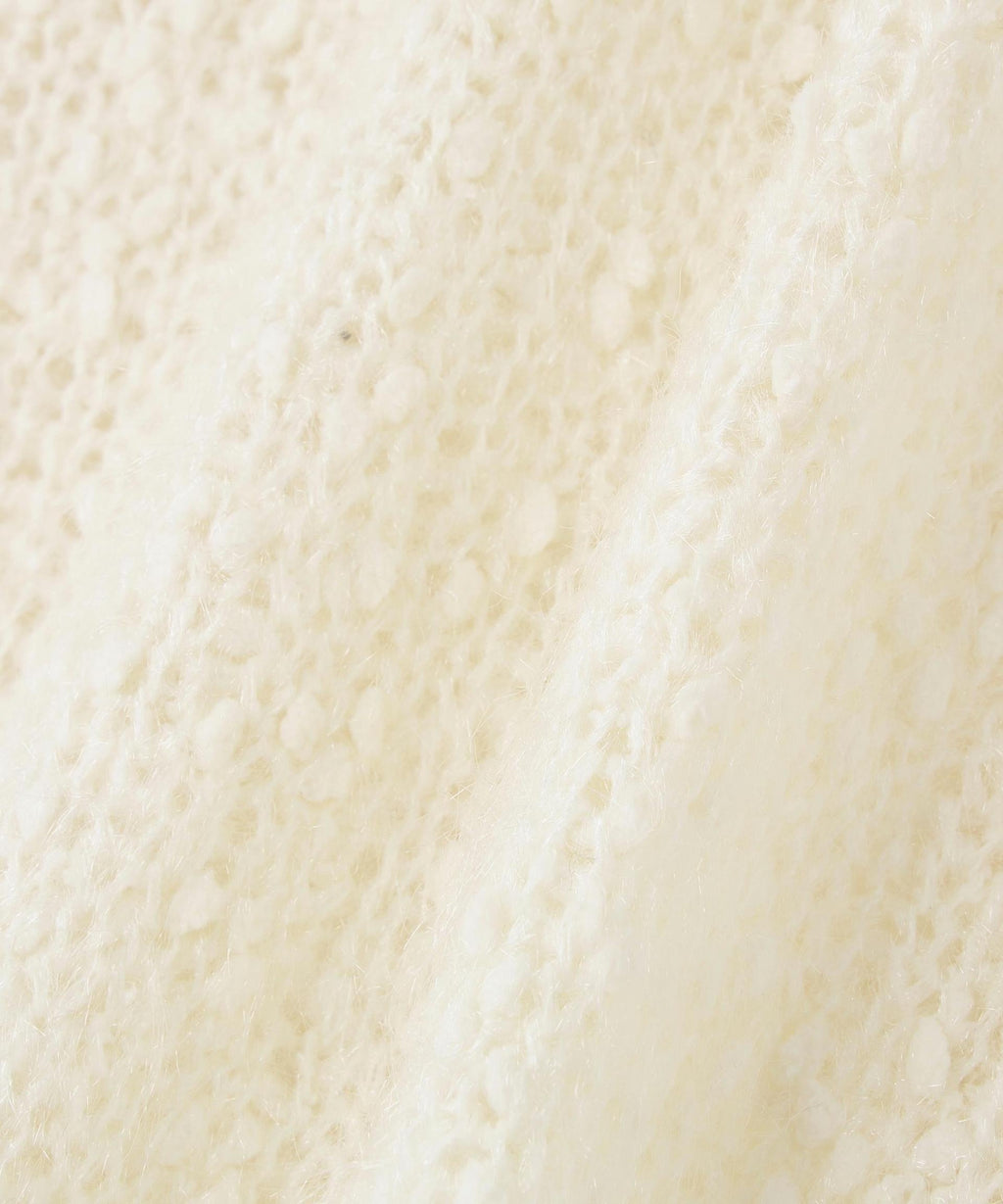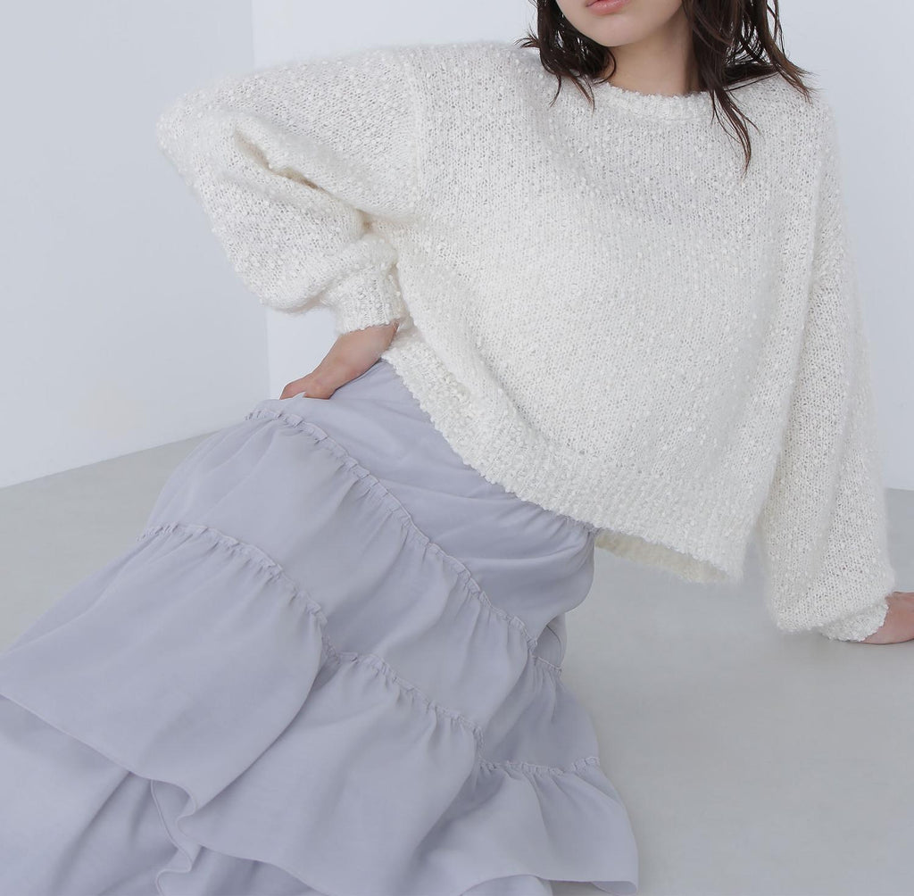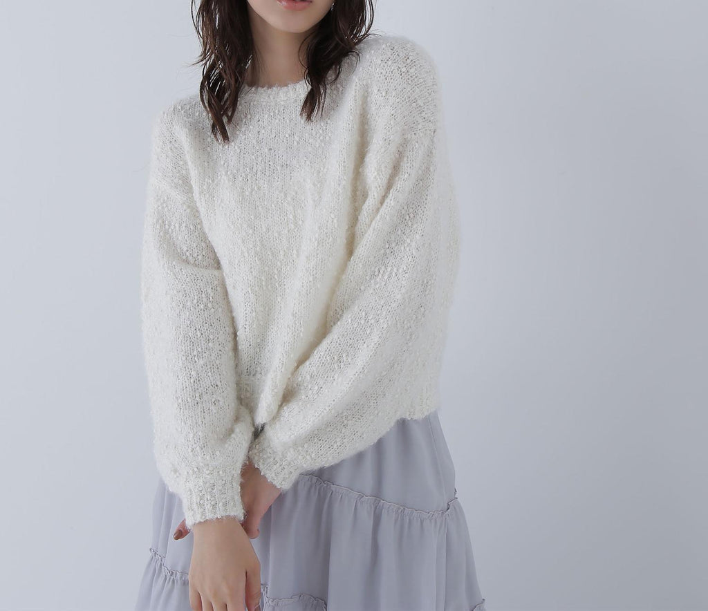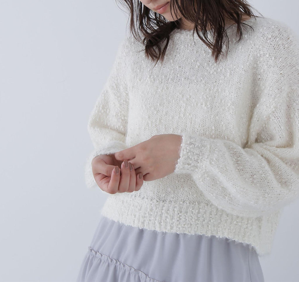 這是一種由輕盈的羽毛和紗線纏繞而成的表情豐富的針織物。袖子有些微的蓬鬆感,展現出女性化的印象。開放感的領口也增添了女性魅力。因為長度適中,即使不將上衣塞進下裝也能穿得很好,所以不受造型限制。