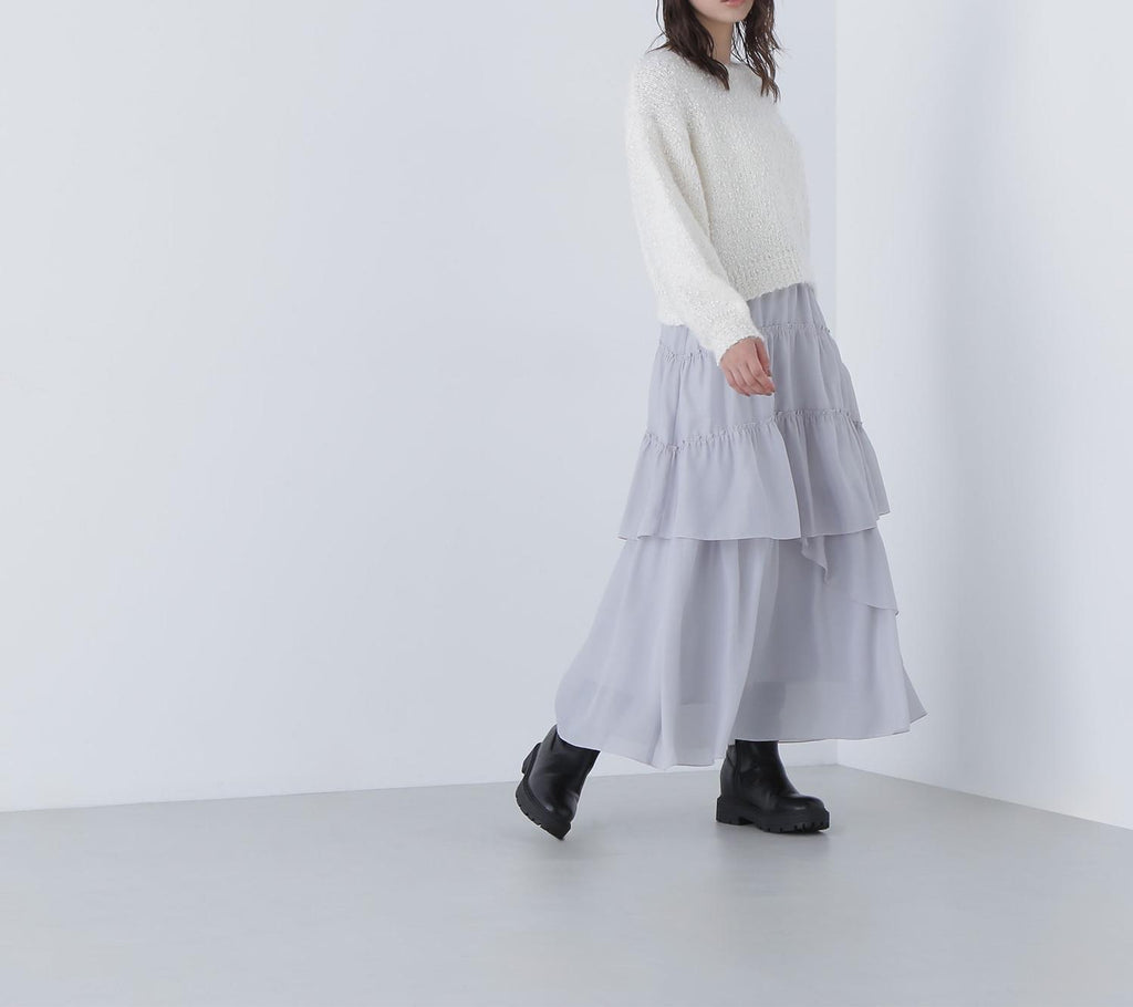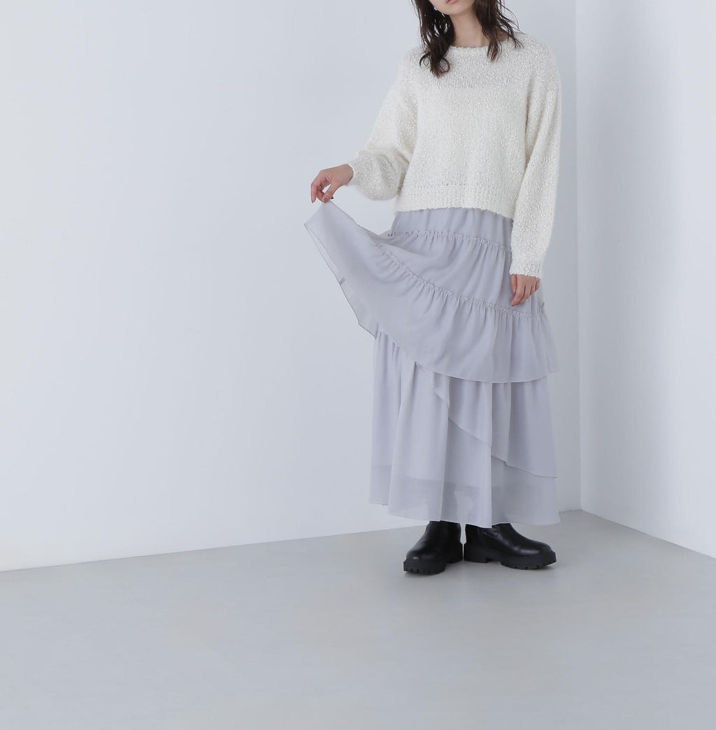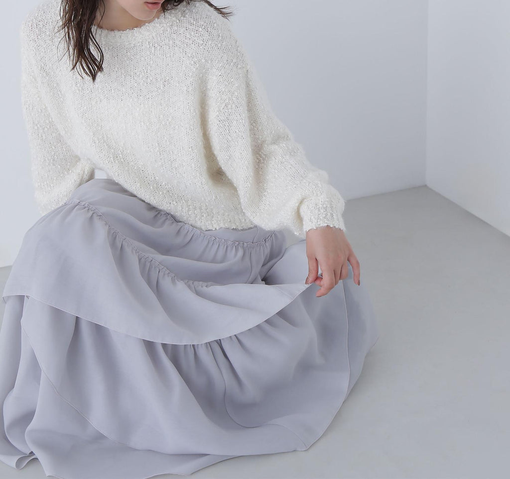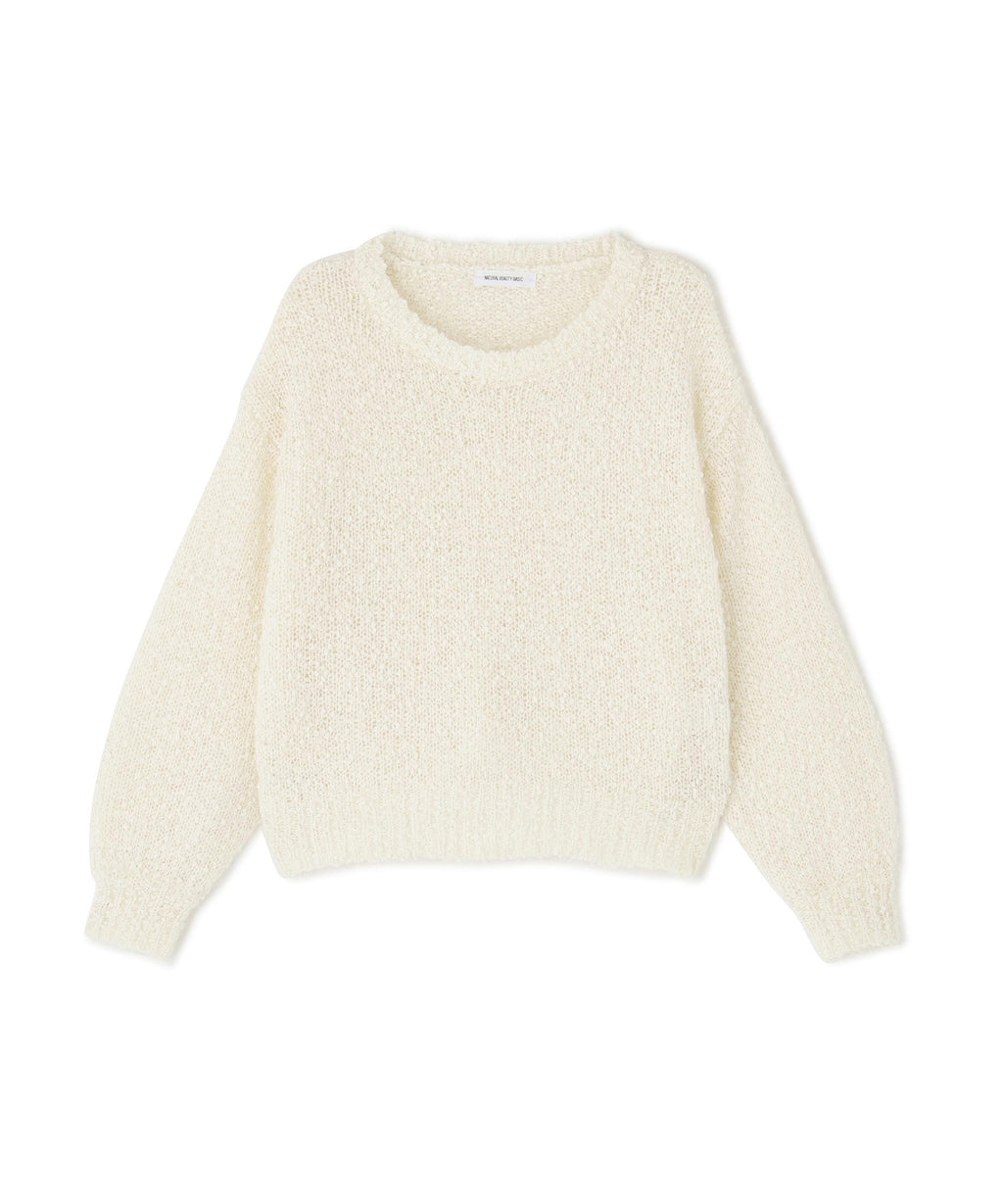 這是一種由輕盈的羽毛和紗線纏繞而成的表情豐富的針織物。袖子有些微的蓬鬆感,展現出女性化的印象。開放感的領口也增添了女性魅力。因為長度適中,即使不將上衣塞進下裝也能穿得很好,所以不受造型限制。