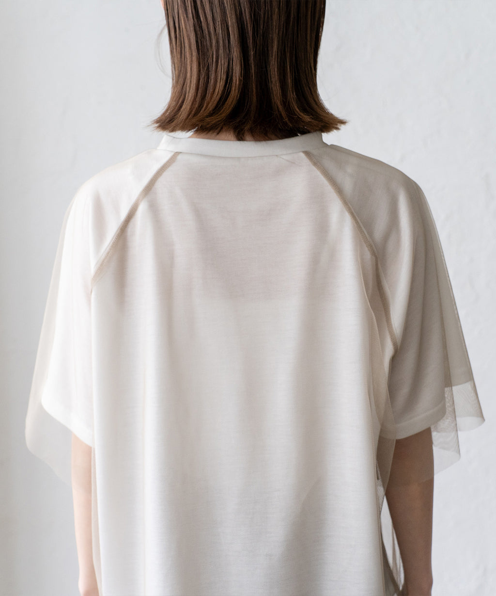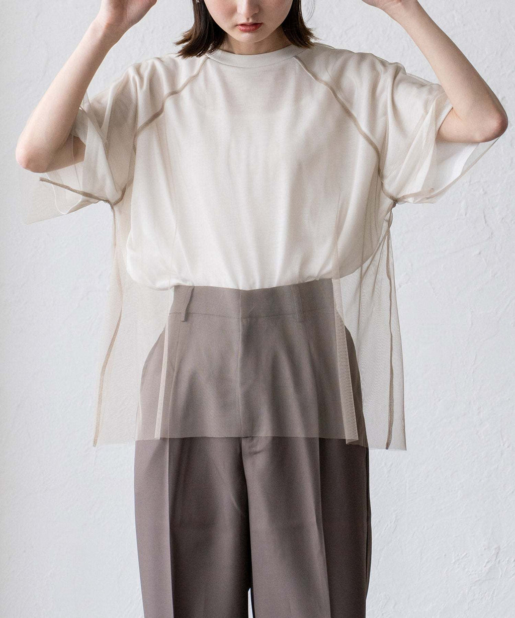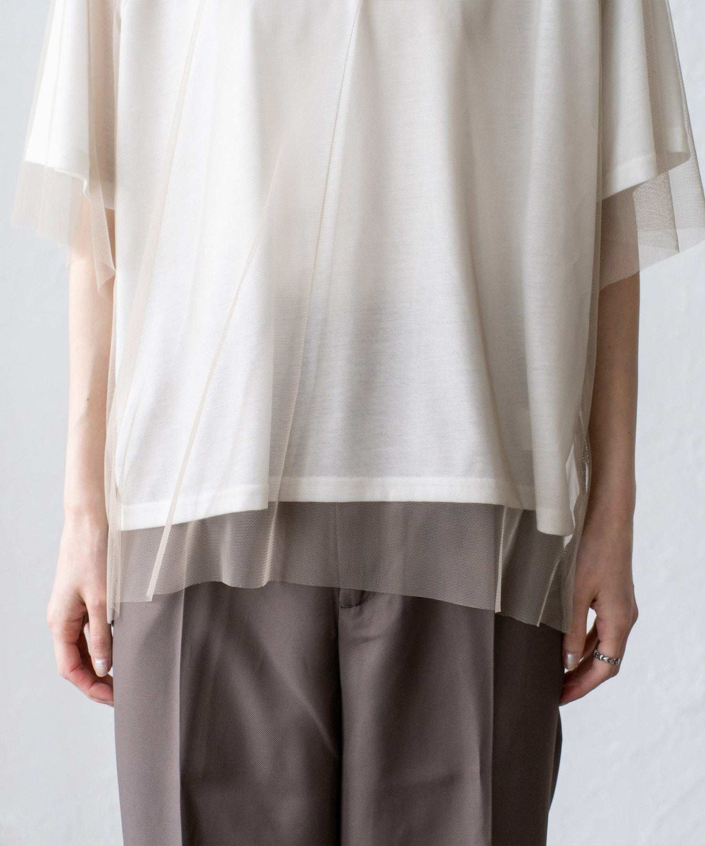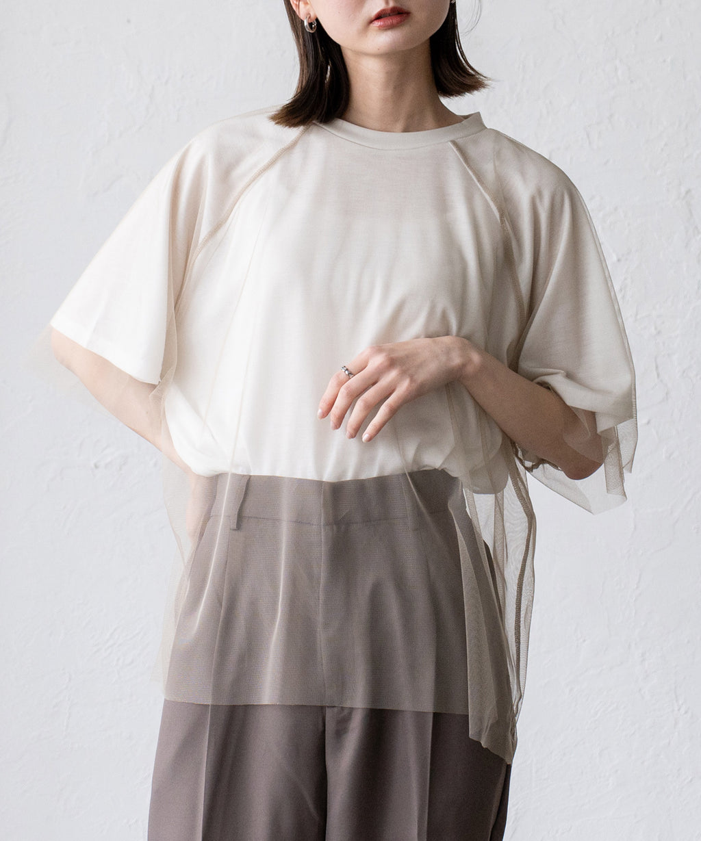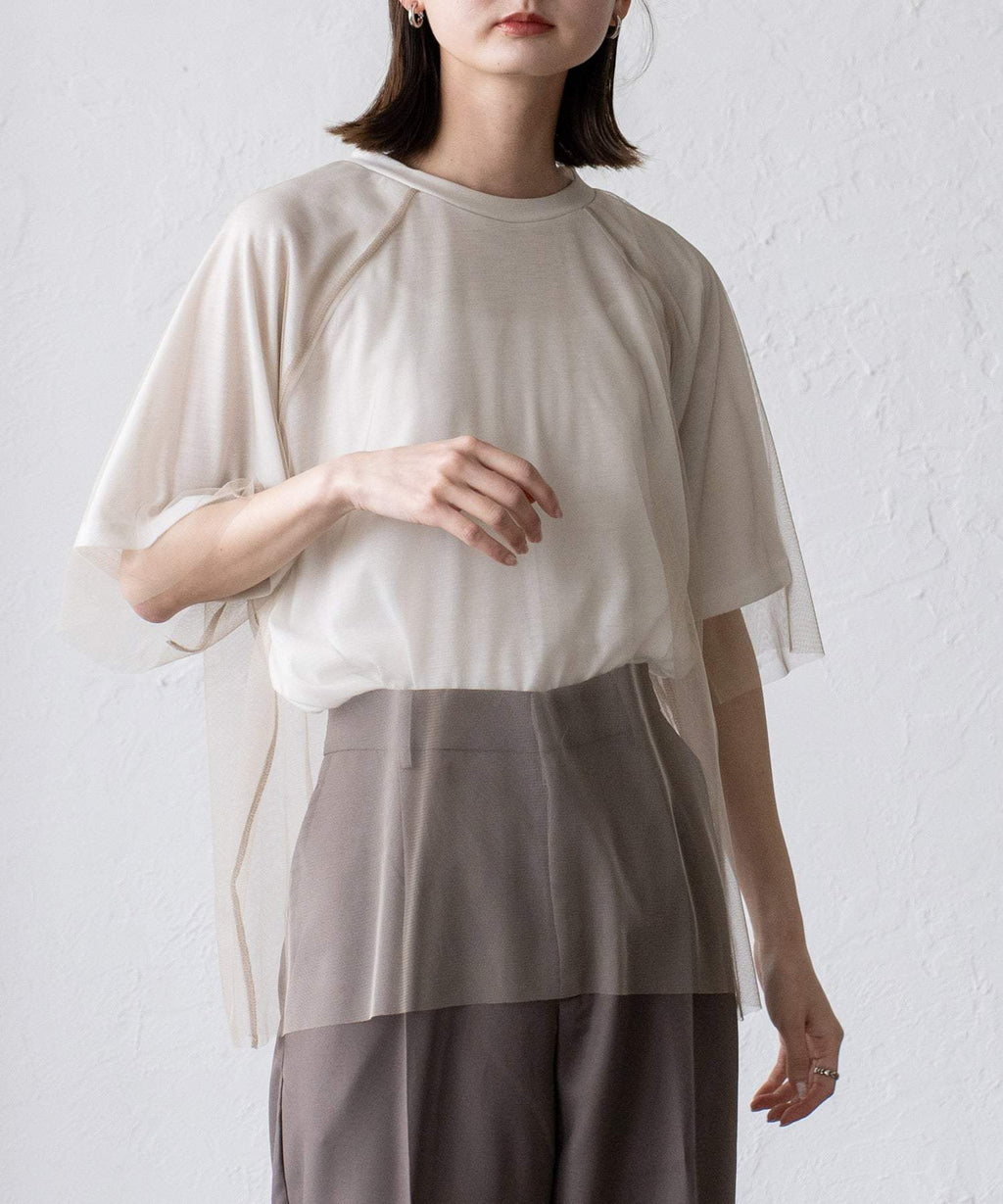 T恤上重疊了透視感的薄紗布料的層次上衣