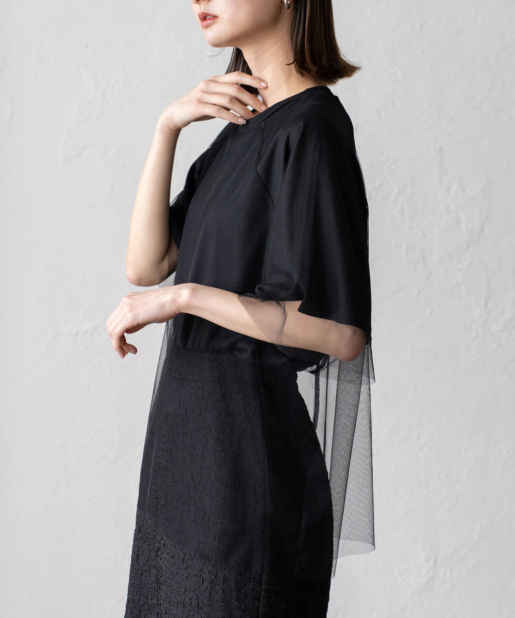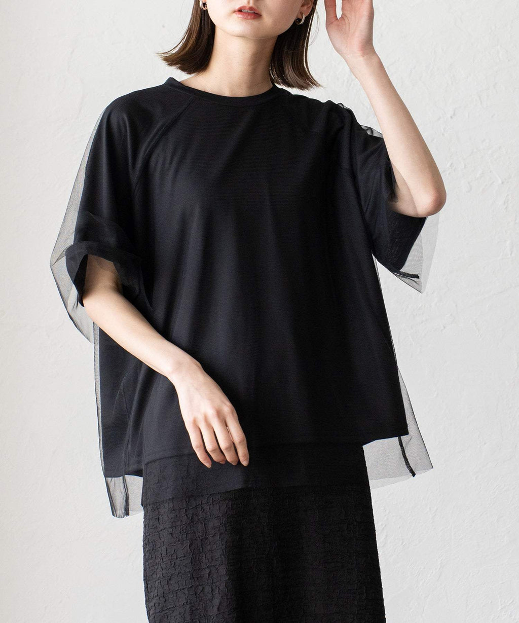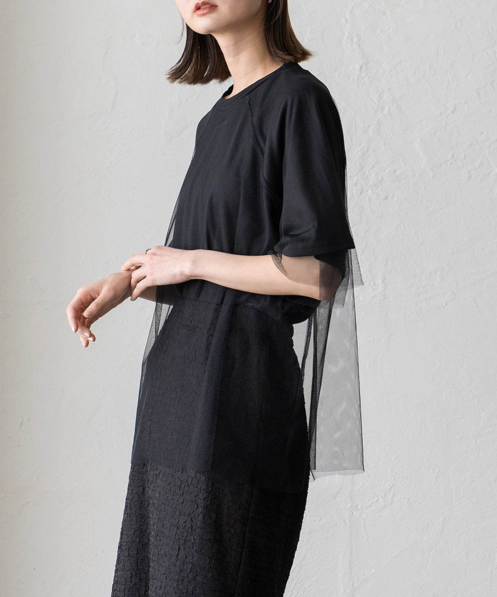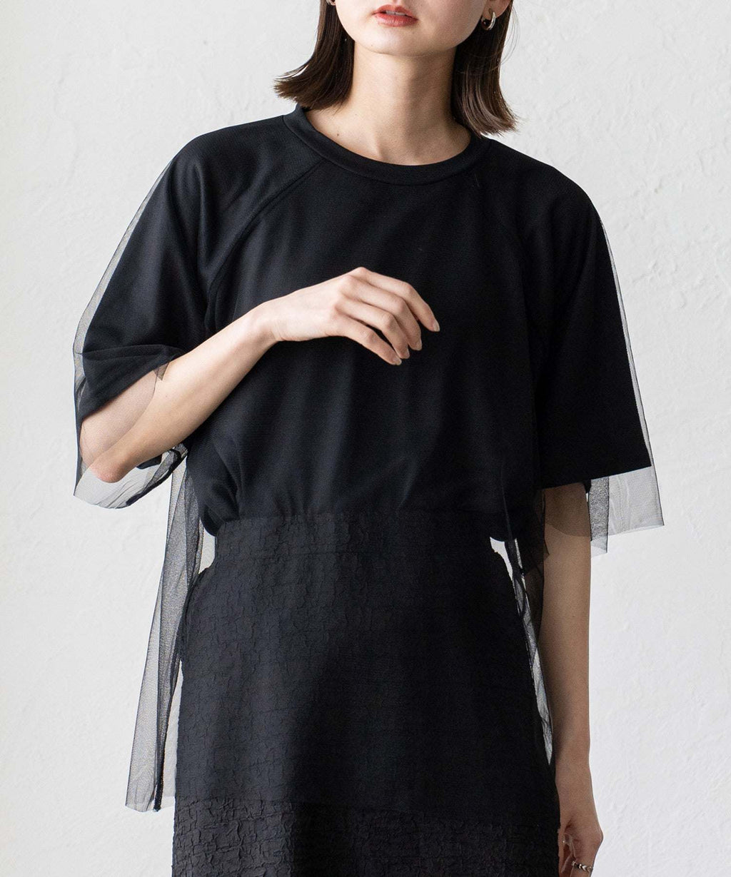 T恤上重疊了透視感的薄紗布料的層次上衣