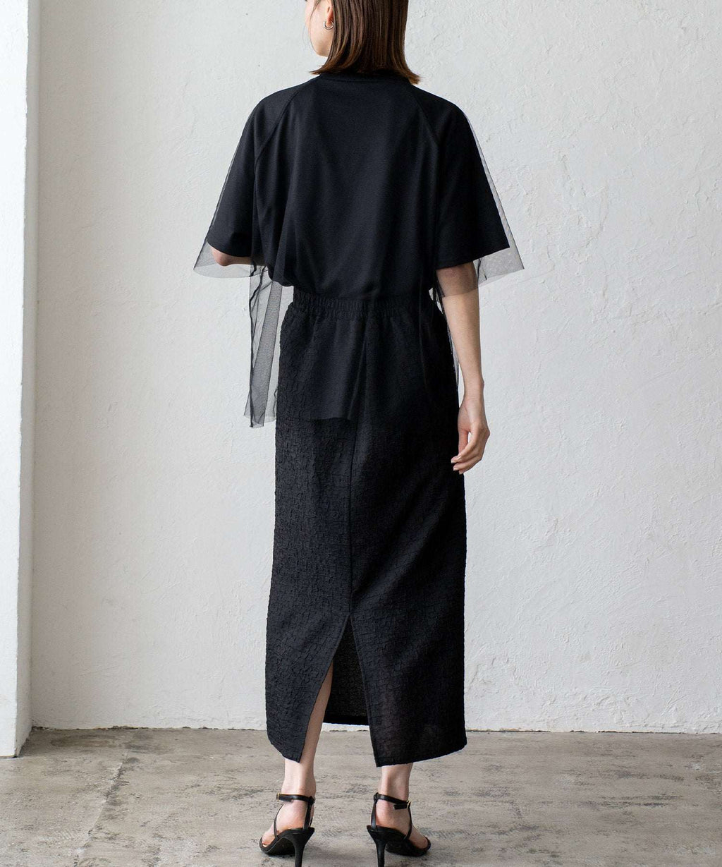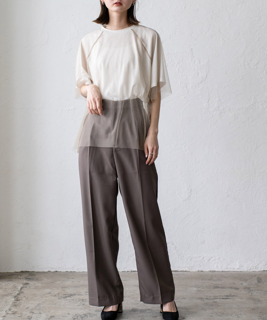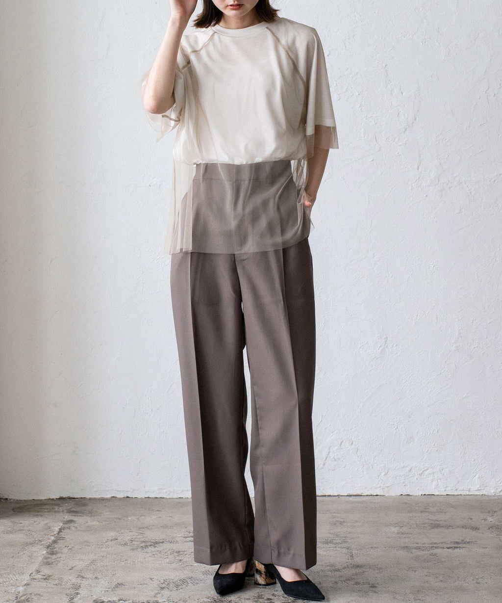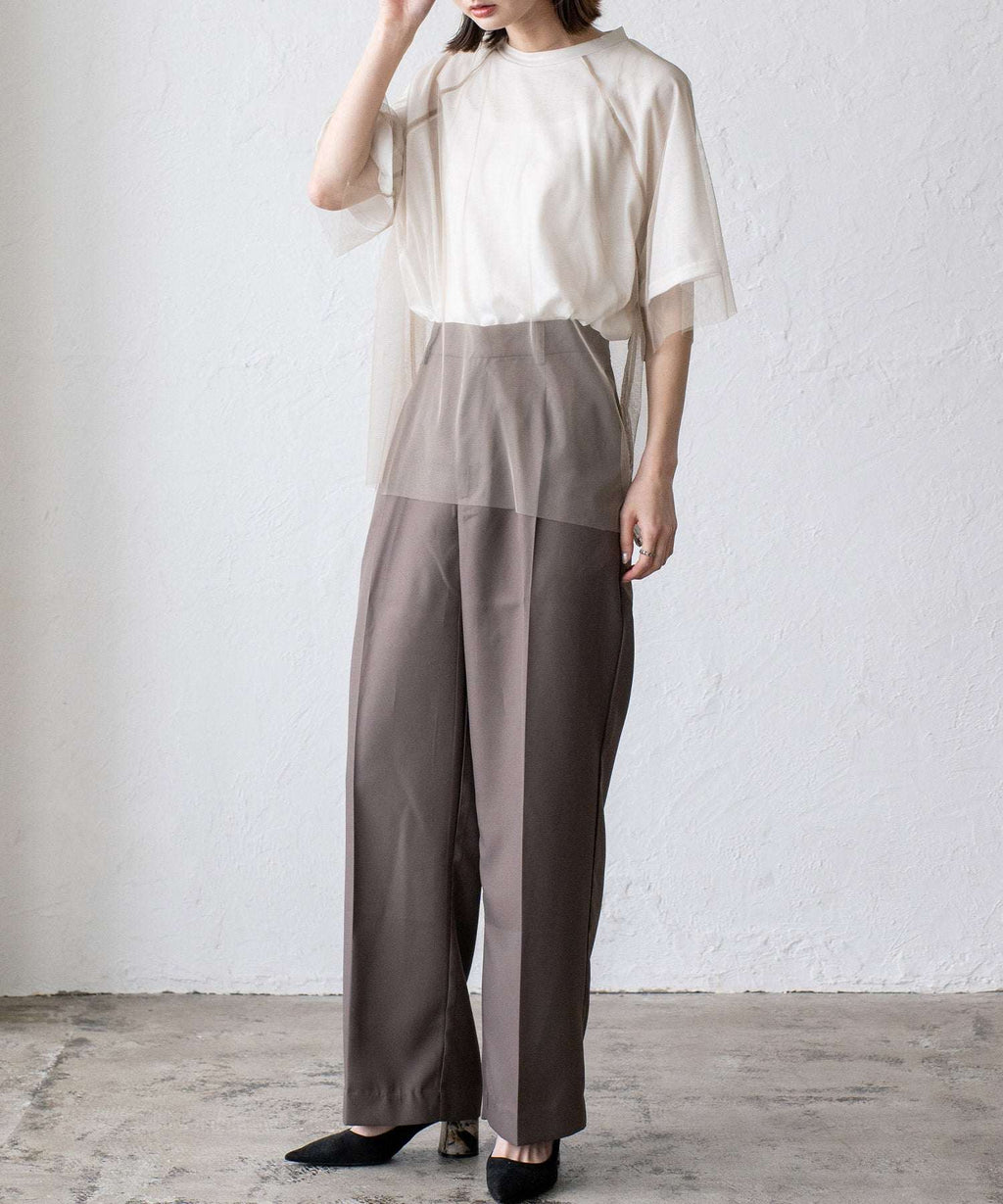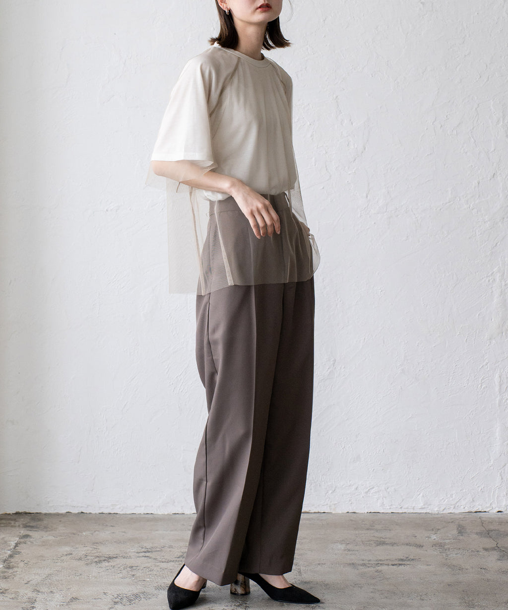T恤上重疊了透視感的薄紗布料的層次上衣