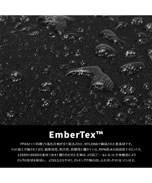 EmberTex 是一種由 NYLON6 構成的新材料,已完全去除 PFAS 這種有機氟化合物。它經過磨砂處理,具有優異的耐磨性、防污性和防塵性,是 99% 防水的高密度尼龍。1200D 和 600D 的材料(纖維)交織而成的布料,因其更高的丹尼爾結構,能保持包包的形狀,更容易自立,並且方便打包和物品的進出。