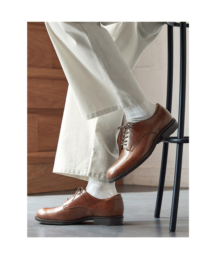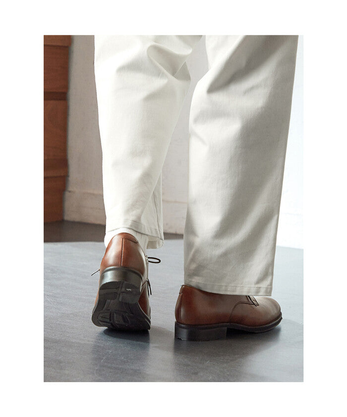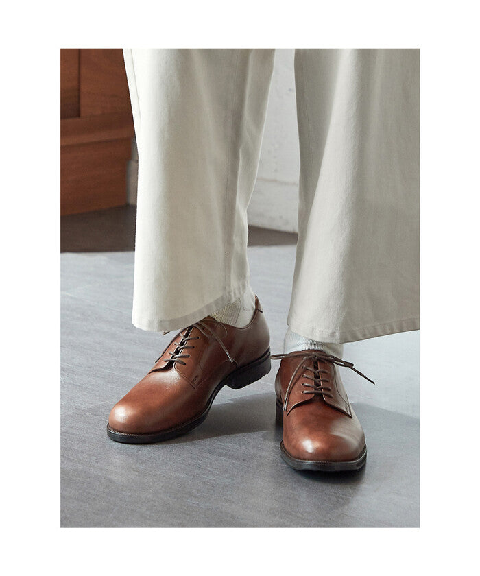 使用細緻柔軟的國產小牛皮作為鞋面,隨著穿著時間的推移可享受風格變化的外羽根平底商務鞋。已更新為可在正式與休閒場合穿著的輪廓。鞋墊使用運動鞋也常用的Ortholite,能夠貼合足部形狀,柔軟且具有優異的緩衝性。中底採用兼具緩衝性和反彈性的SPEVA,並在鞋跟部設置了衝擊緩衝功能GEL。中足部的樹脂部件可減少行走時的足部扭曲。外底鞋跟部採用耐磨性優異的AHAR橡膠。具有適合西裝及休閒服的高品質感,能夠應對各種場合的鞋款。可進行全底和鞋跟插頭的修理。為3E圓形鞋楦模型。