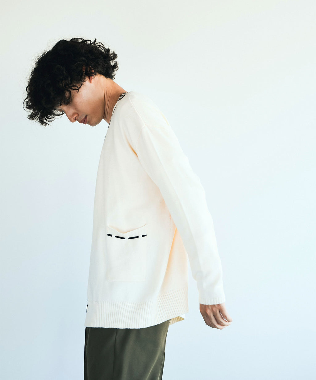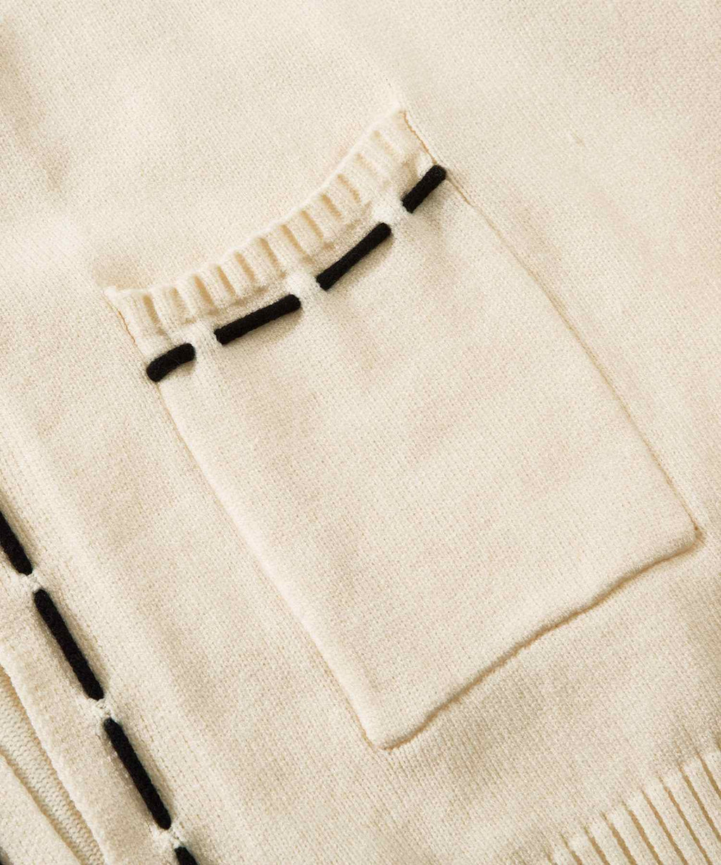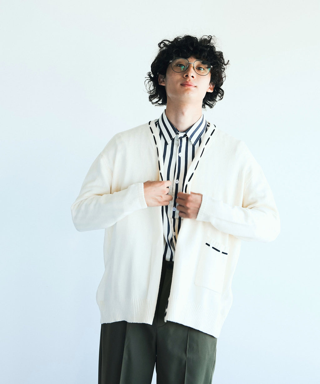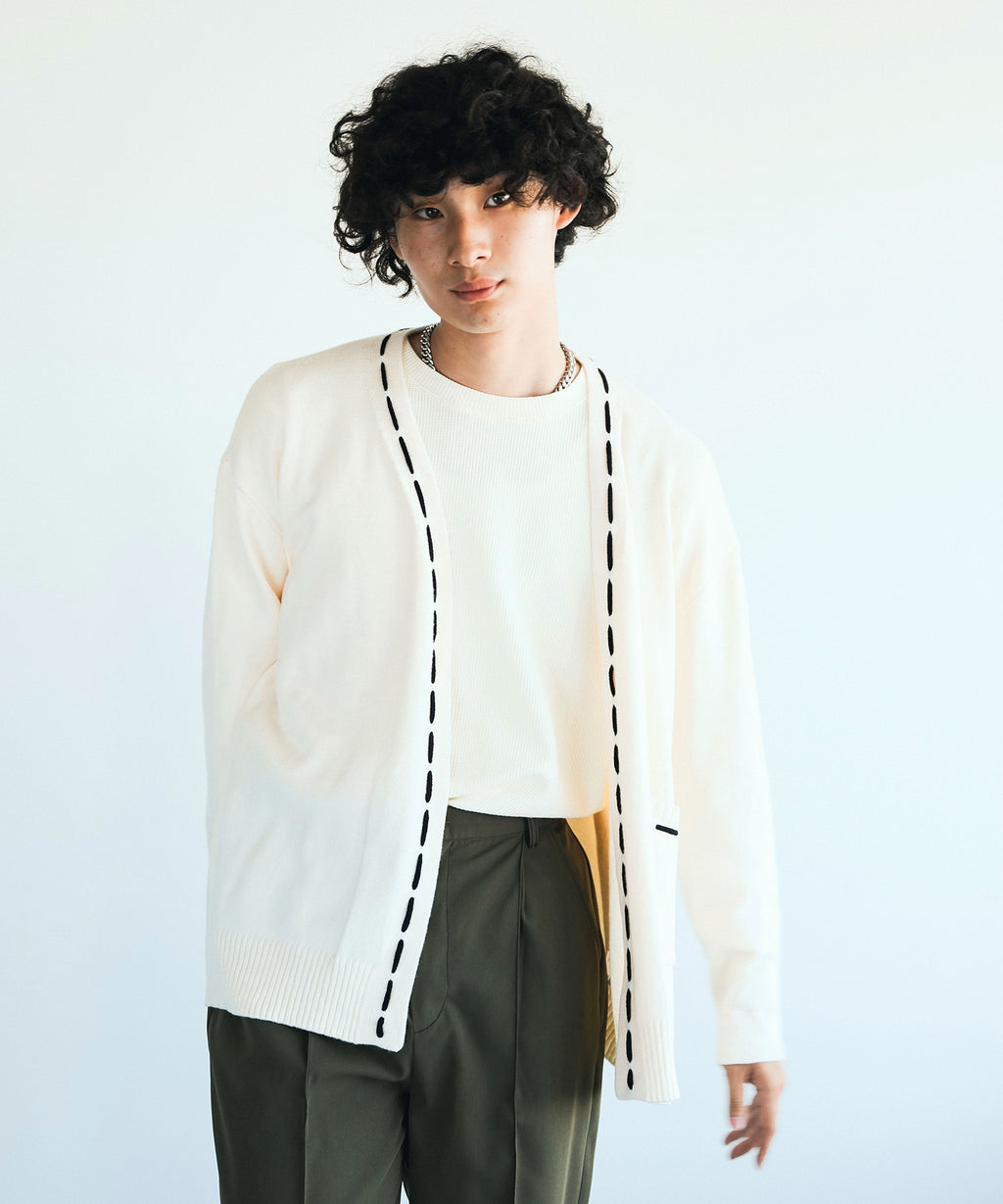 設計簡約卻透過織造繩針縫線的編織來展現獨特性的開襟毛衣。