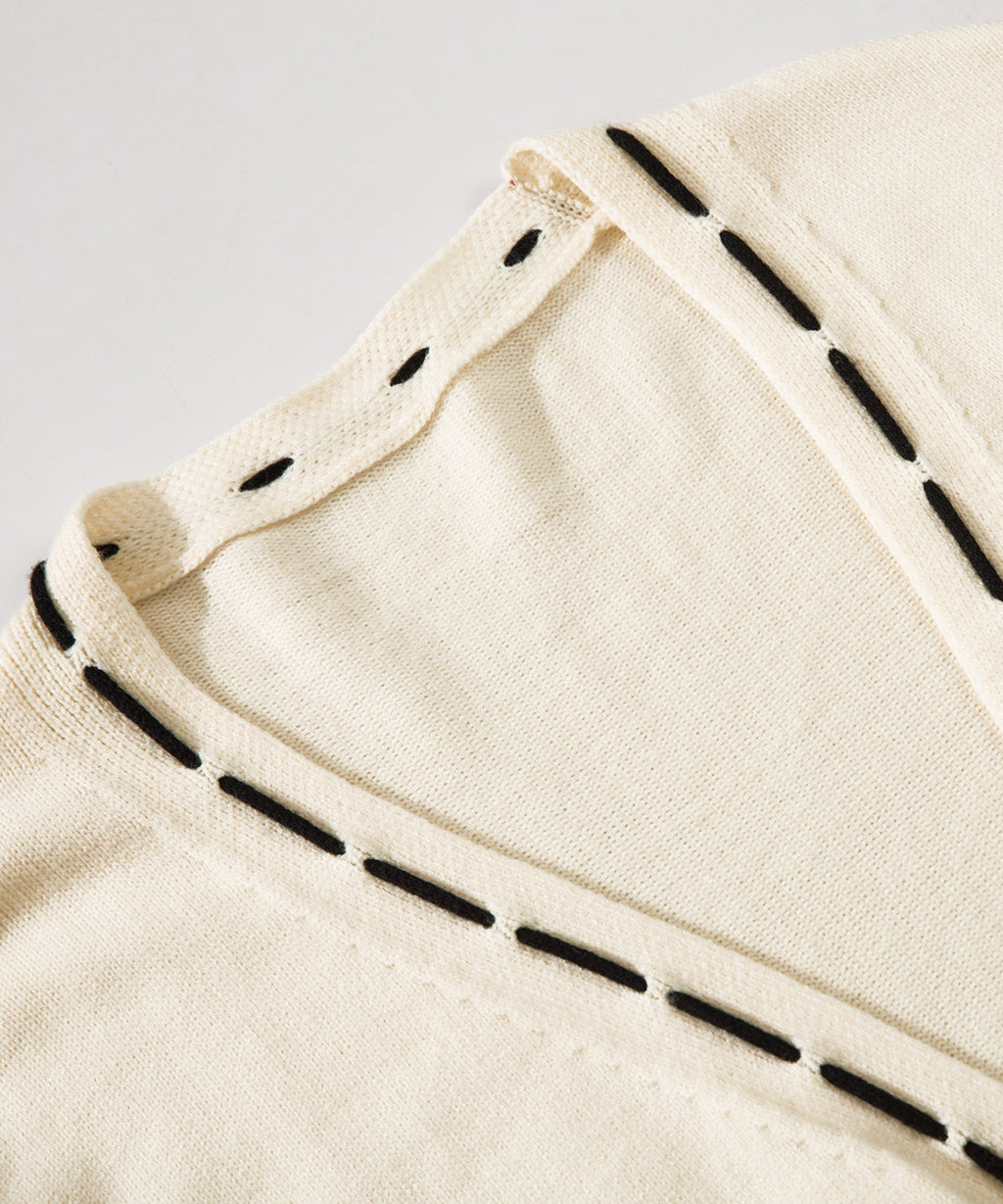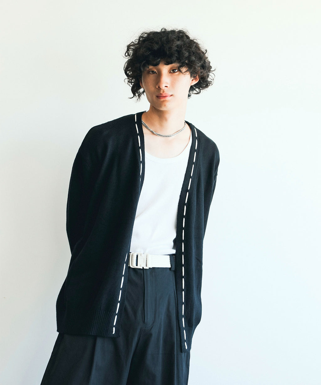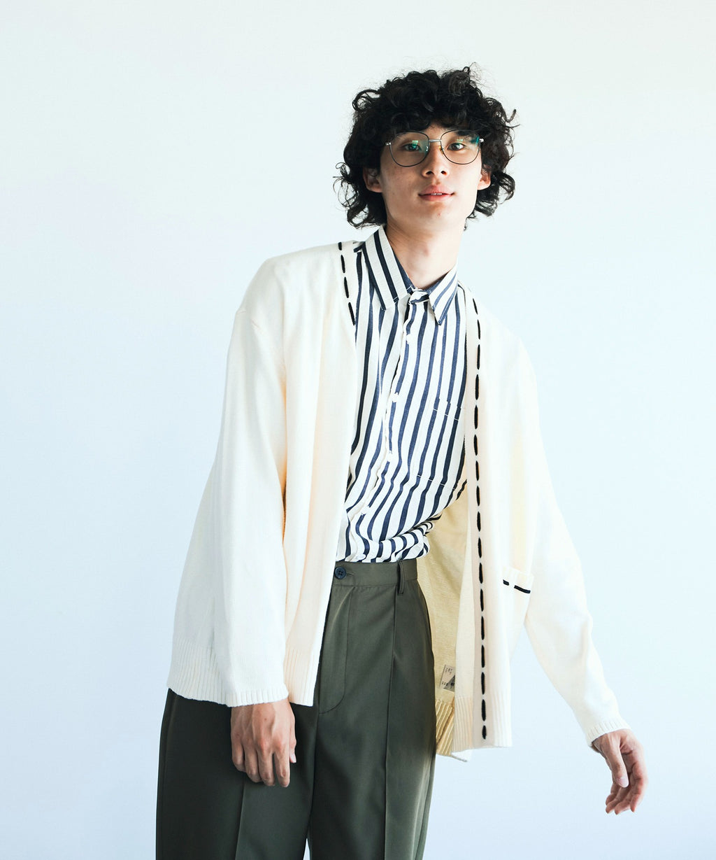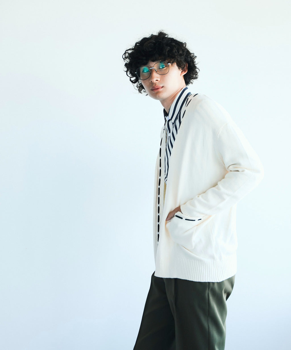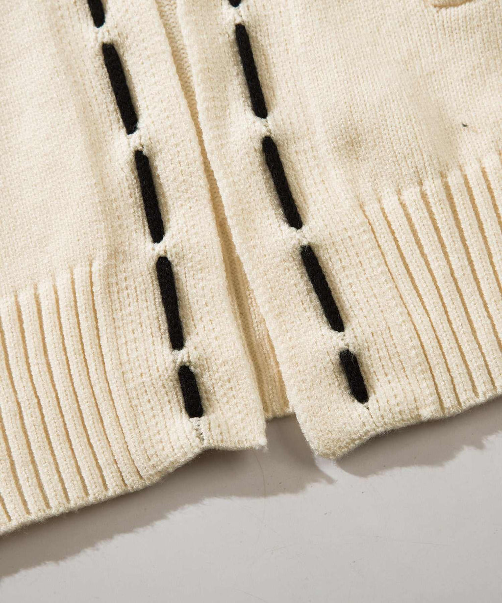 設計簡約卻透過織造繩針縫線的編織來展現獨特性的開襟毛衣。
