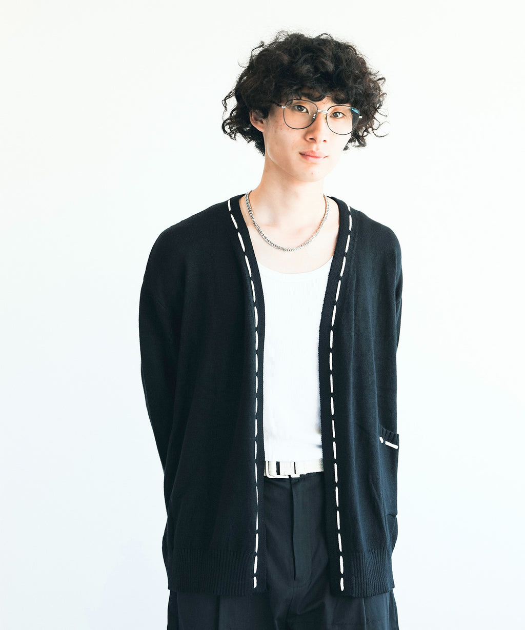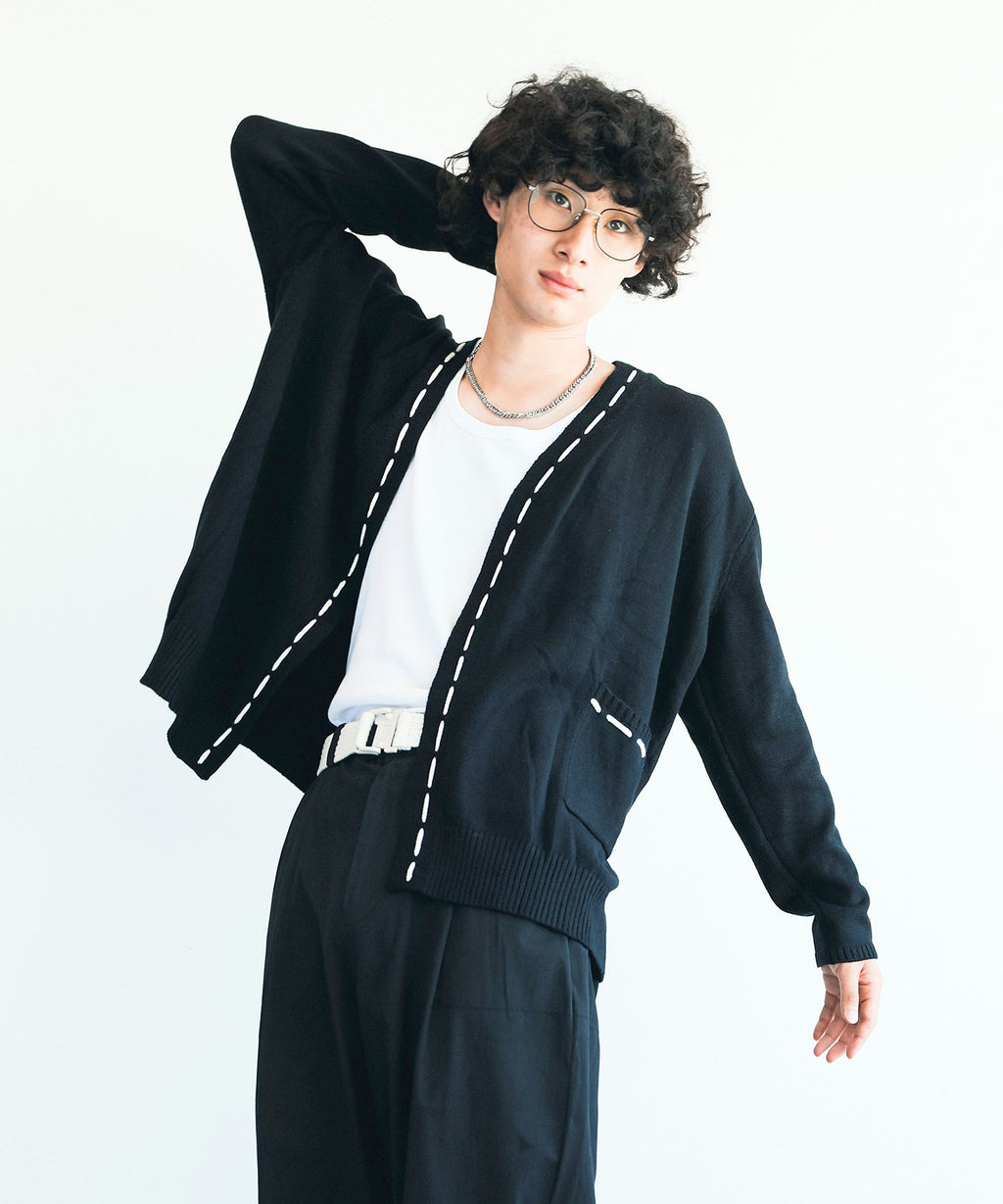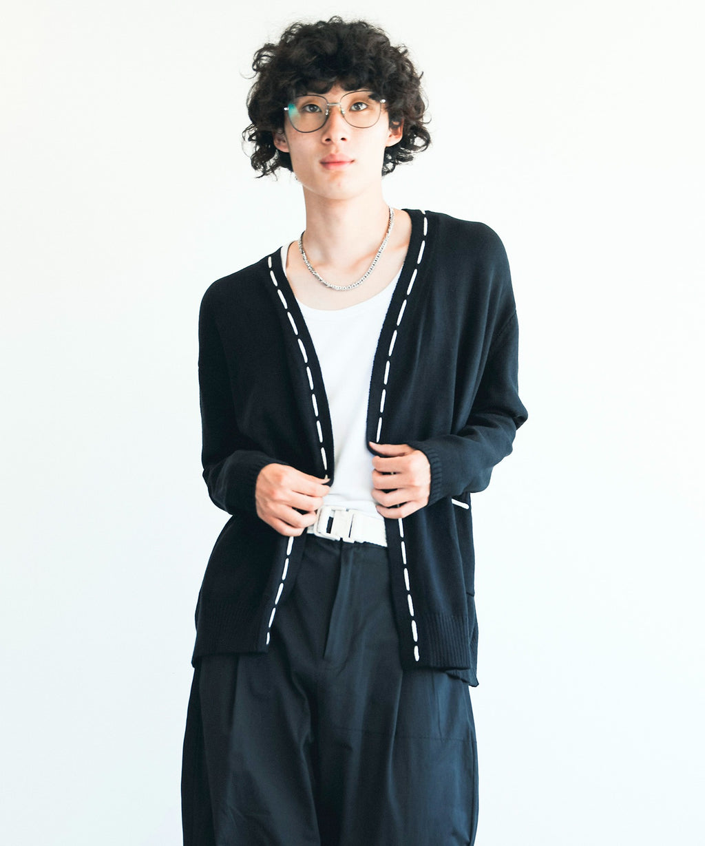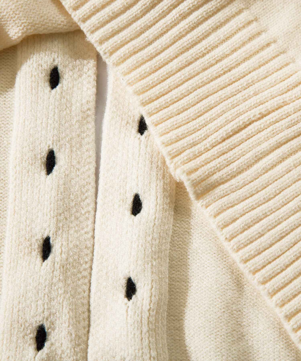 設計簡約卻透過織造繩針縫線的編織來展現獨特性的開襟毛衣。