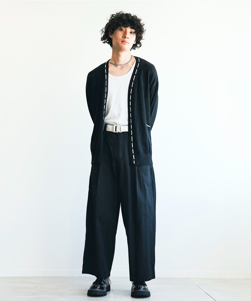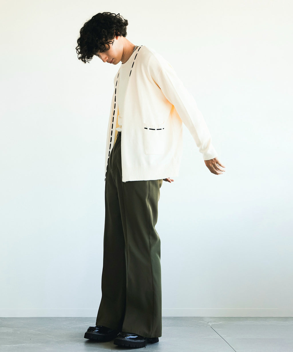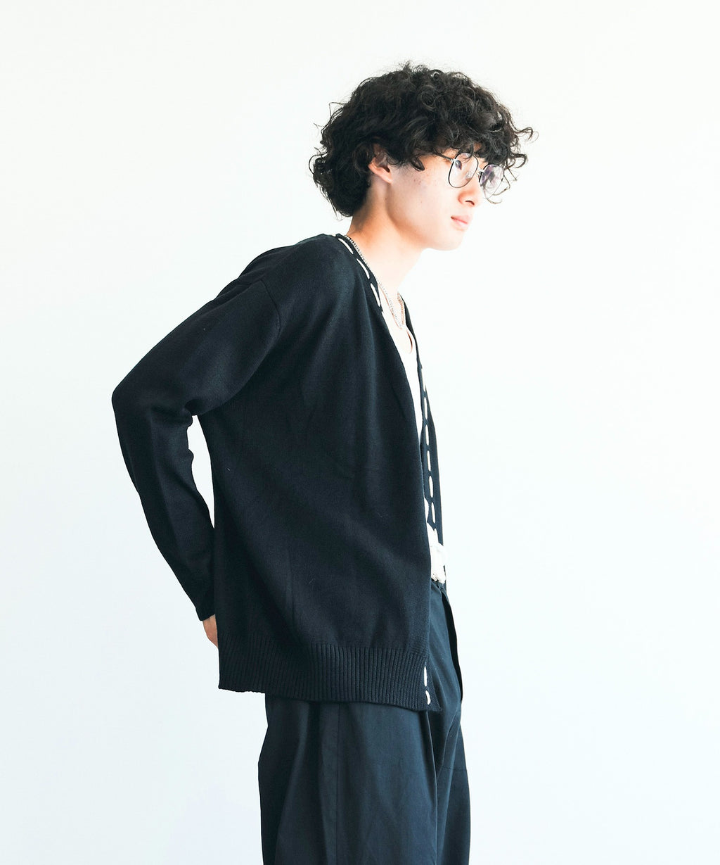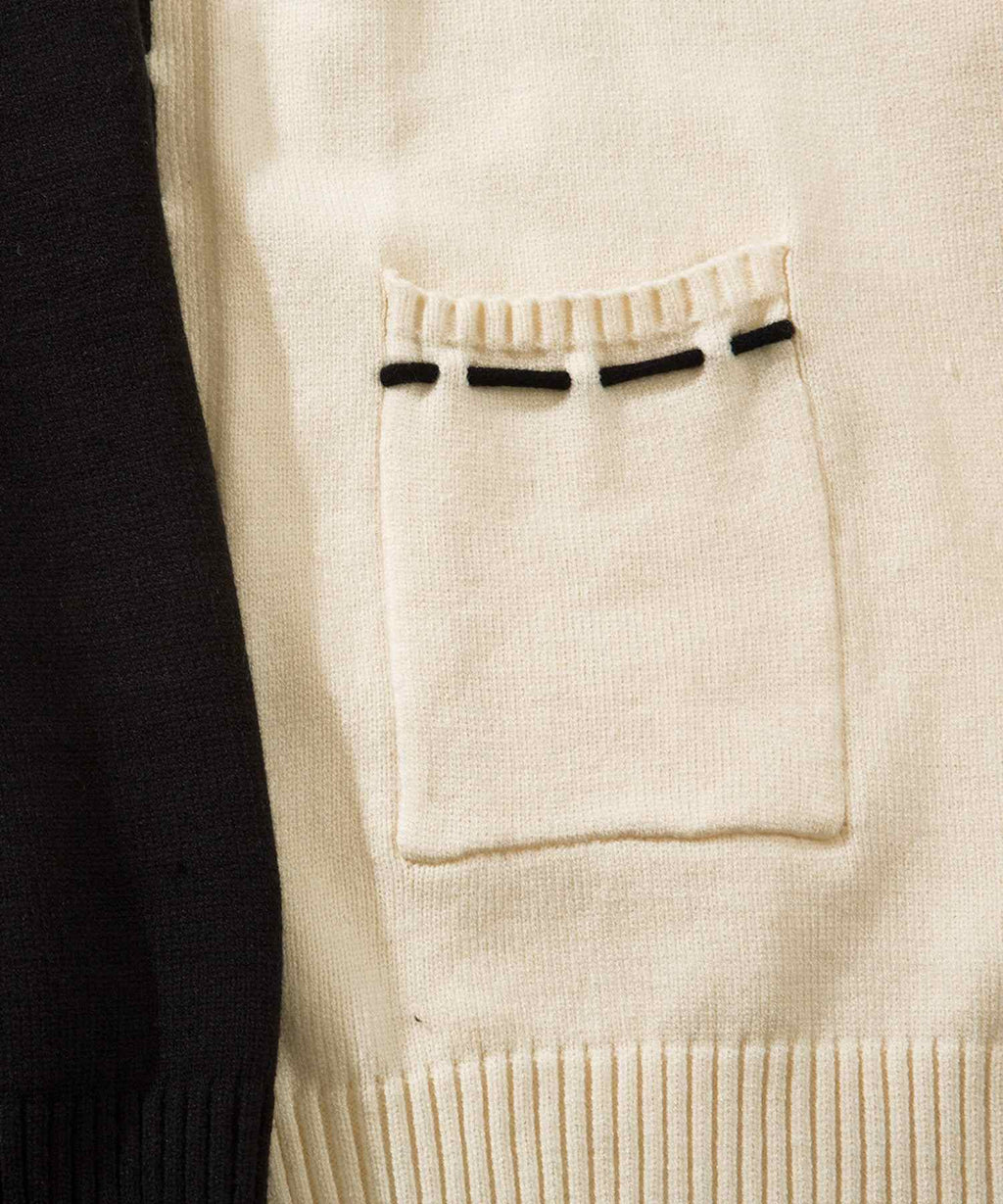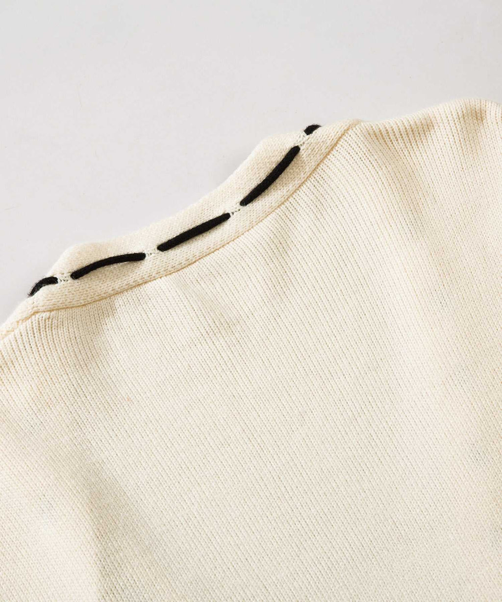 設計簡約卻透過織造繩針縫線的編織來展現獨特性的開襟毛衣。