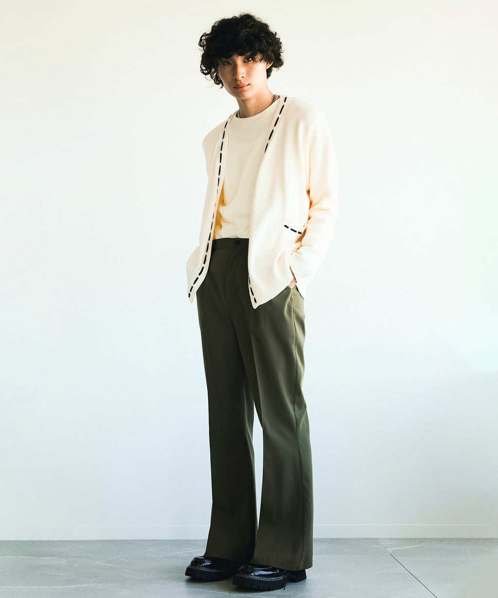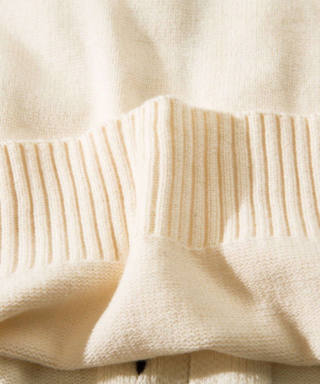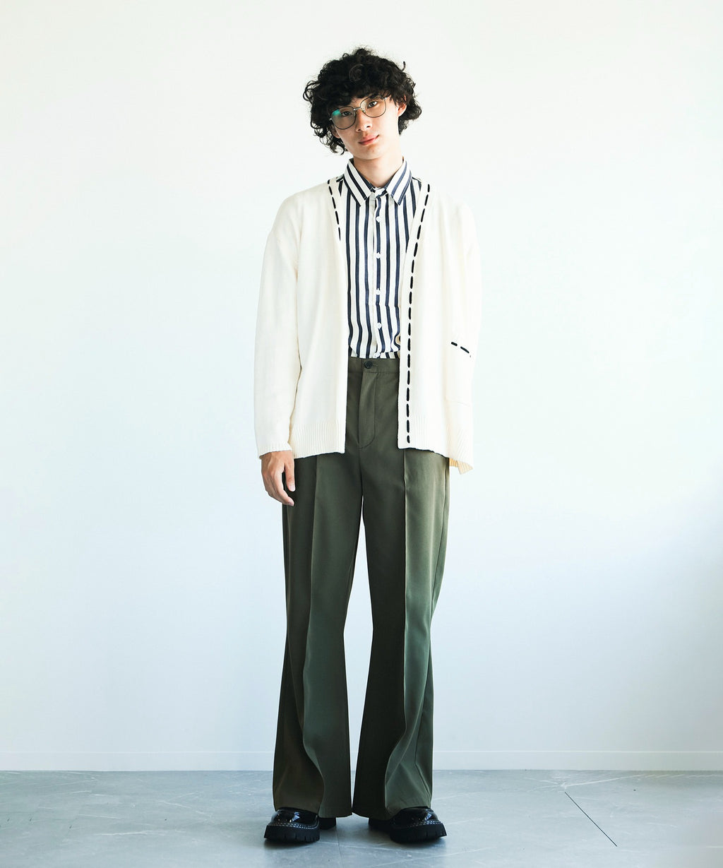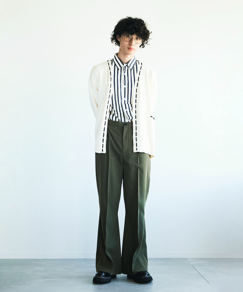 設計簡約卻透過織造繩針縫線的編織來展現獨特性的開襟毛衣。