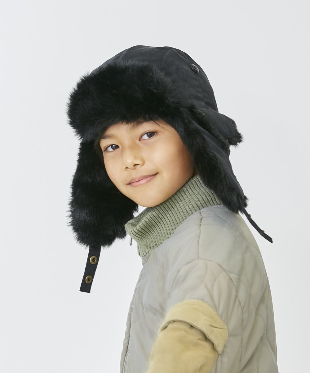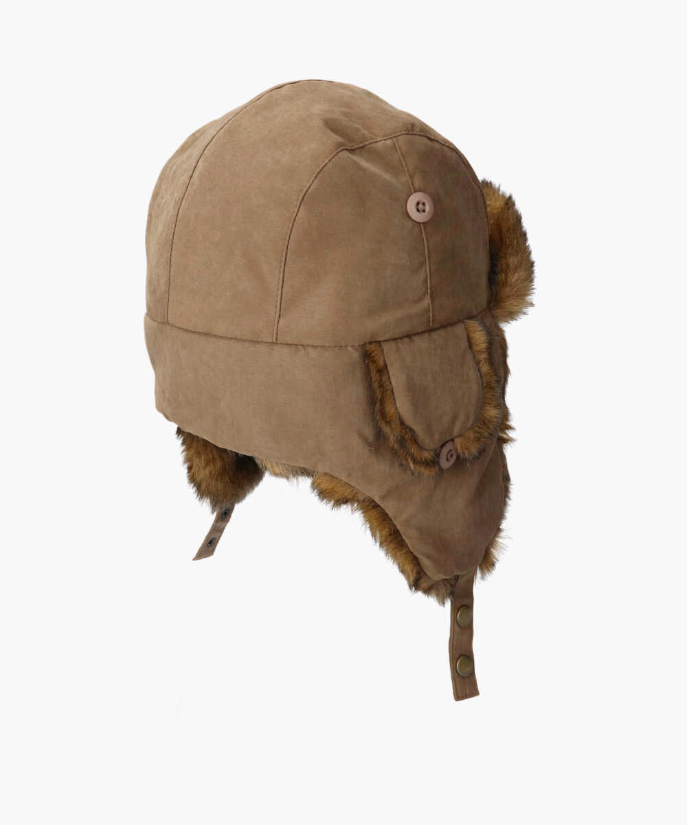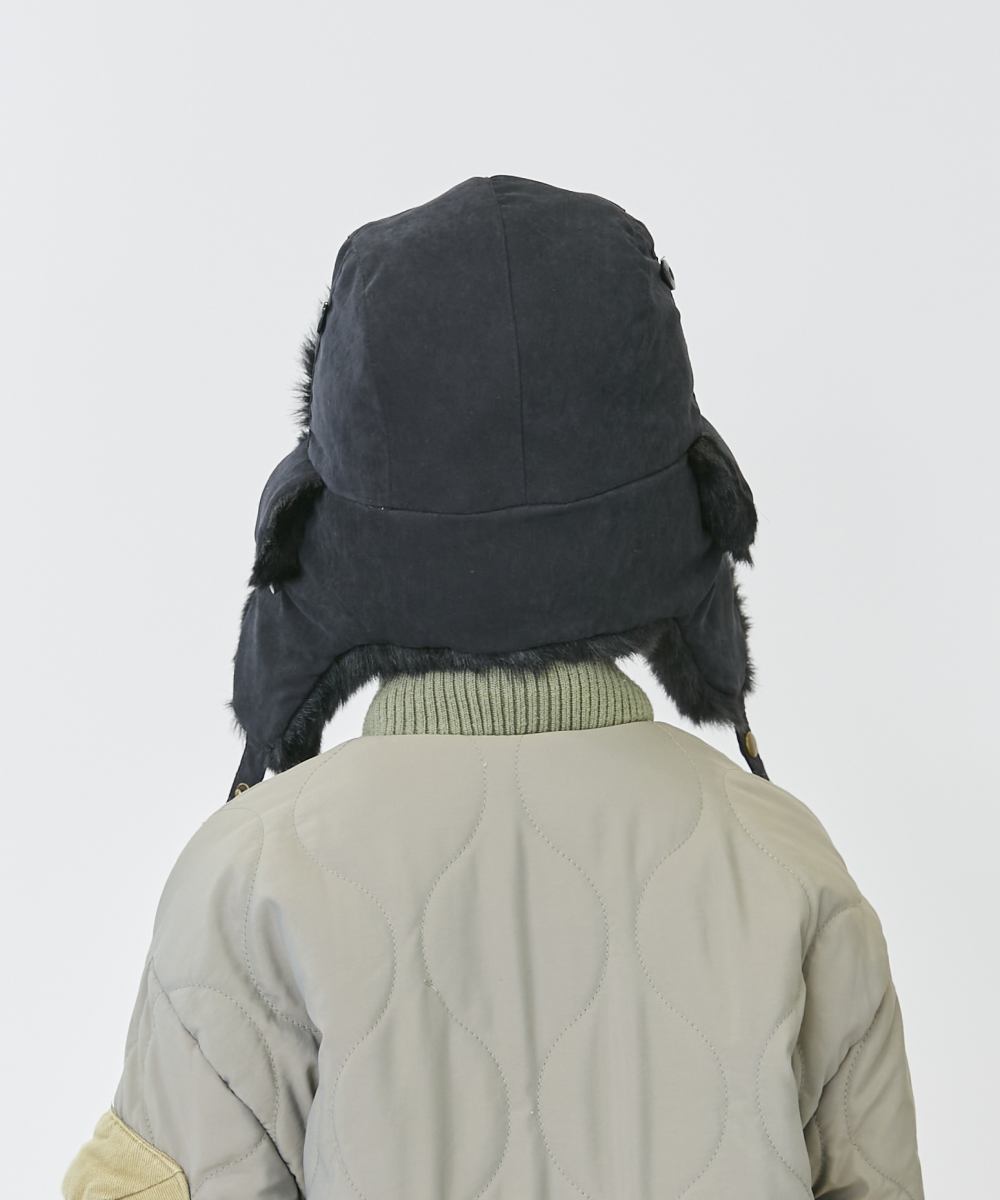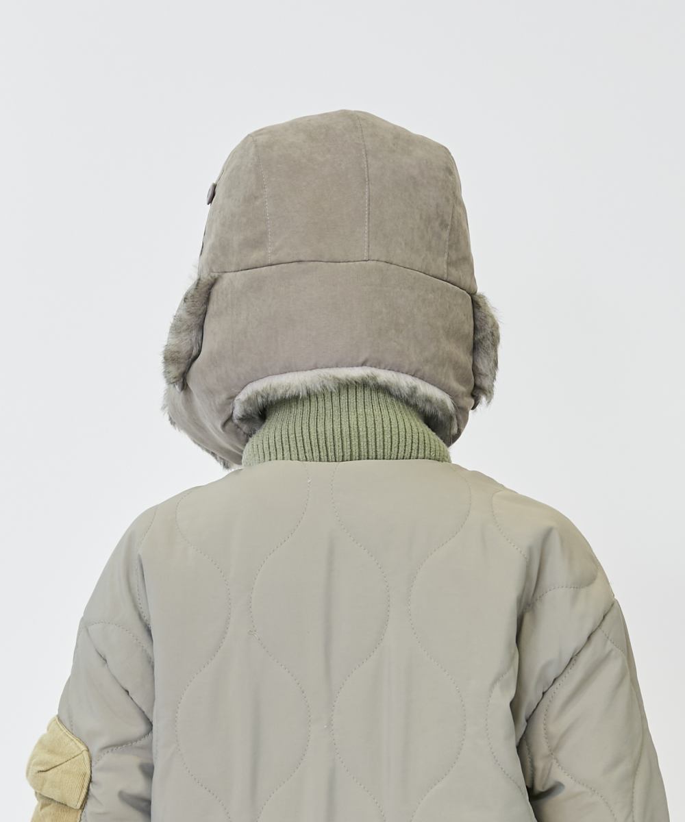 裏面採用絎縫加工。透過解開按扣並放下耳罩來穿著,可以有效保暖。也推薦在戶外或觀賞體育賽事時穿著。